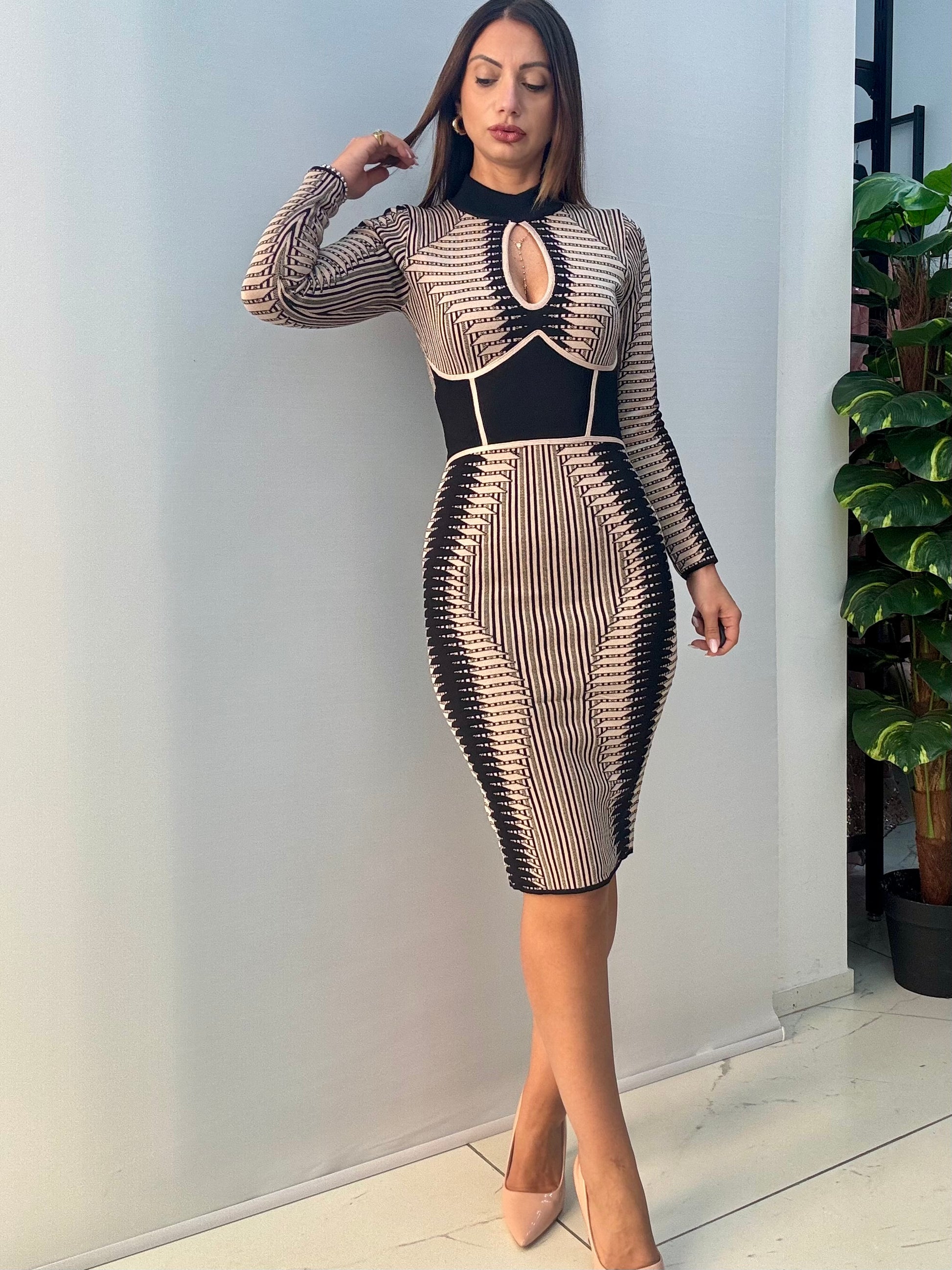 Abito fantasia in filo strutturato effetto bandage, con scollo a goccia sul davanti, elasticizzato, taglia unica, consigliamo fino 44