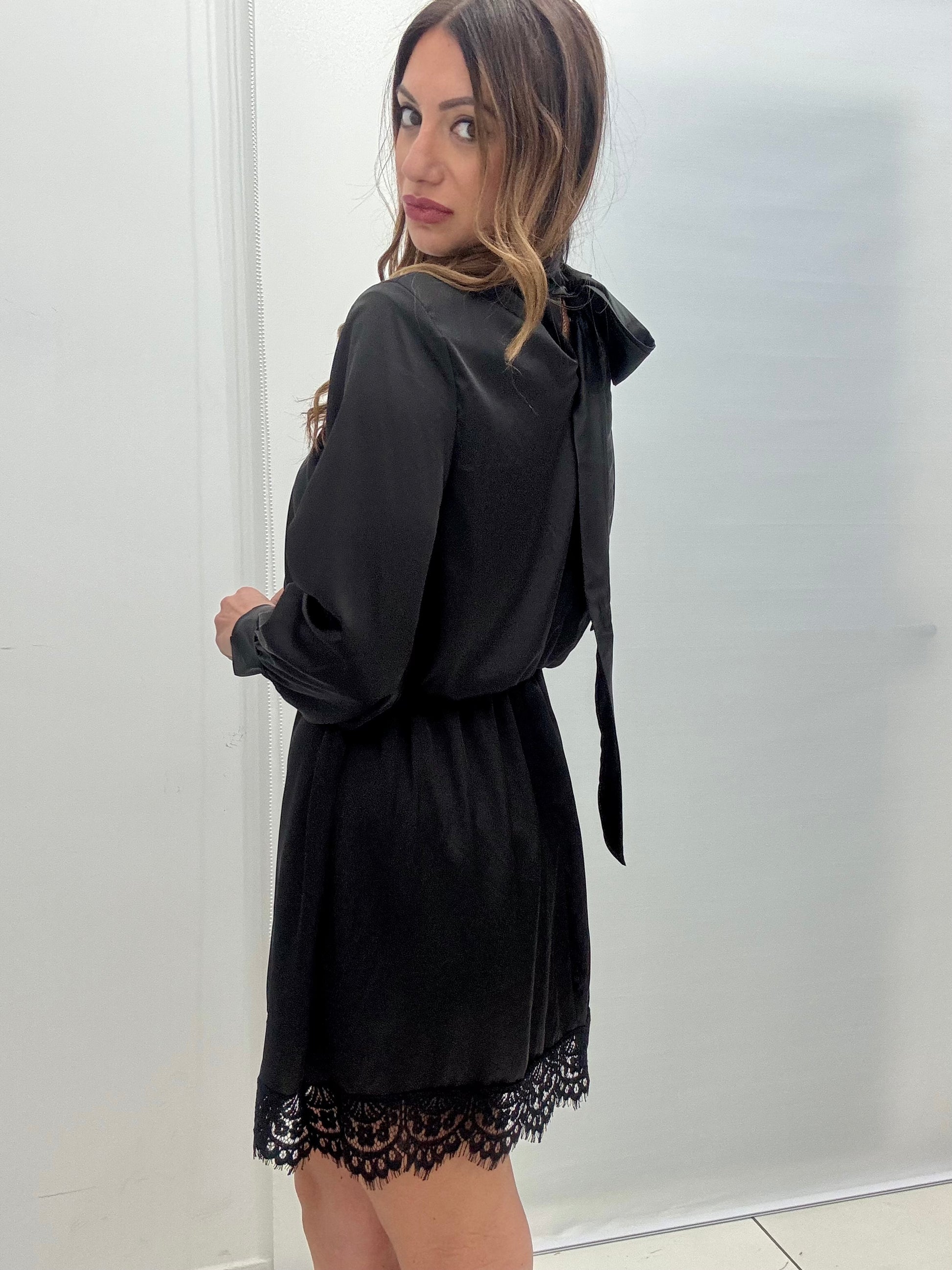 Abito effetto seta con elastico nel giro vita e fiocco dietro al collo che scende lungo la schiena. Termina con un inserto in pizzo. Taglia unica, consigliamo fino a taglia L.