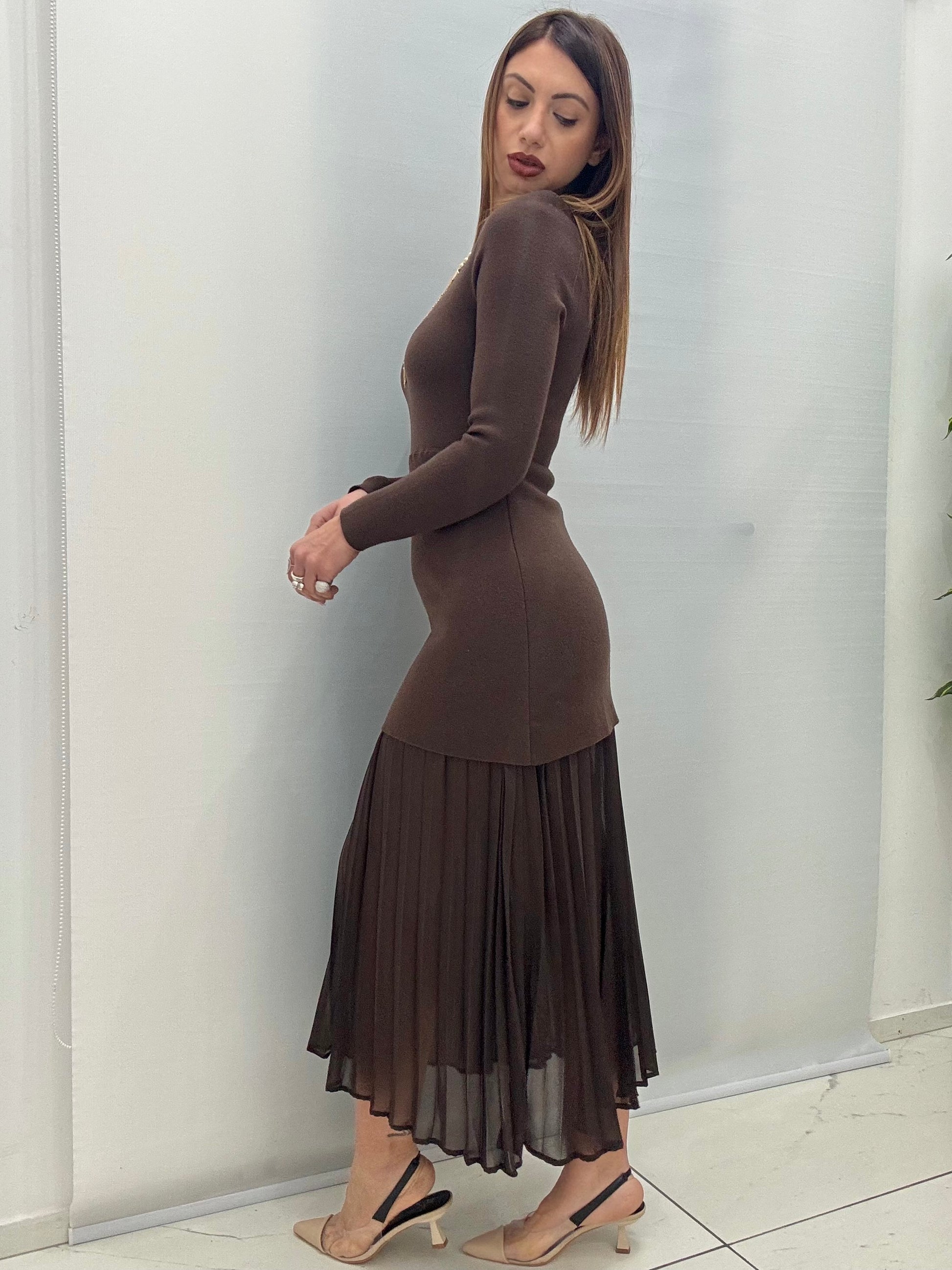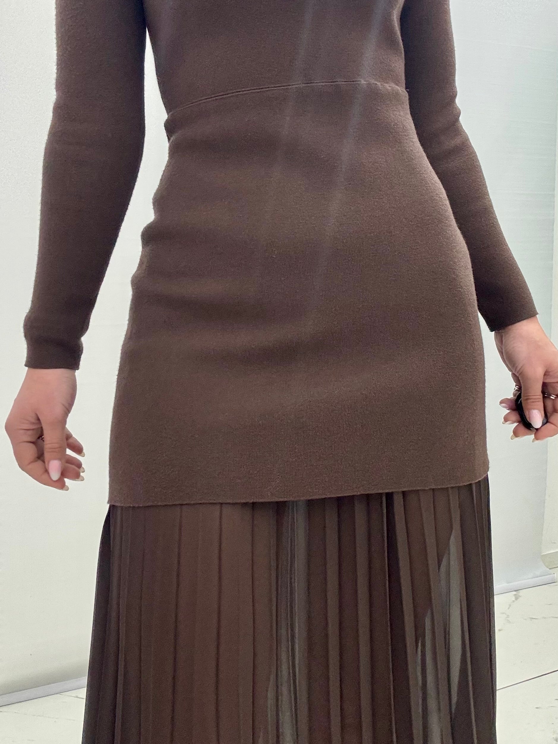 Abito in lana rasata sul sopra e velato plissé nella parte inferiore. Sembra due pezzi ma è tutto un corpo. Disponibile in taglia SM ed ML.