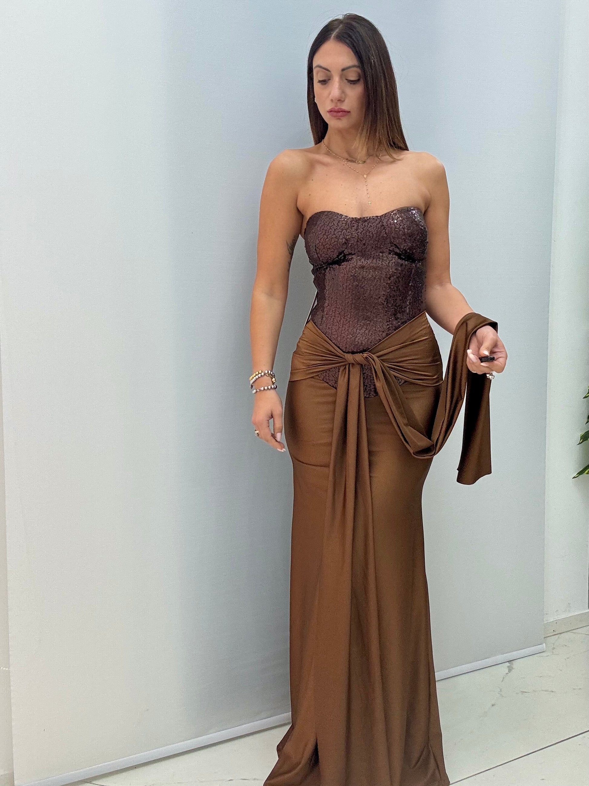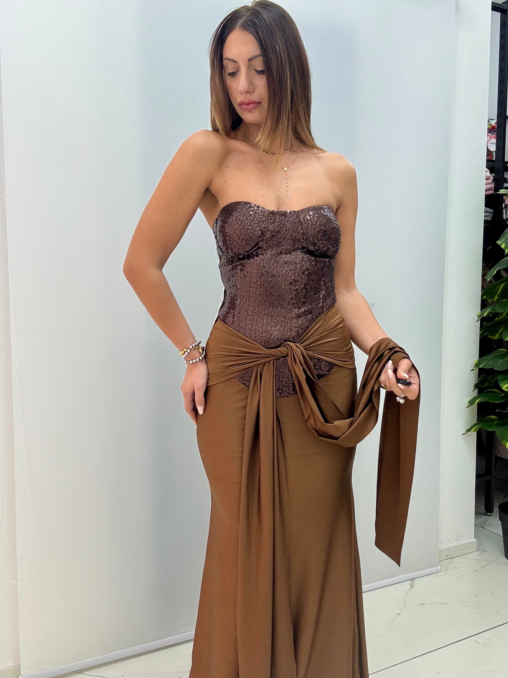 Abiti in lycra con corpetto steccato, paillettati, scollo a cuore, coppe preformate, fusciacca regolabile sul davanti. Taglia unica, consigliamo fino a taglia L.