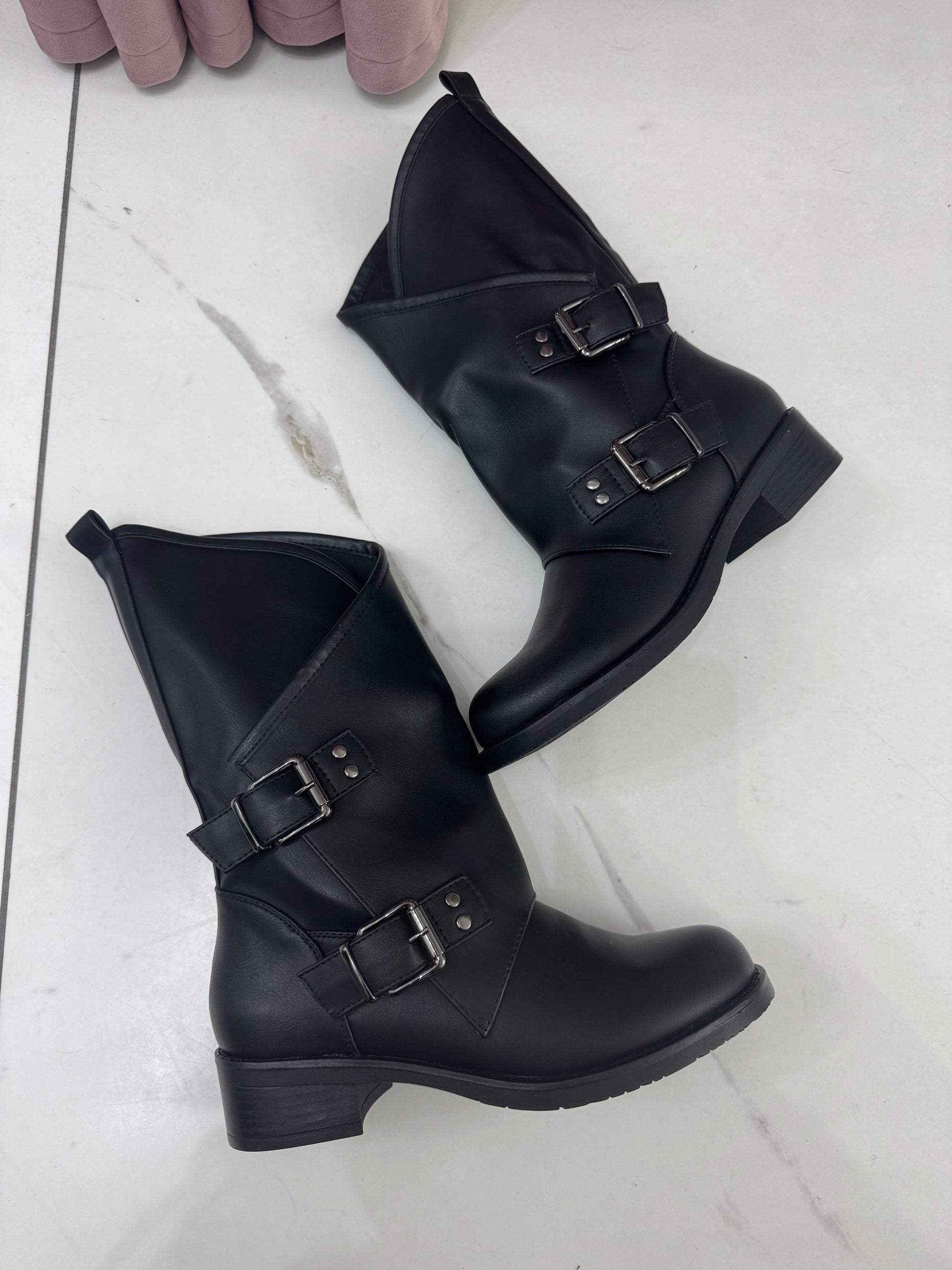 Bikers in ecopelle con fibie esterne e mezza zip interna per poterli calzare con facilità. Disponibili dal 37 al 41, calzata regolare.