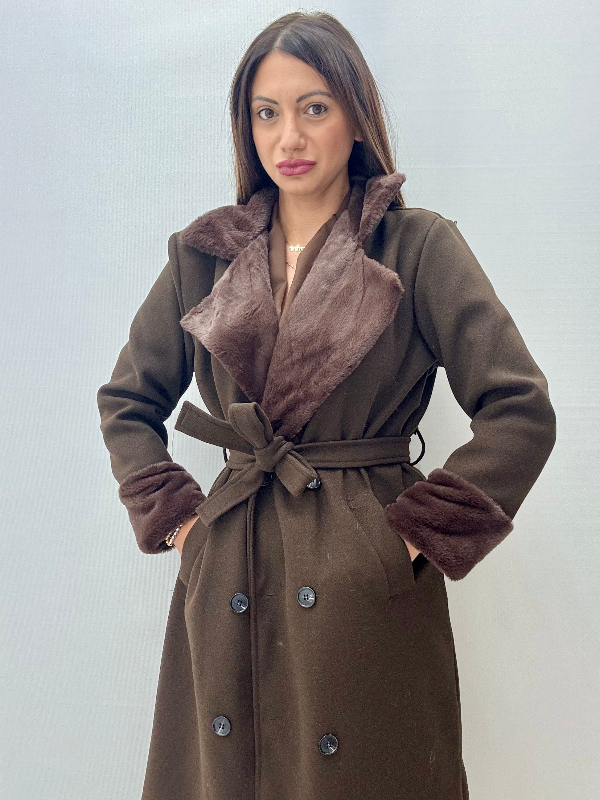 Cappotto in panno, foderato, con abbottonatura doppio petto, collo e polsi in ecopelliccia. Taglia unica, consigliamo fino a taglia L.