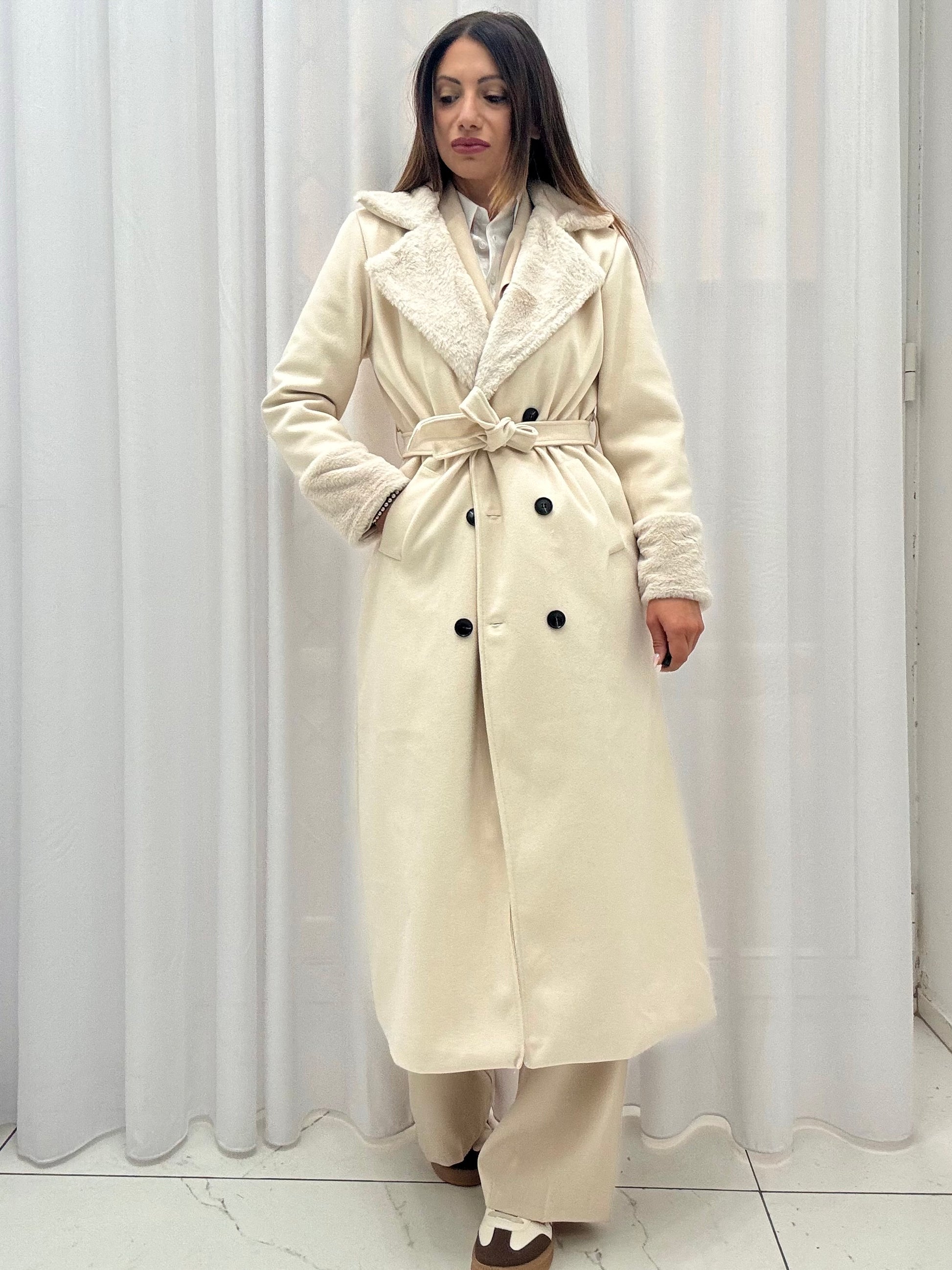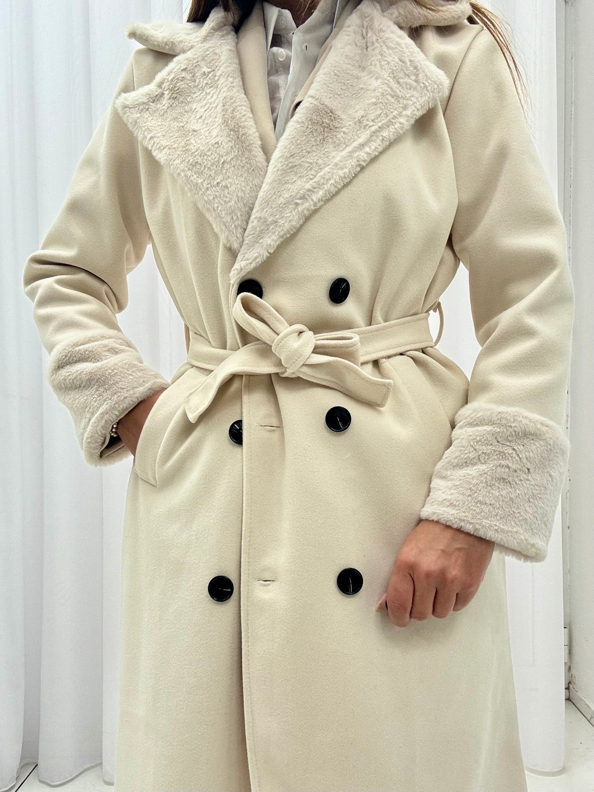 Cappotto in panno, foderato, con abbottonatura doppio petto, collo e polsi in ecopelliccia. Taglia unica, consigliamo fino a taglia L.