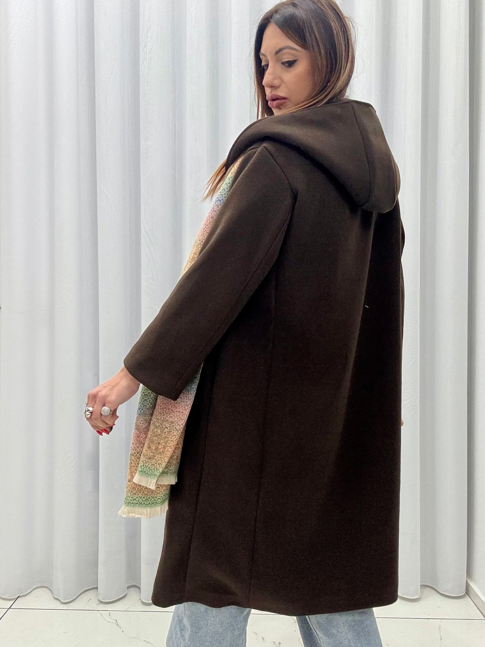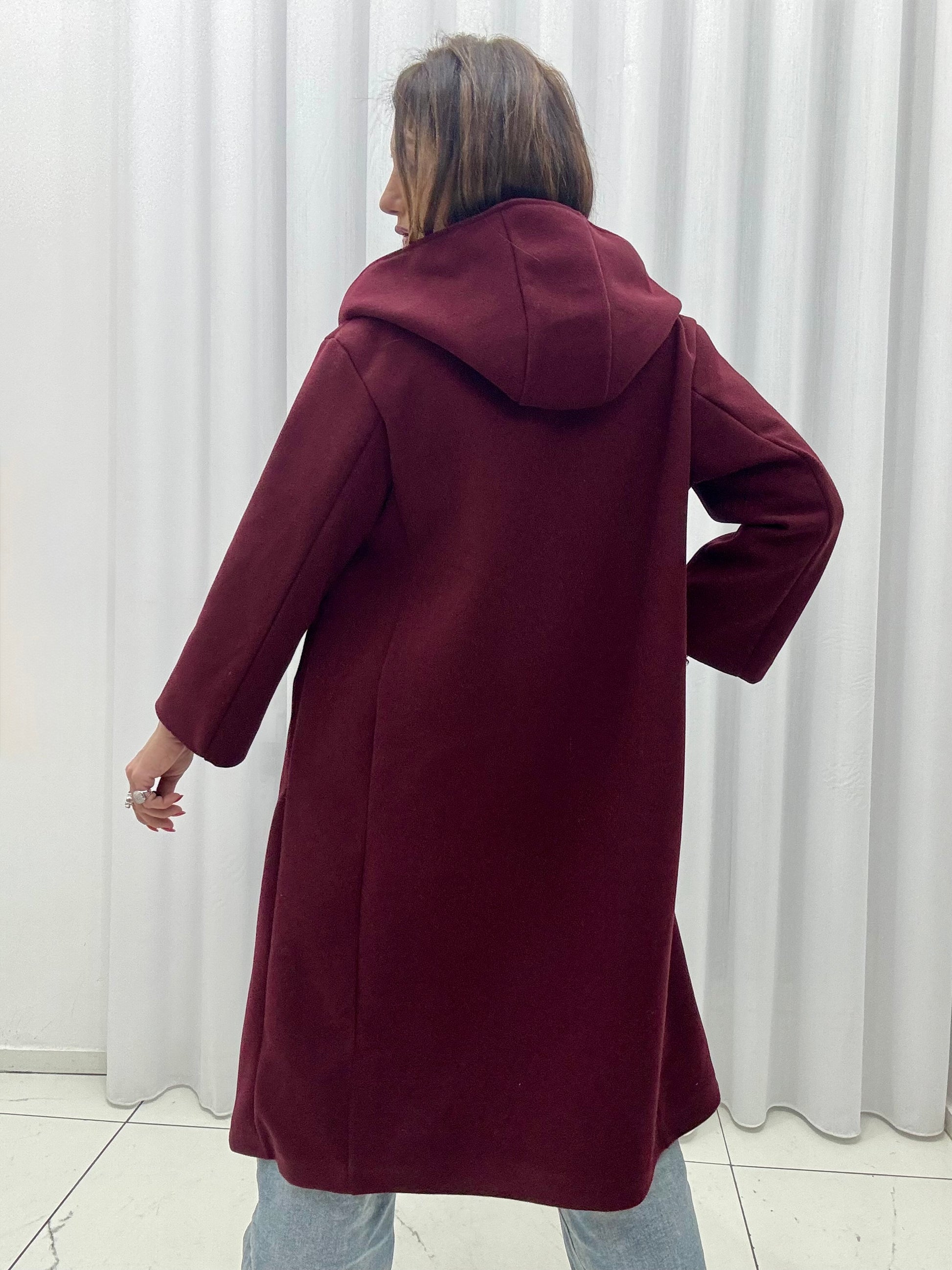 Cappotto in panno con chiusura doppio petto, cappuccio non rimovibile, foderato internamente, tasche a filo lateralmente. Taglia unica, consigliato fino a taglia 44. Sciarpa inclusa.