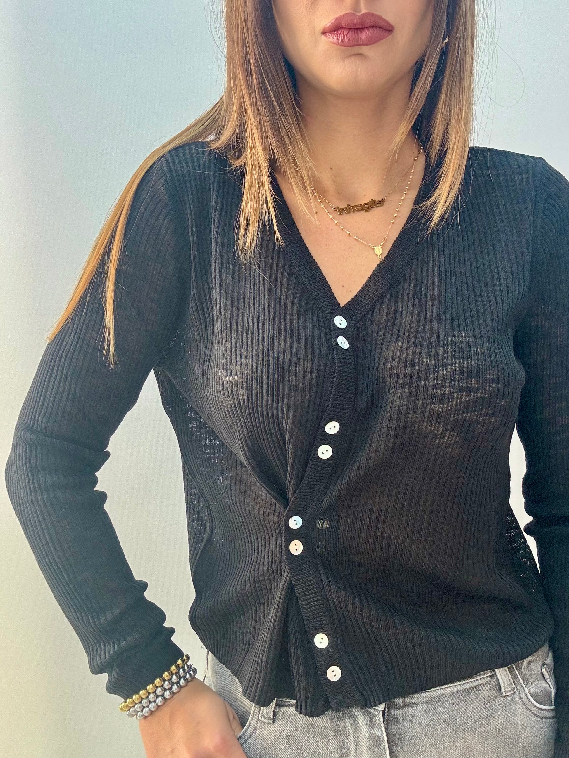 Cardigan in filo con abbottonatura asimmetrica, presenta la doppia abbottonatura che consente di poterlo indossare anche in maniera classica. Taglia unica, consigliamo fino a taglia L.