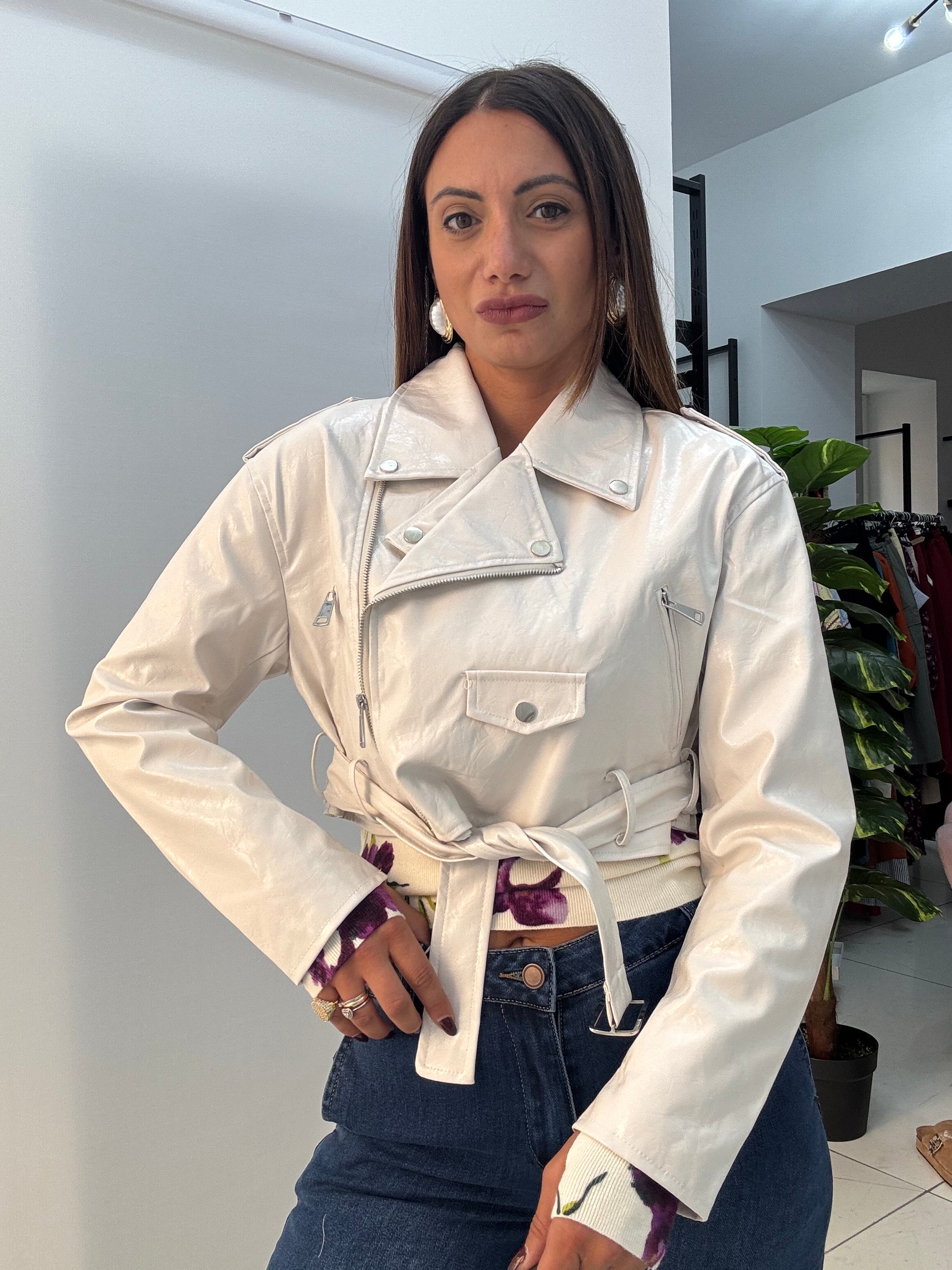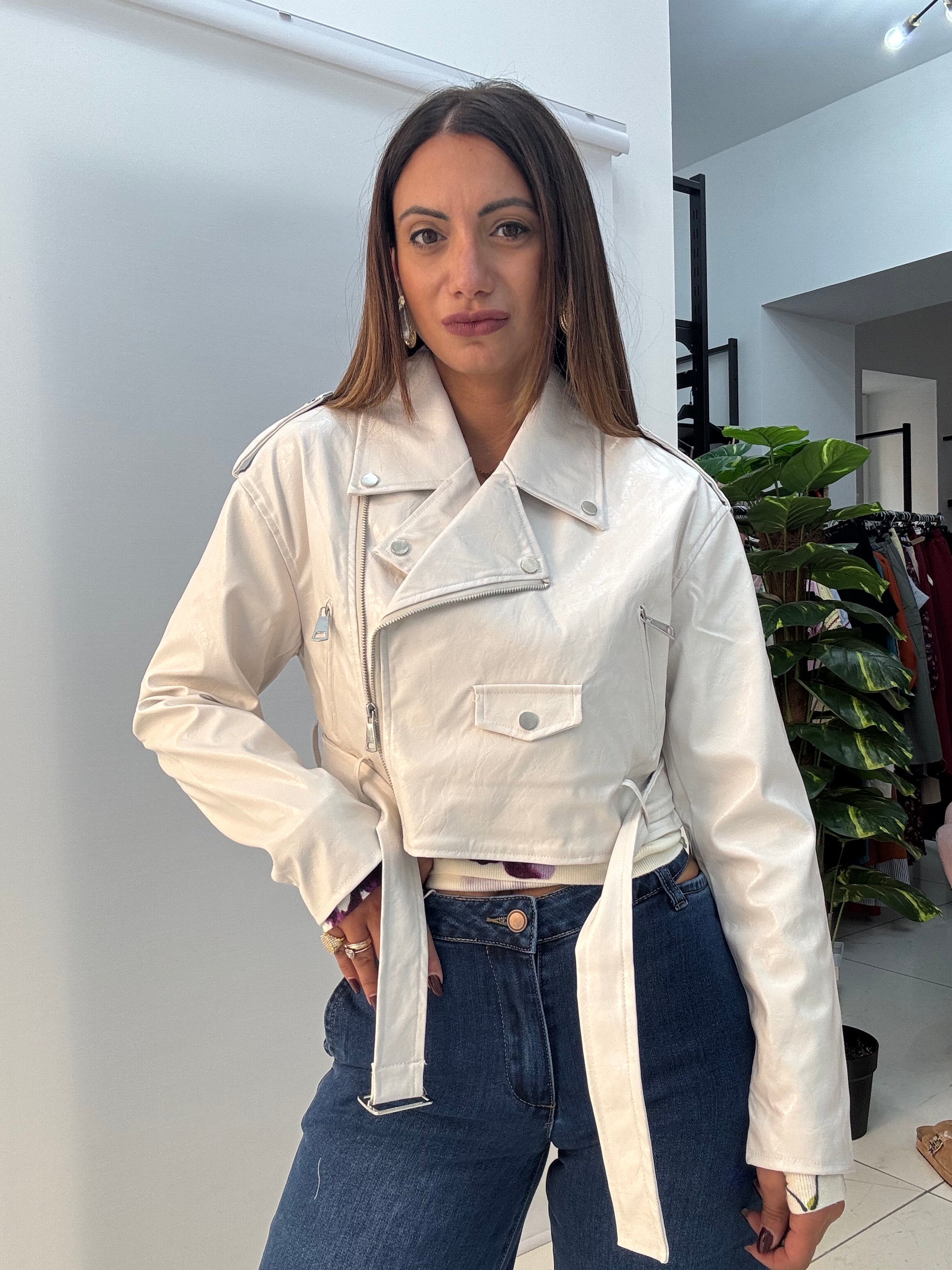 Chiodo in ecopelle, vestibilità morbida. Disponibile in taglia SM ed LXL.