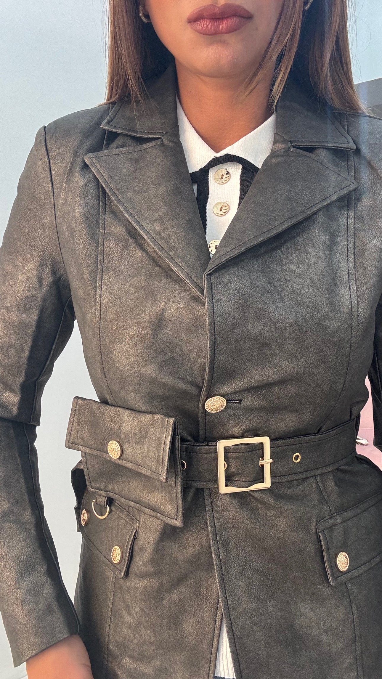 Giacca in ecopelle con cintura con marsupio rimovibile. Foderata, vestibilità regolare. Articolo disponibile da taglia S ad XL
