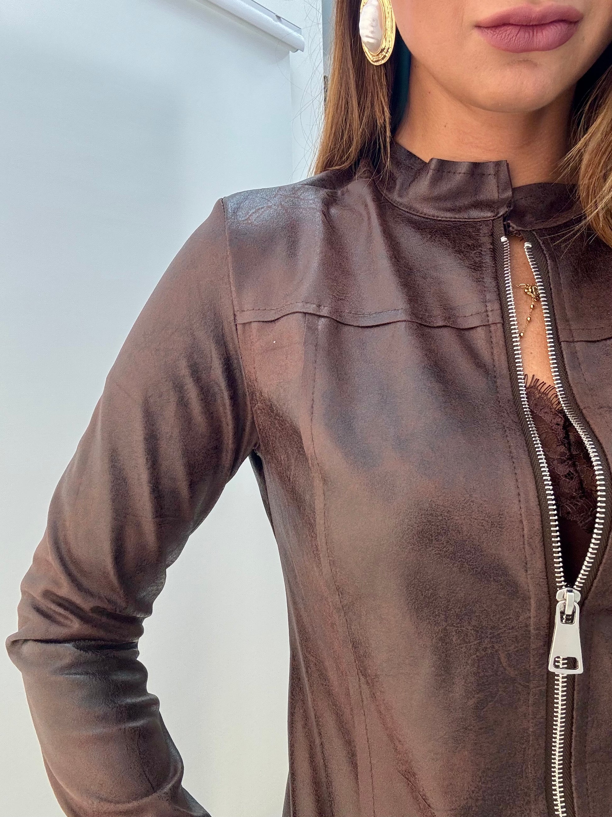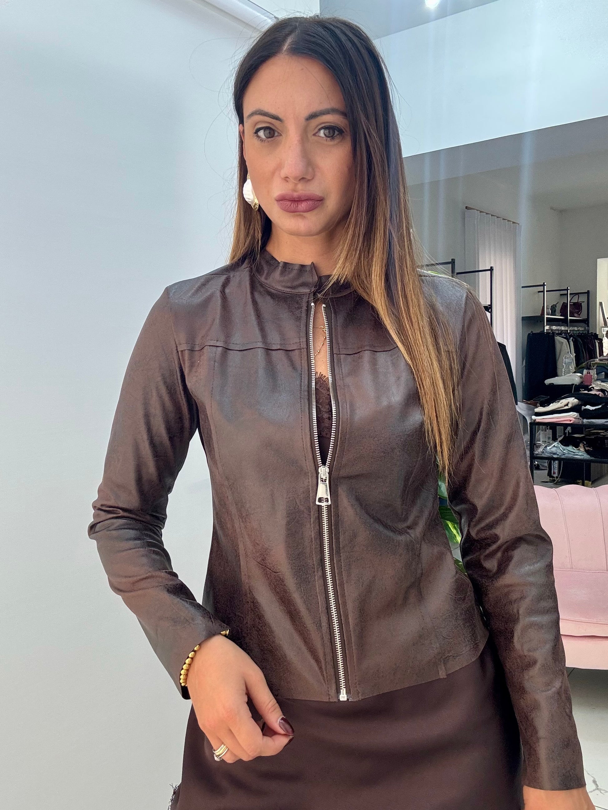 Giacca effetto vintage, morbidissima, collo alla coreana, zip sul davanti. Disponibile da S ad XL, vestibilità regolare.