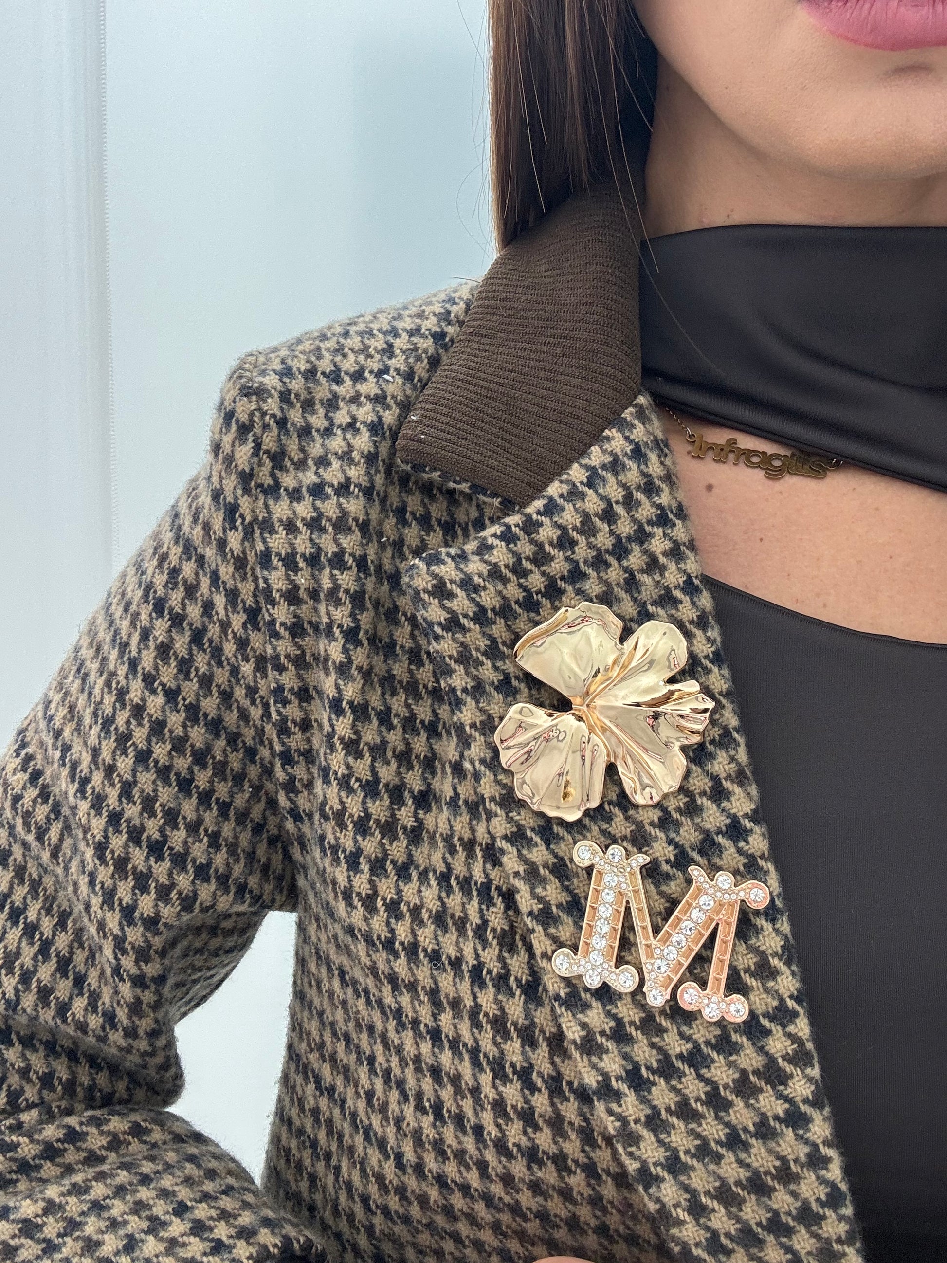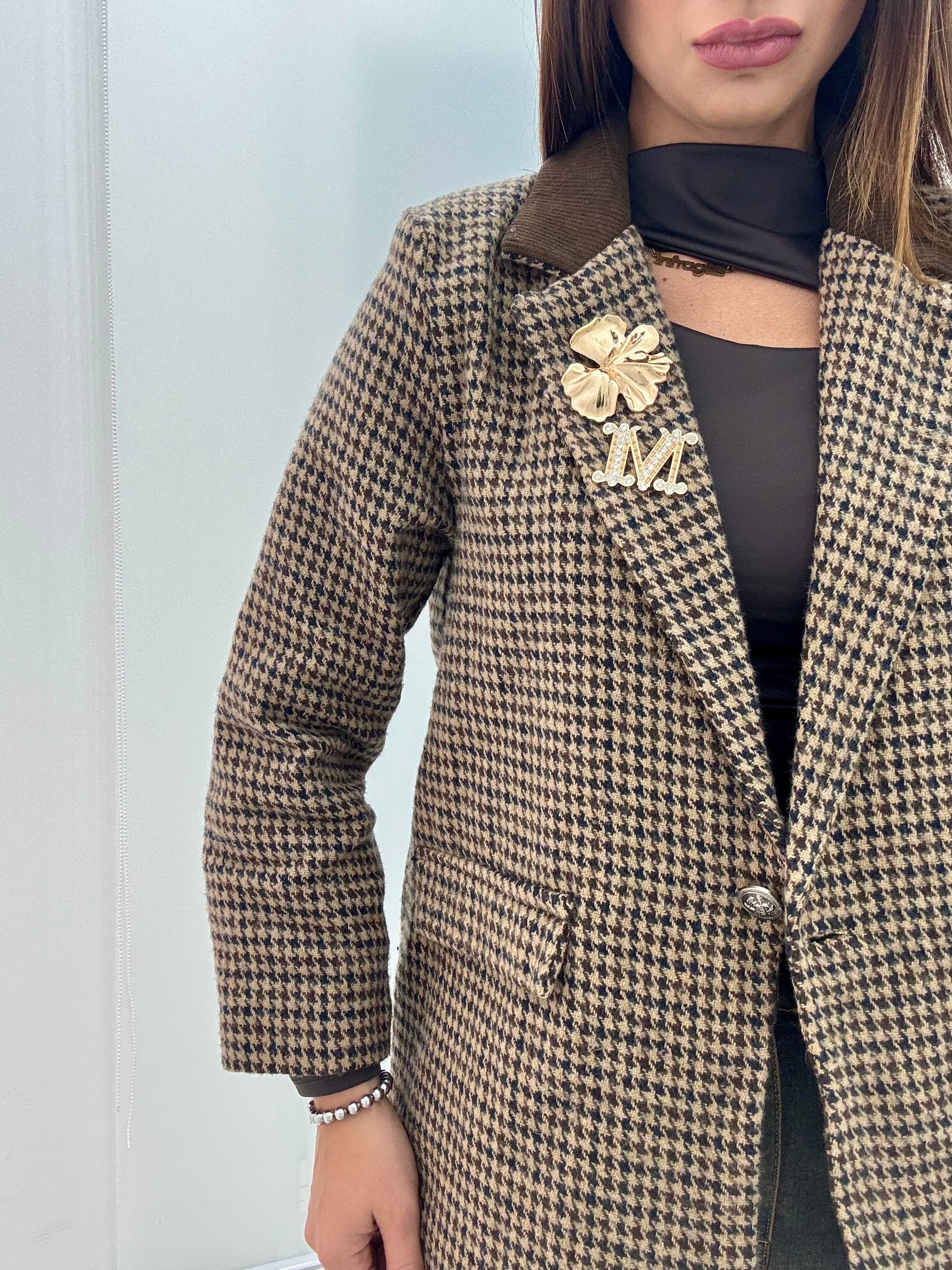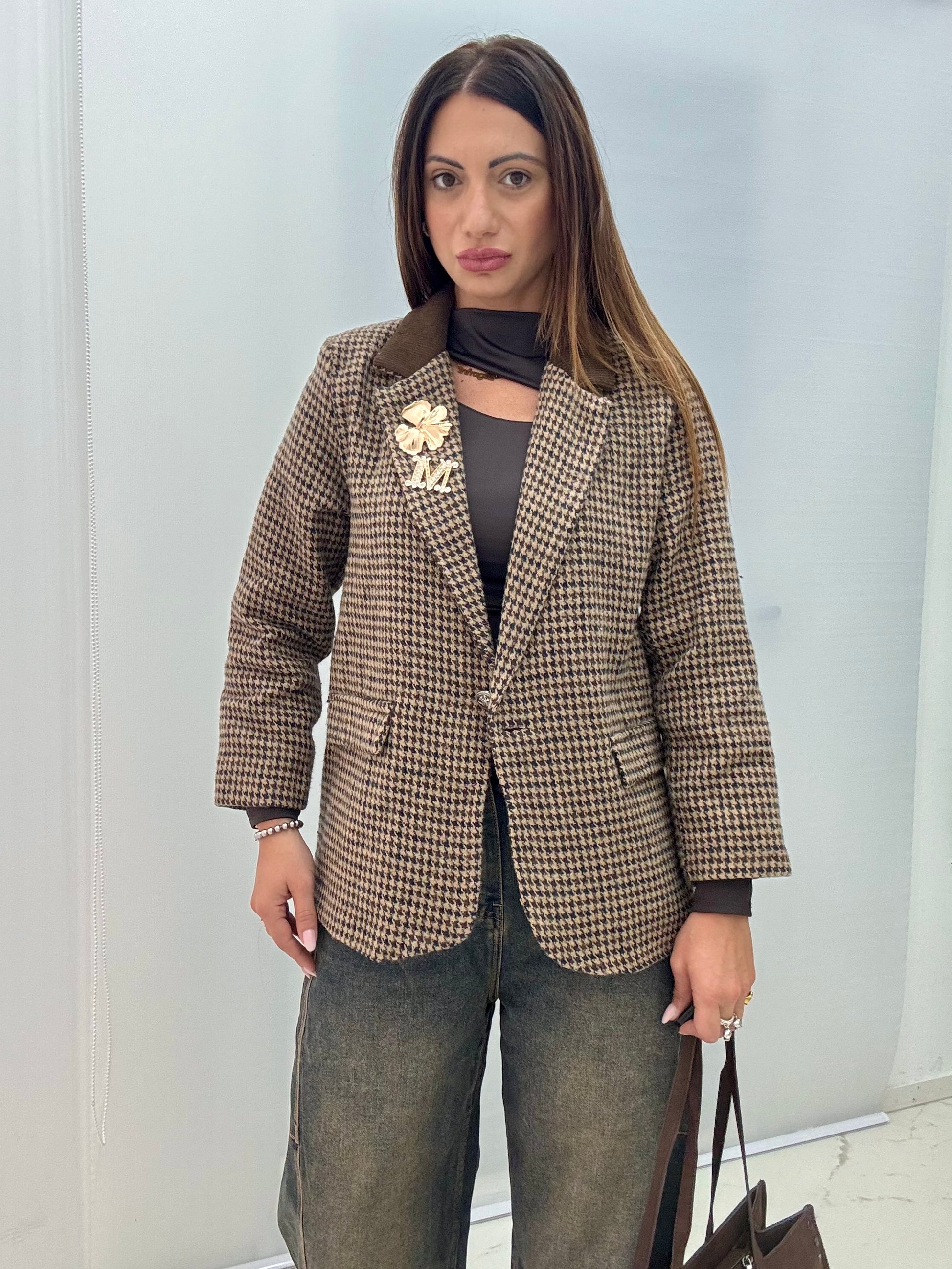 Giacca fantasia pied de poule, effetto lana, foderata, spalle strutturate, collo in velluto marrone a costine, spille incluse, taglia unica, consigliamo fino a taglia L.