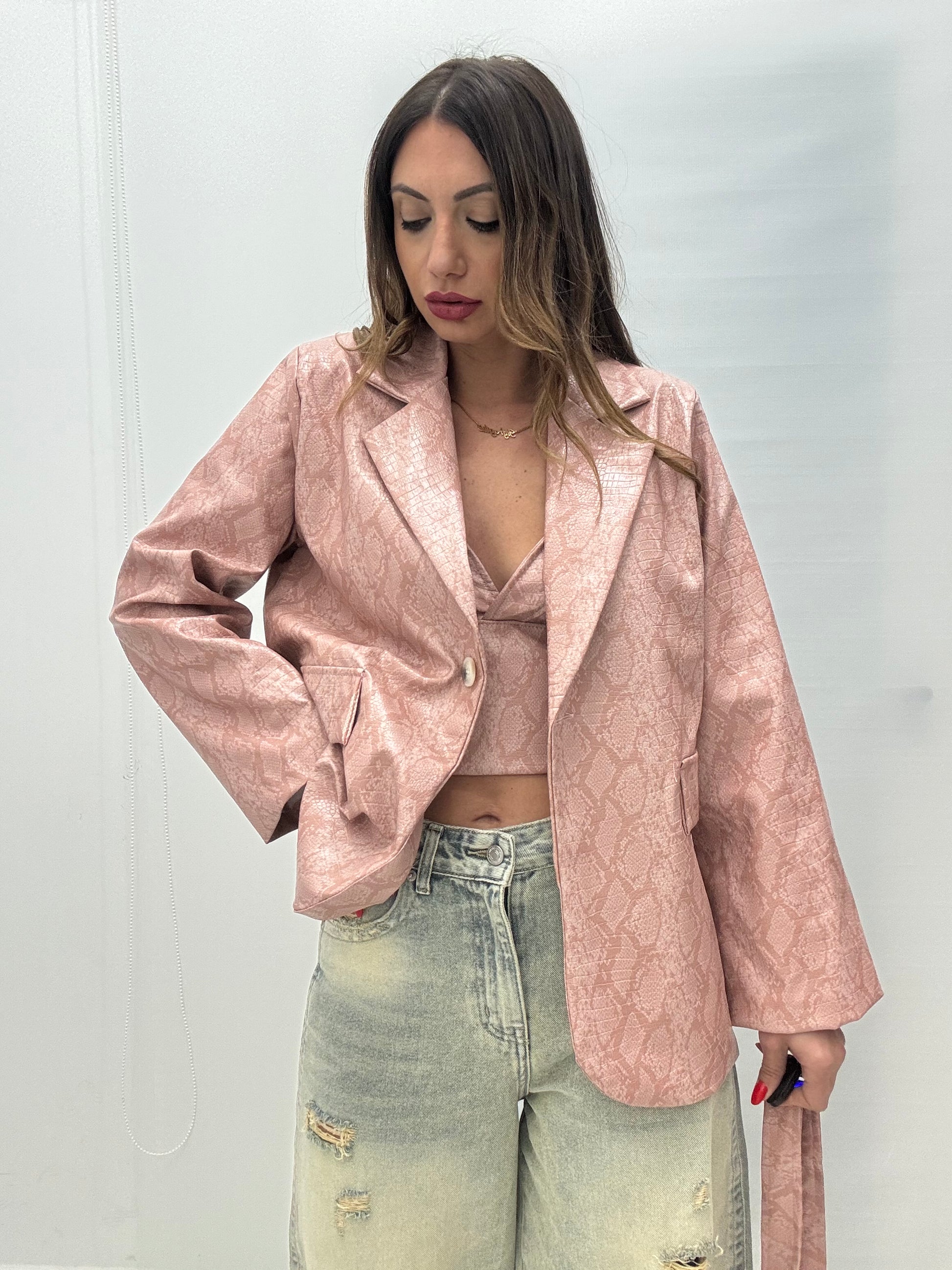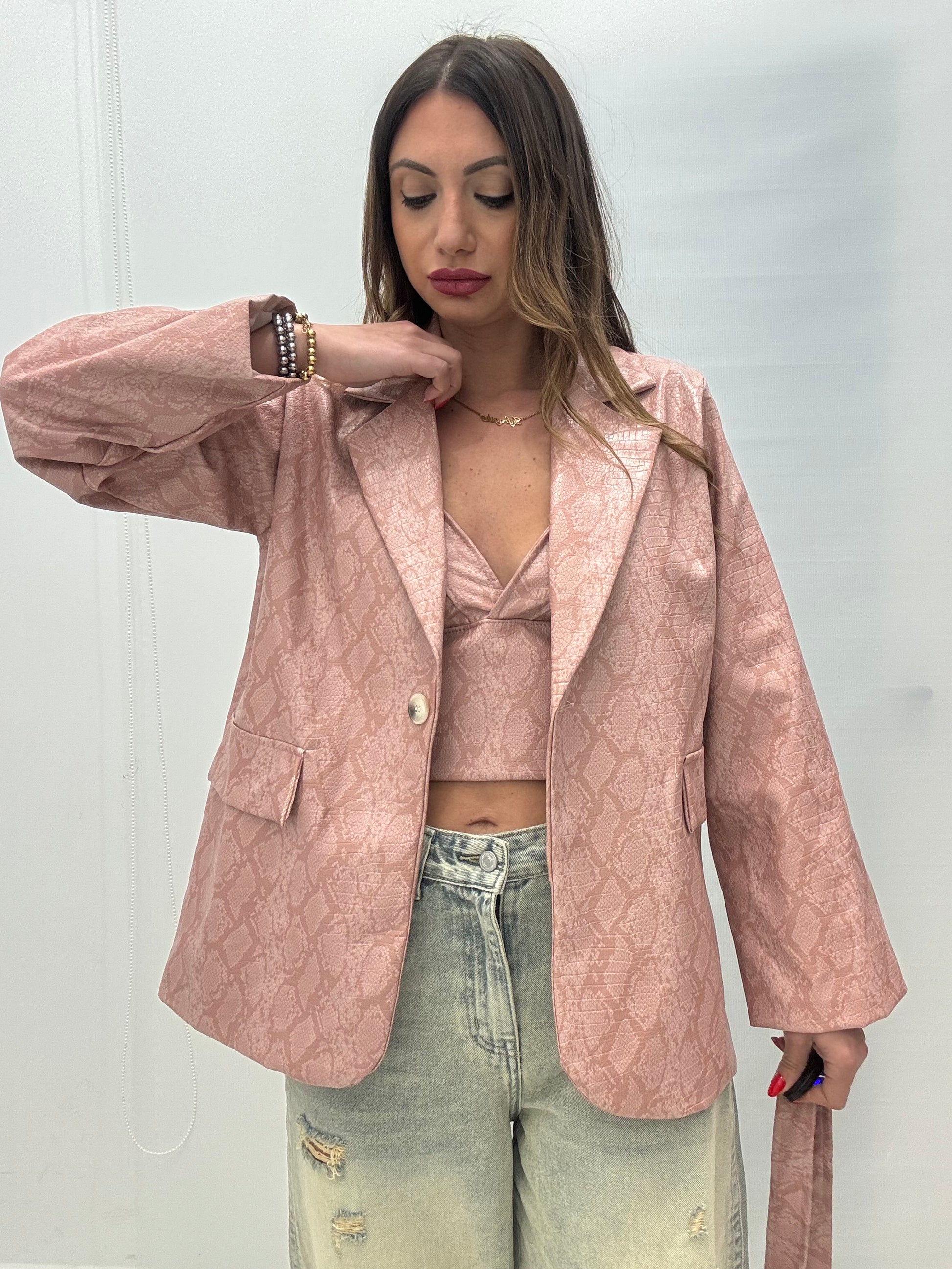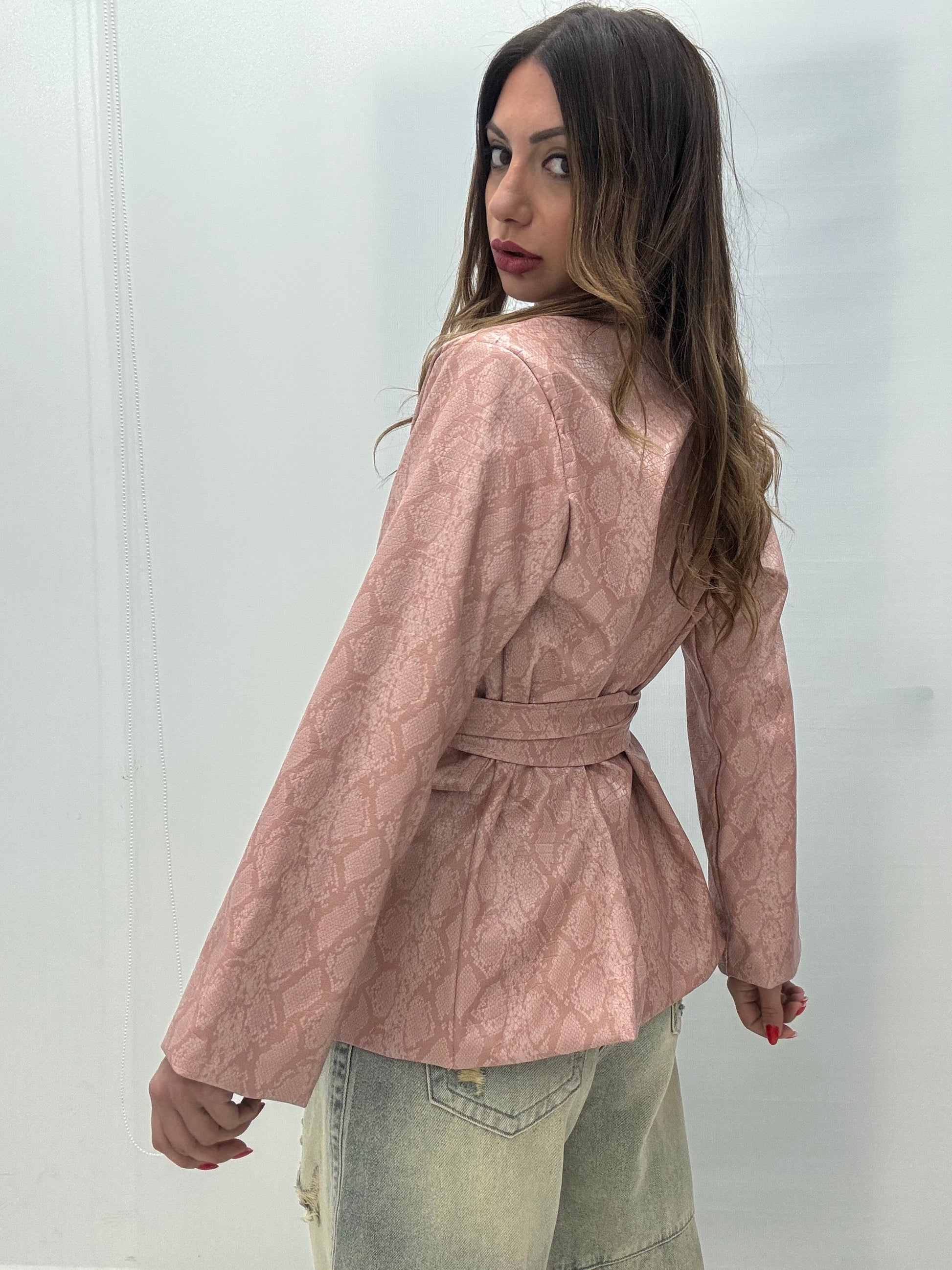 Giacca oversize in ecopelle fantasia pitonata, foderata, unico bottone sul davanti, tasche finte lateralmente, fusciacca inclusa, Taglia unica, consigliato fino a taglia L