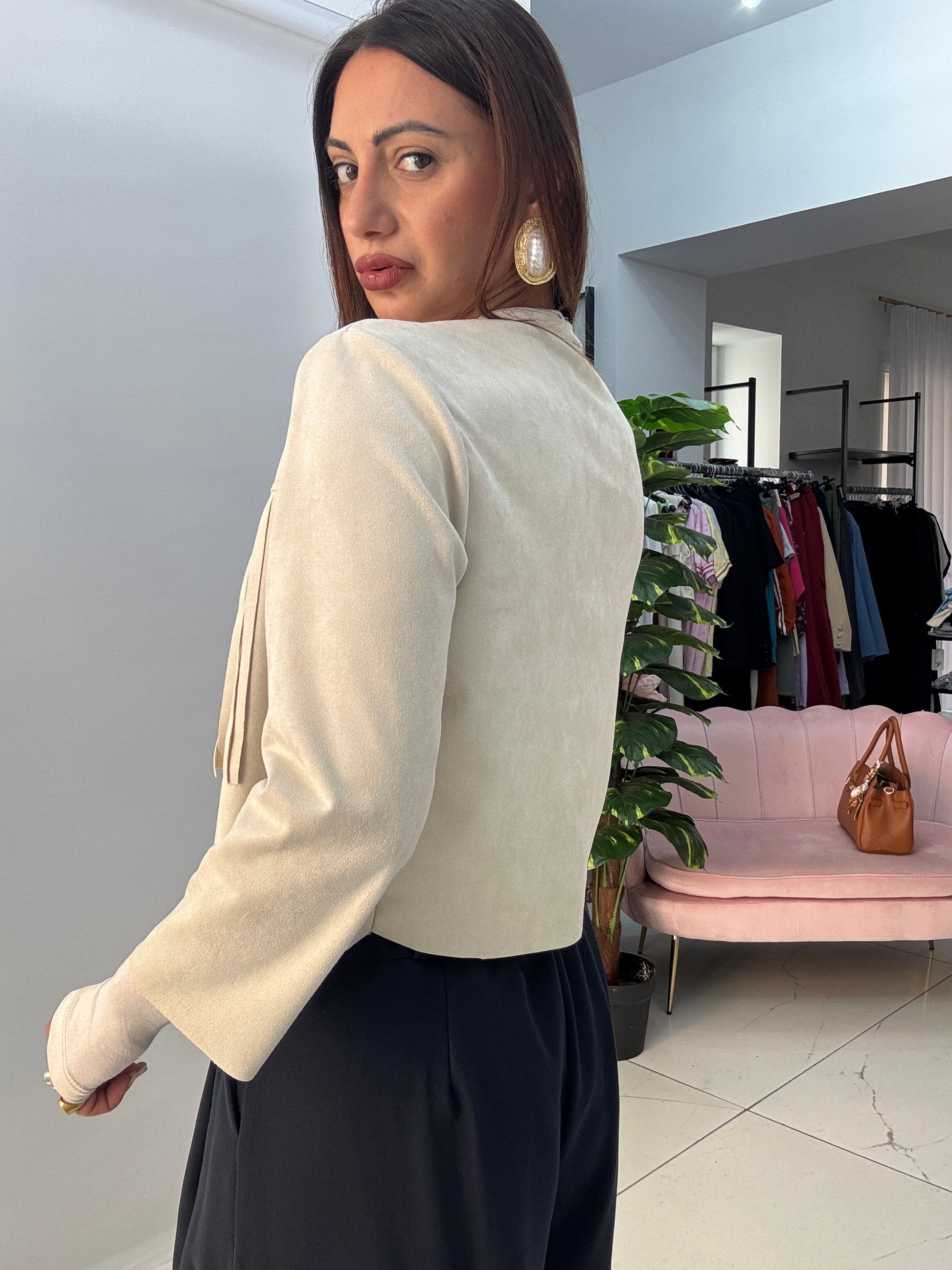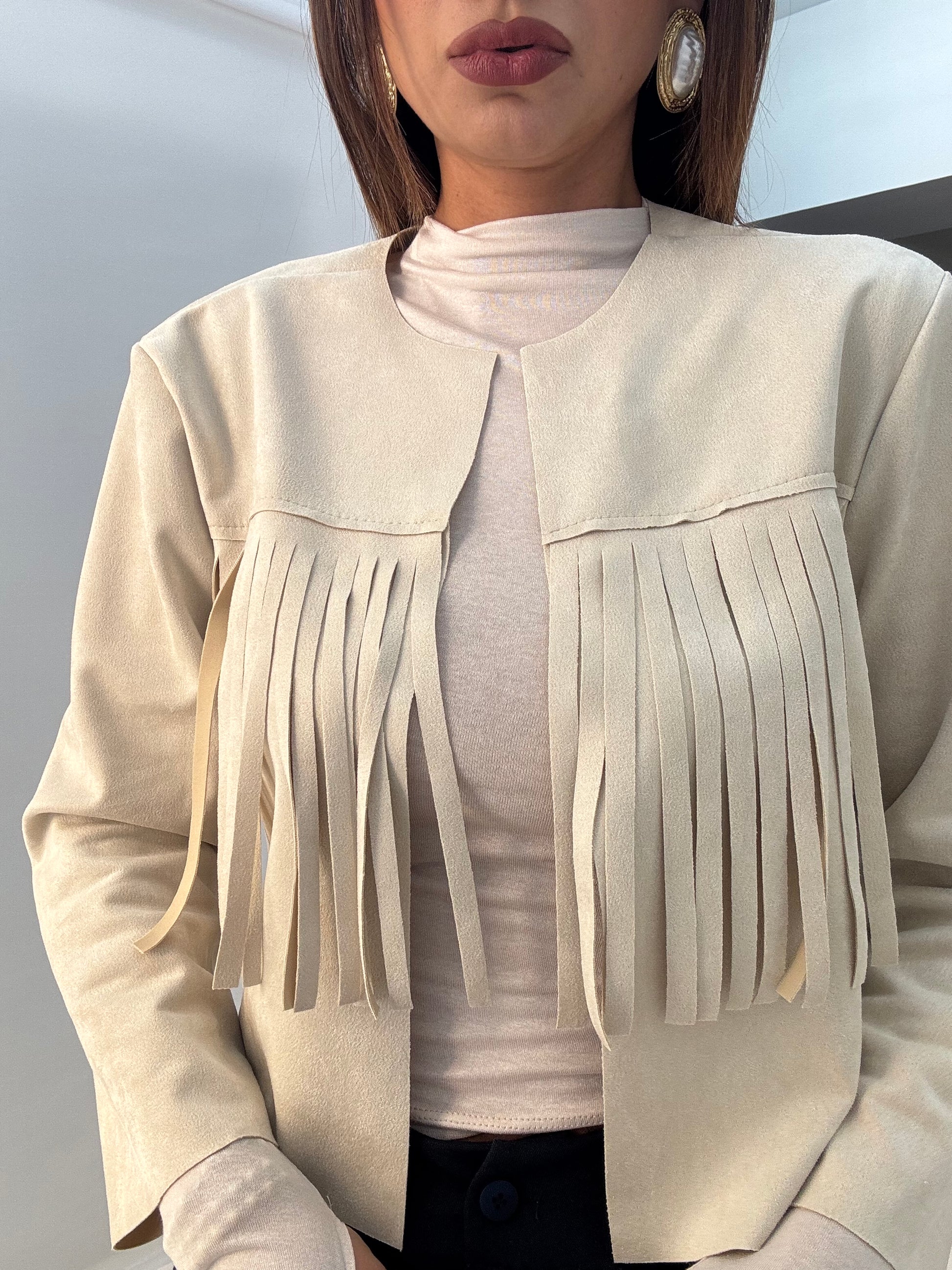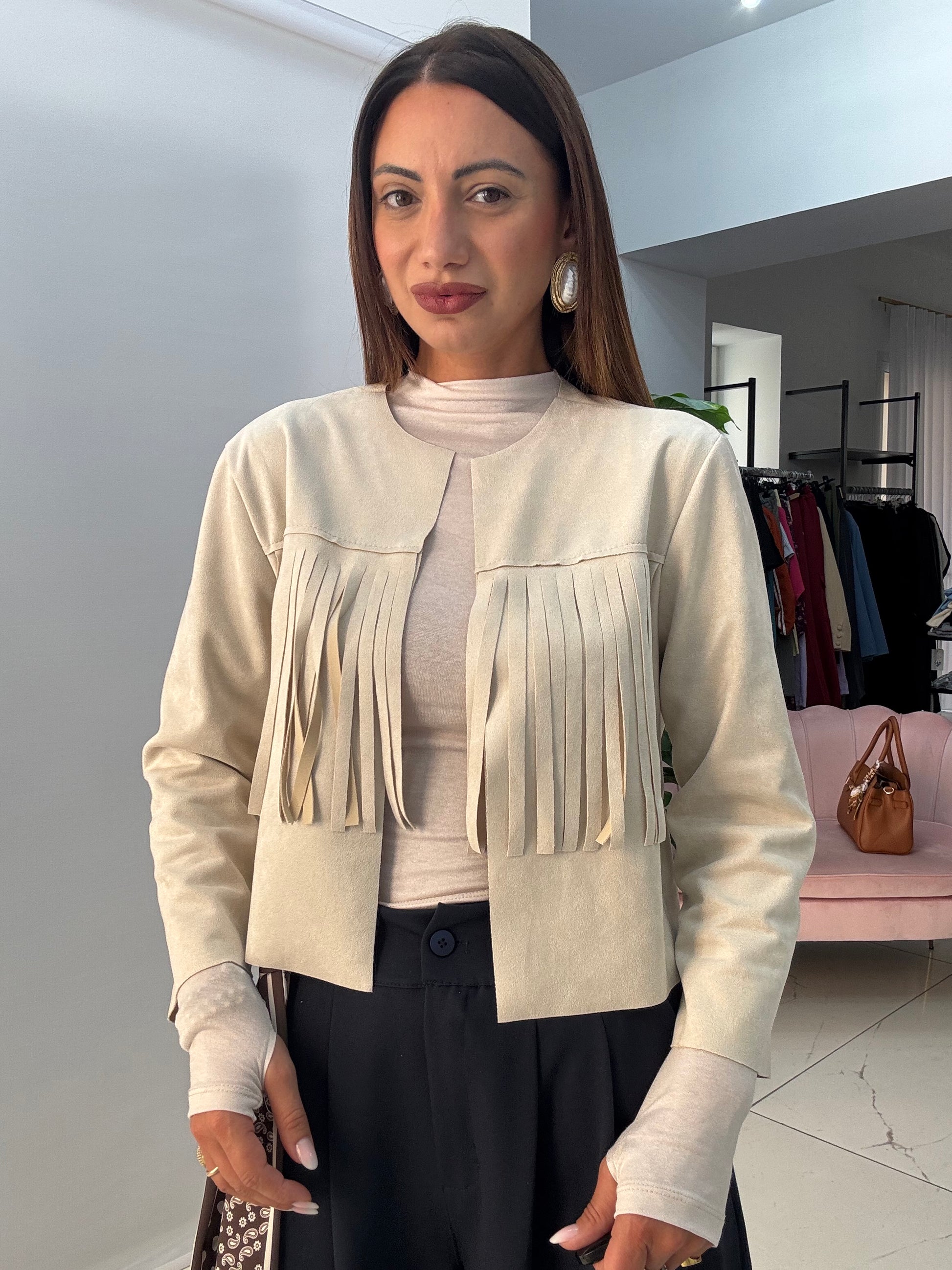 Giacchino sfoderato in effetto camoscio con frange sul davanti, taglia unica, consigliamo fino a taglia L (44)