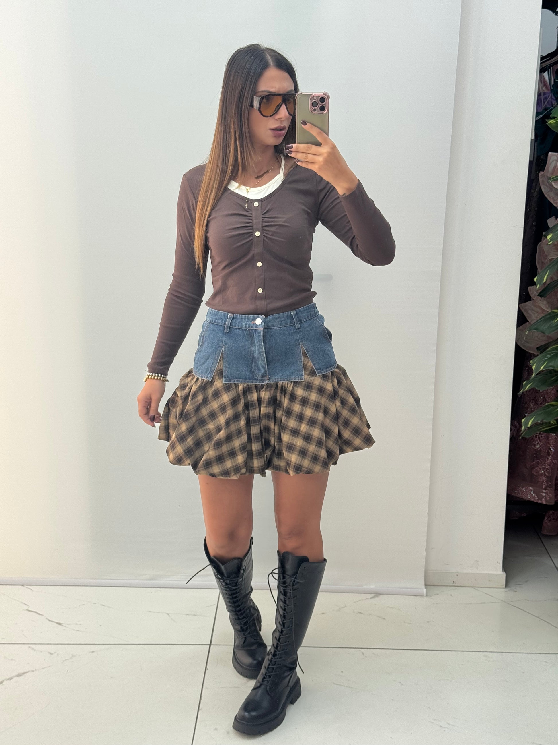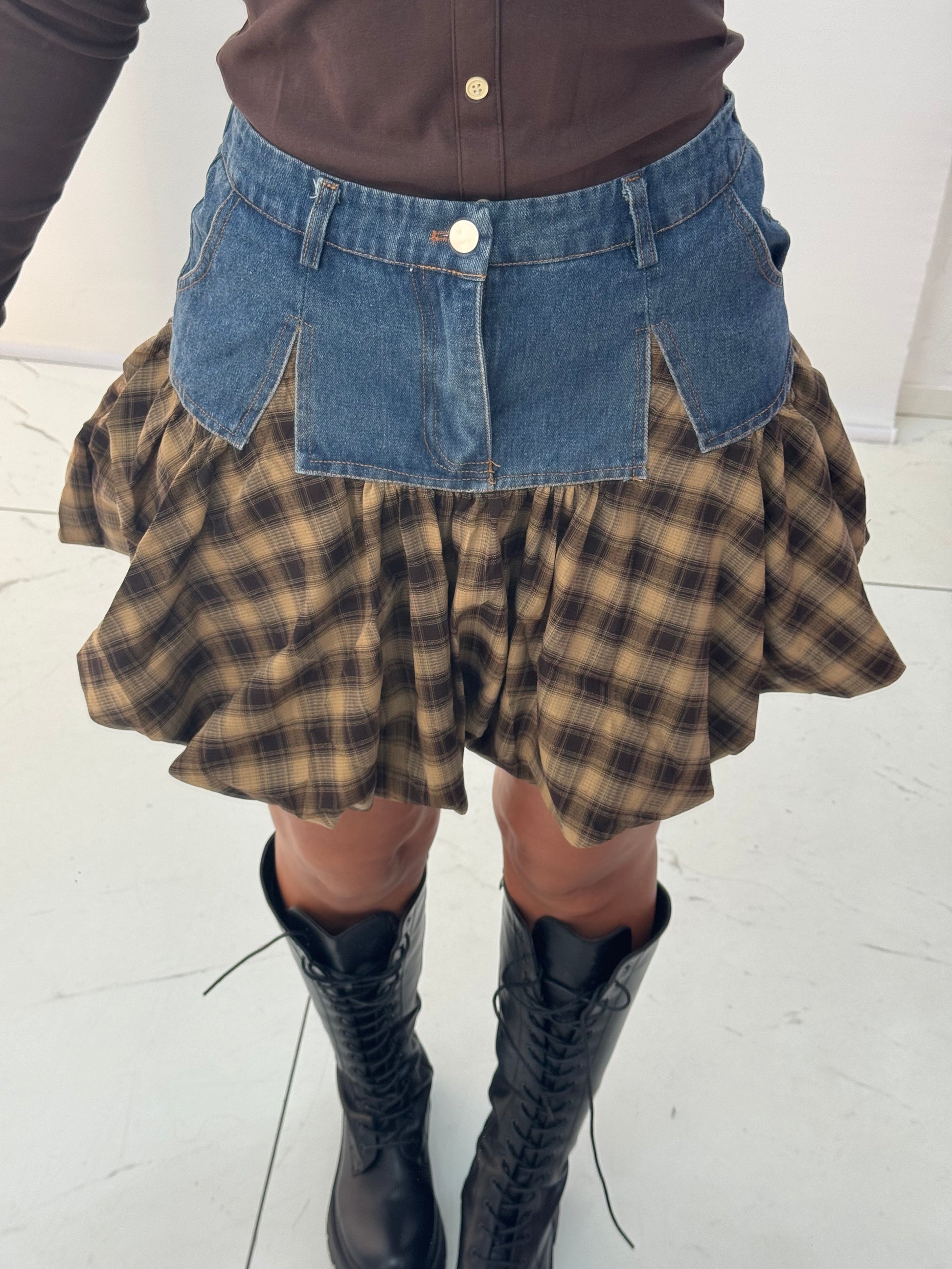 Gonna palloncino con inserti in denim, zip e bottone sul davanti ed elastico sul retro. Consigliamo SM per 38-49 ed M per 40-42.