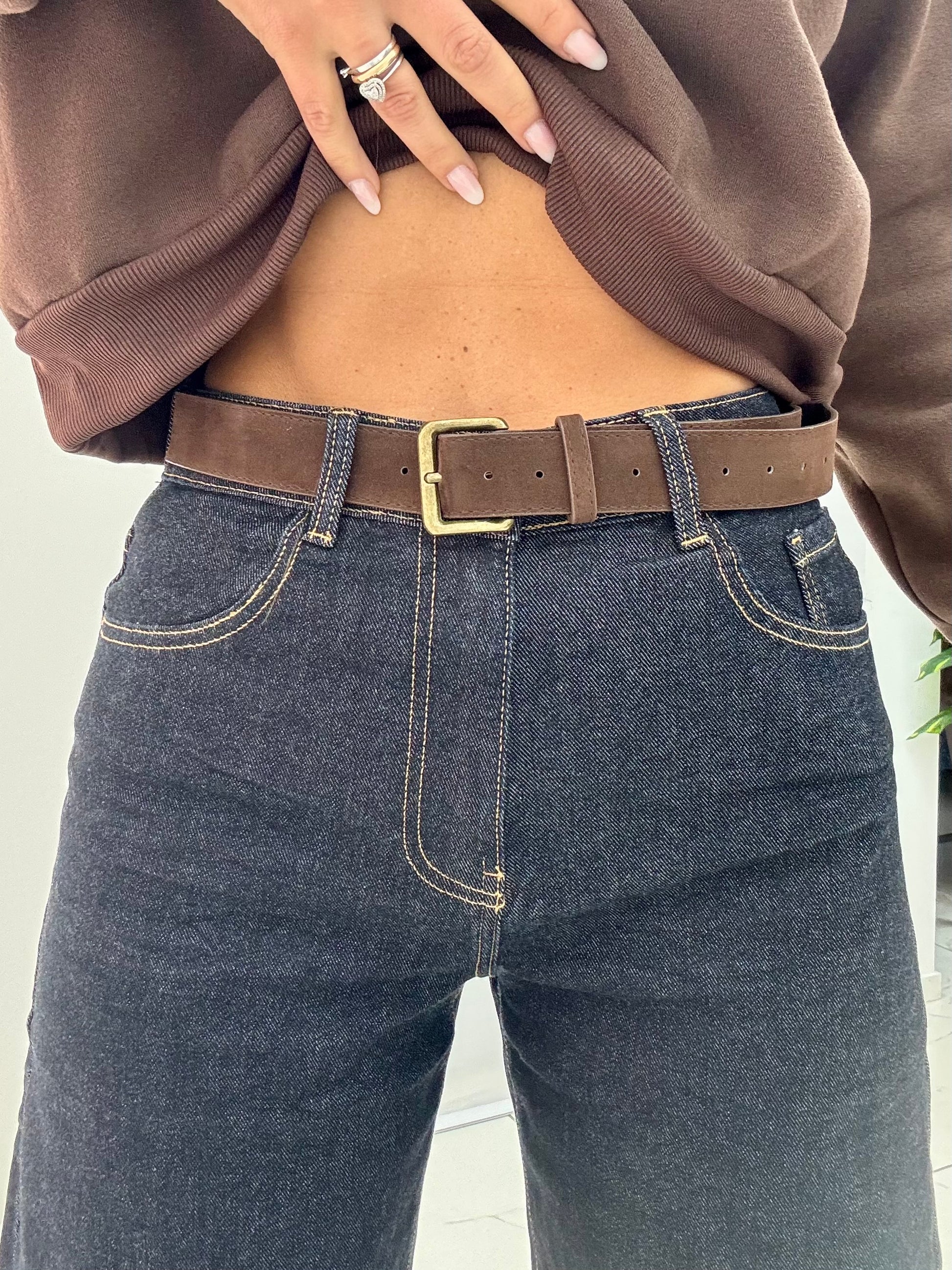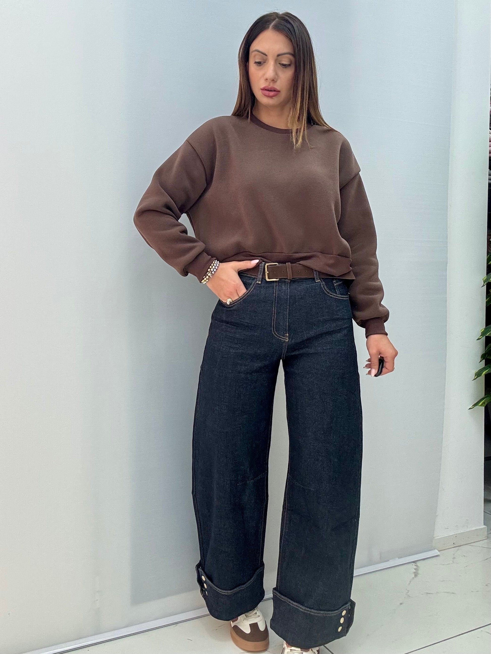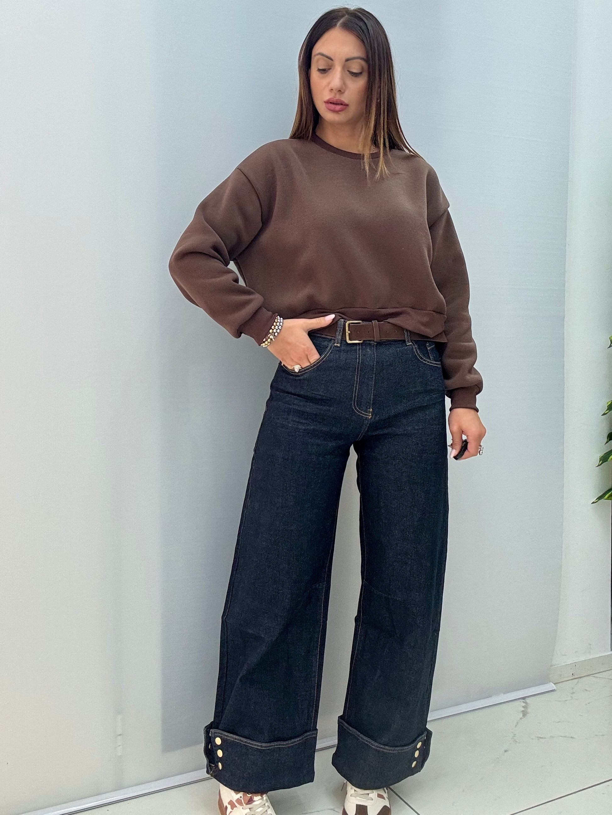 Jeans Wide leg lavaggio 0 con cuciture a contrasto, cintura inclusa, piegoni sul fondo con bottoni applicati. Elastico, vestibilità regolare. Disponibile da taglia XS ad L.
