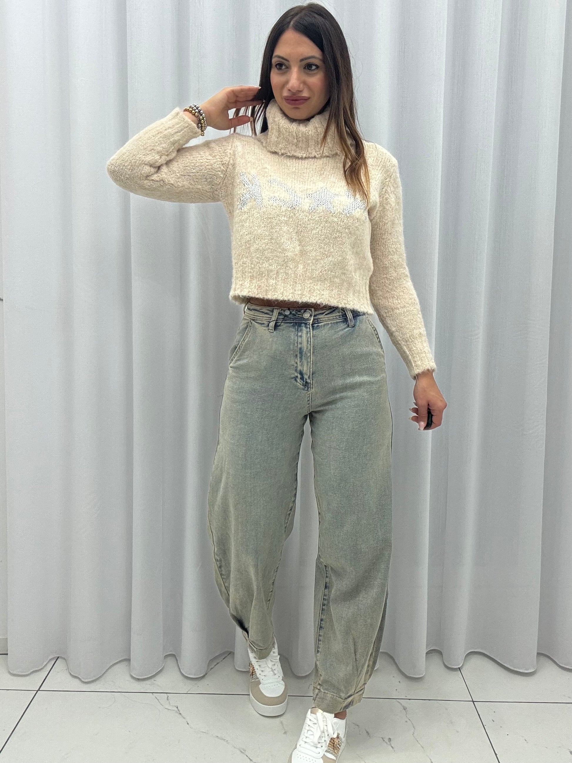 Jeans ballon sabbiato con zip e bottone sul davanti, elastico, vestibilità regolare. Disponibile da XS ad XL.