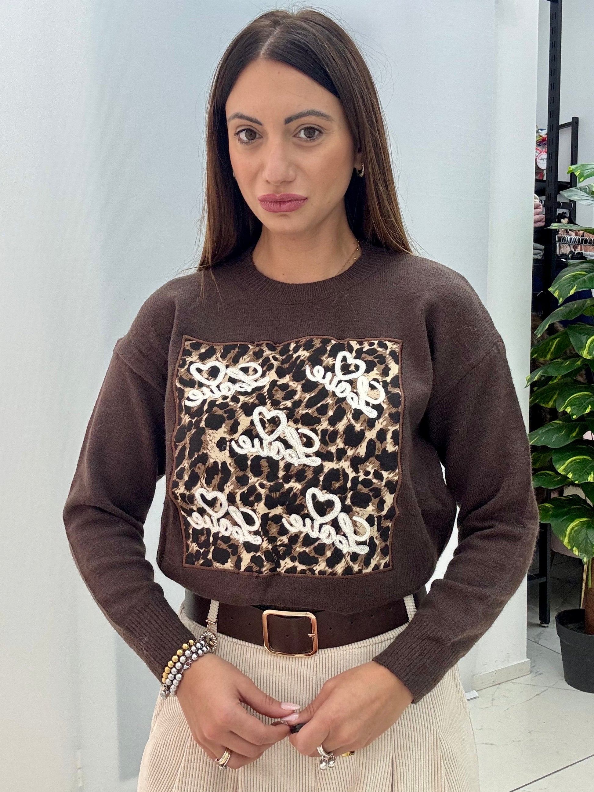 Maglione con inserti fantasia maculata e e scritte ricamate sul davanti. Taglia unica, consigliamo fino a taglia XL.