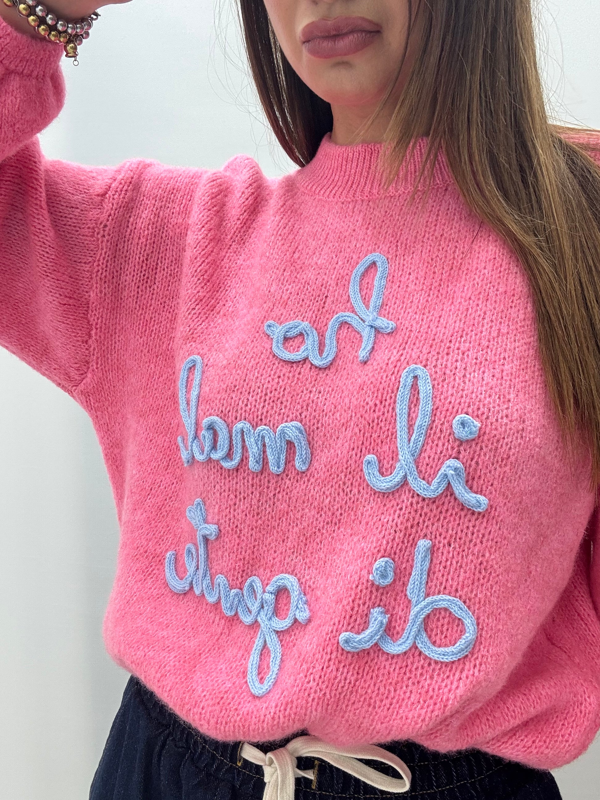 Maglione con scritta ricamata a contrasto sul davanti. Taglia unica, consigliamo fino a taglia XL.