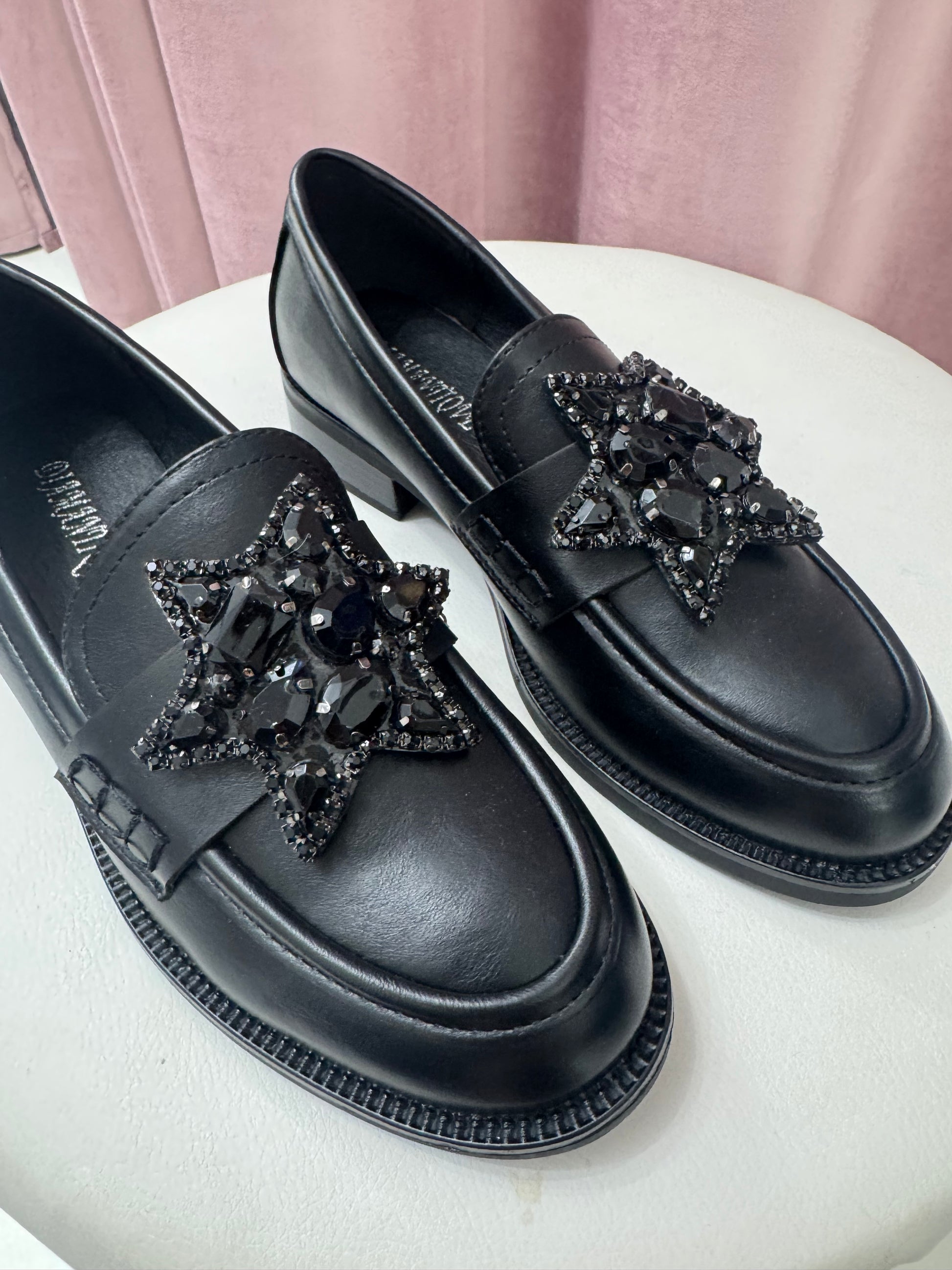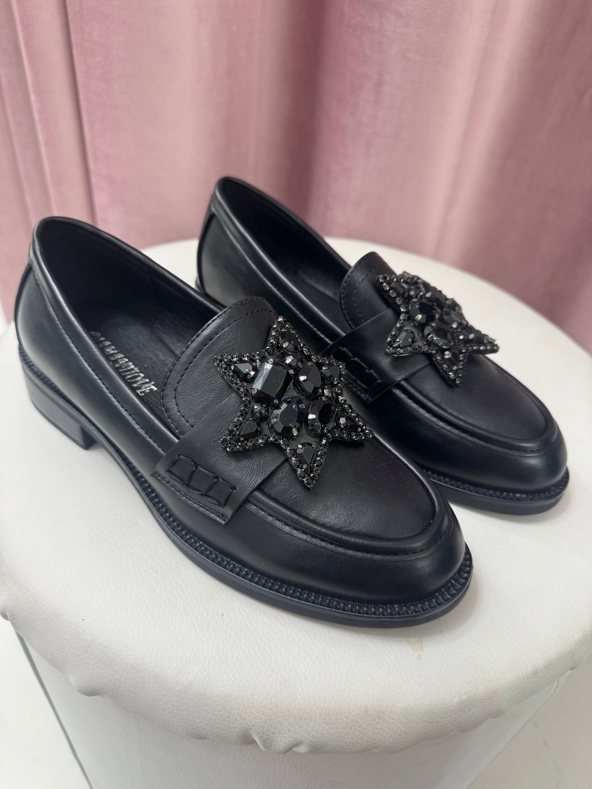 Mocassini in ecopelle con pietre applicate sul sopra. Disponibile dal 37 al 41, calzata regolare.