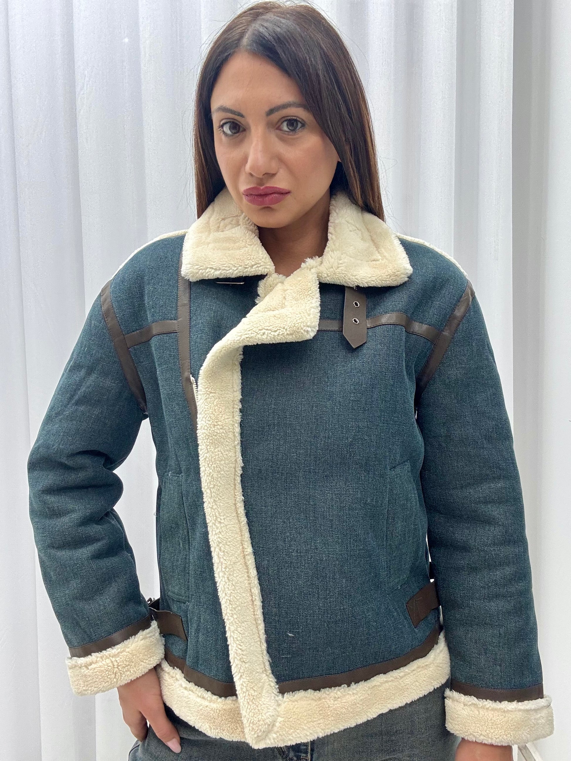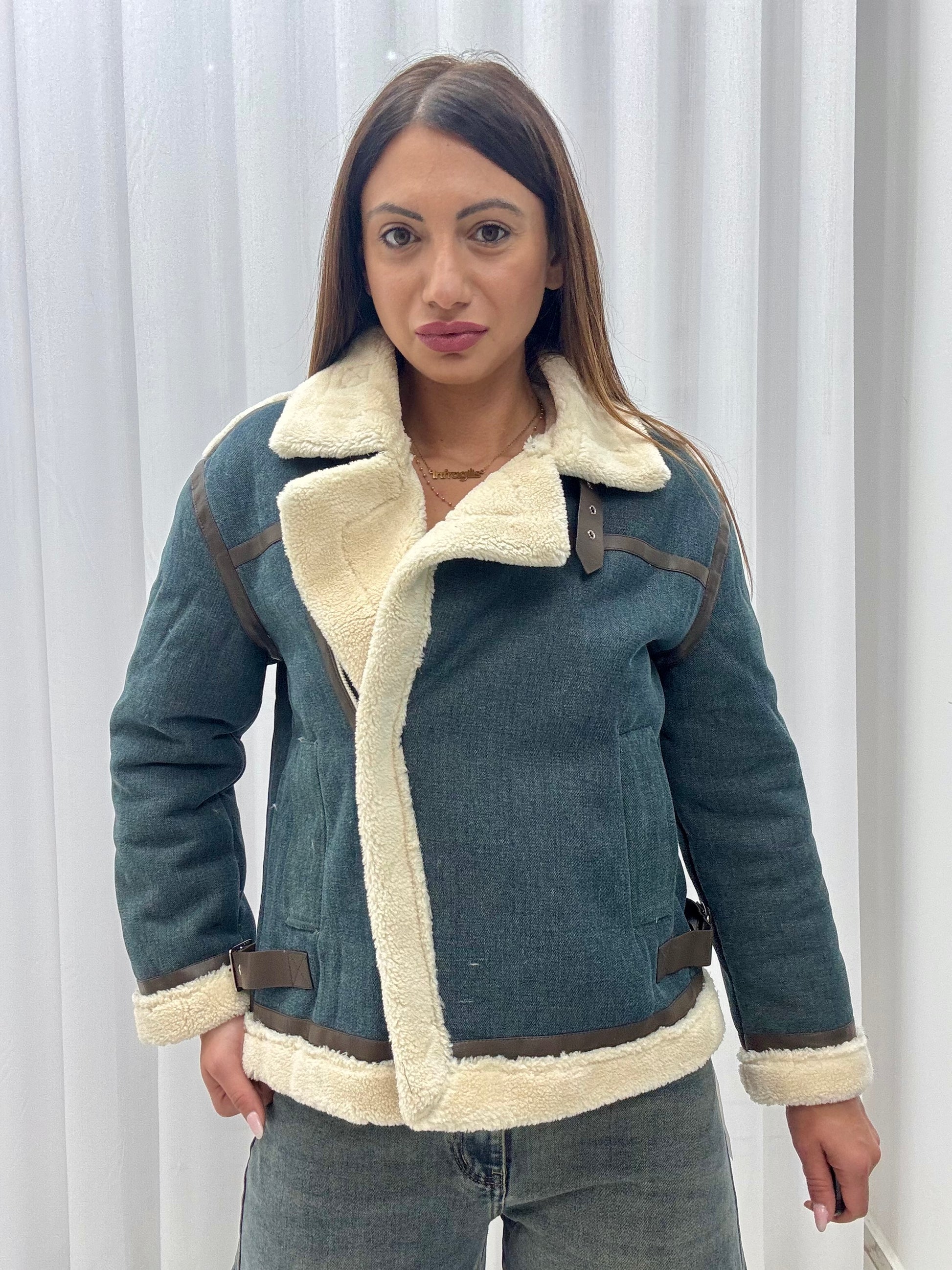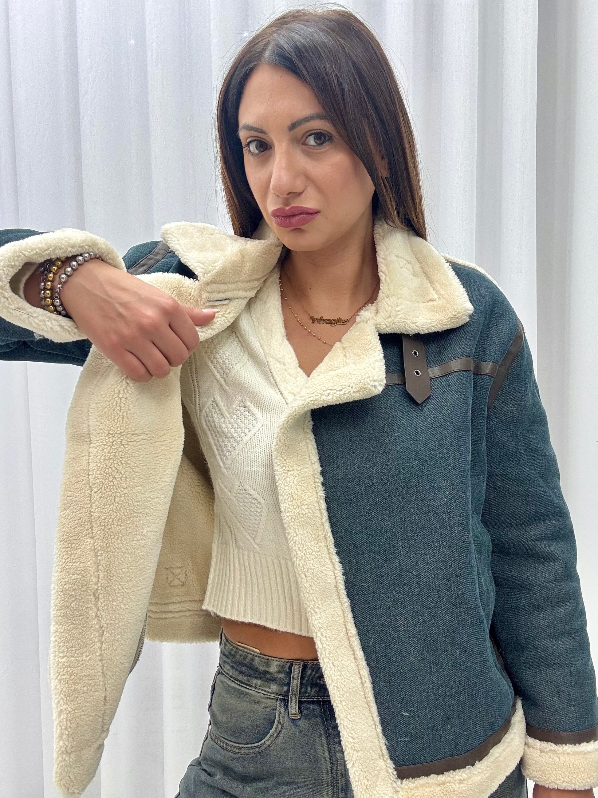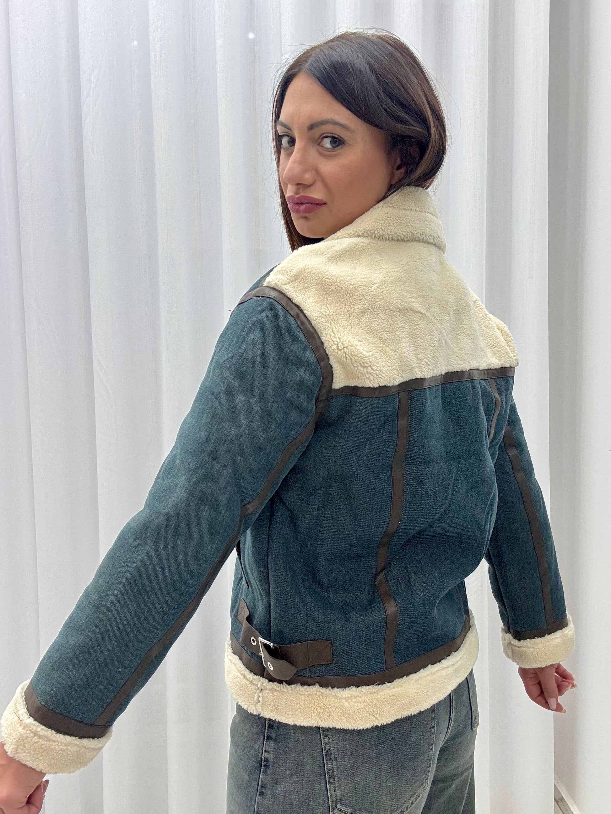 Montone in denim con riporti in ecopelle marrone ed ecopelliccia interna. Taglia unica, consigliamo fino a taglia L.