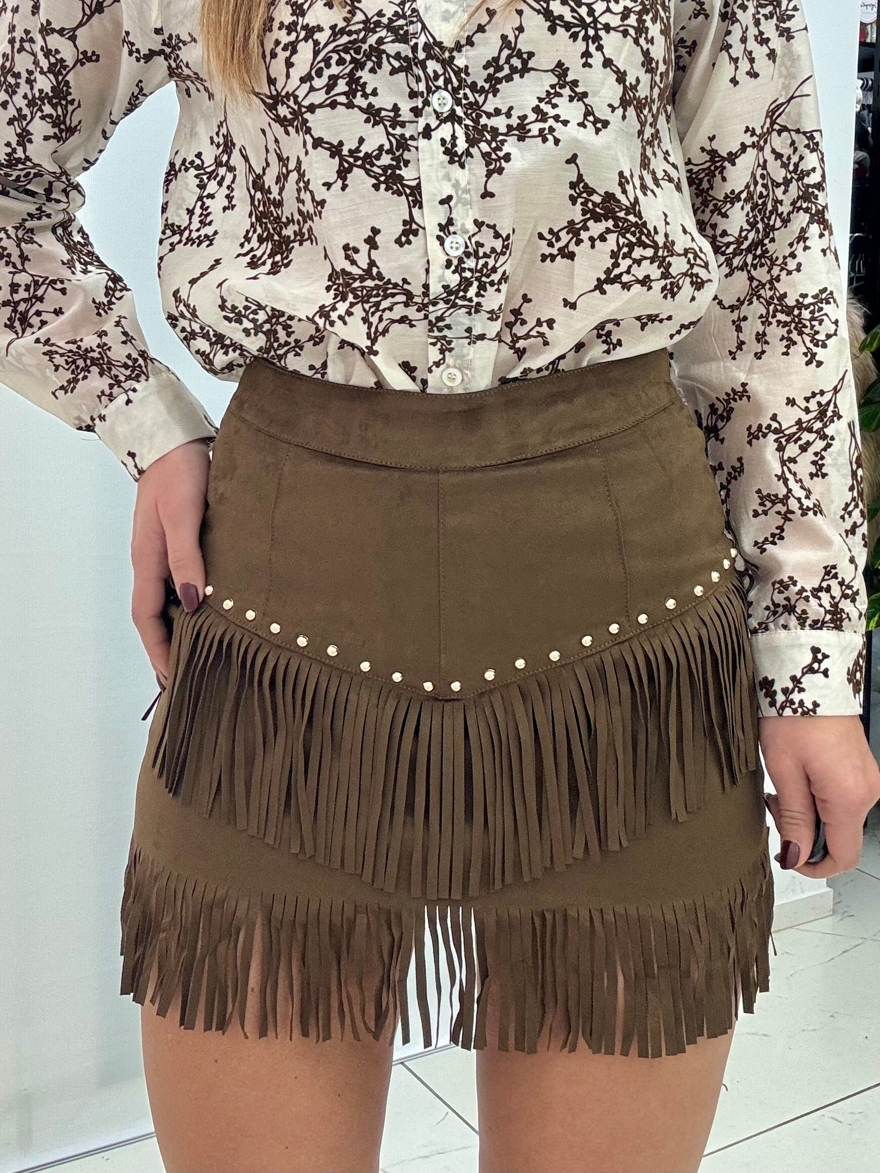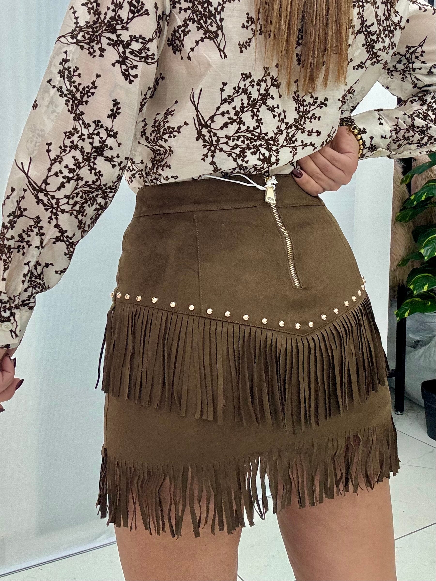 Pantagonna in effetto daino con borchie dorate, sia sul davanti che sul retro. Cursore sul retro a vista color oro. Fodera sottostante a pantaloncino. Disponibile in taglia S M L, vestibilità regolare.