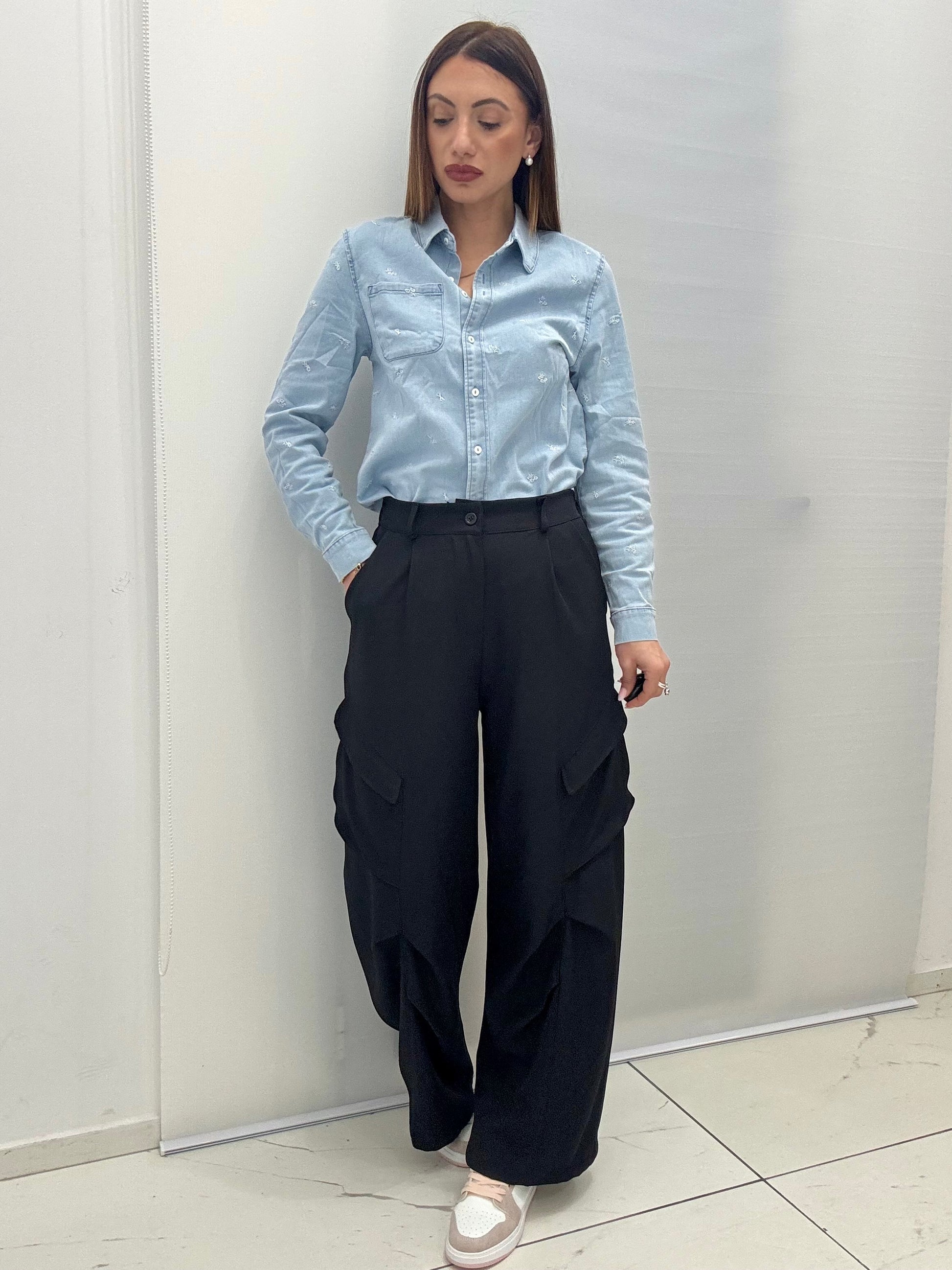 Pantalone modello cargo con zip e bottone sul davanti ed elastico sul retro. Tasconi frontalmente, scende gamba larga. Taglia unica, consigliato fino a taglia 44