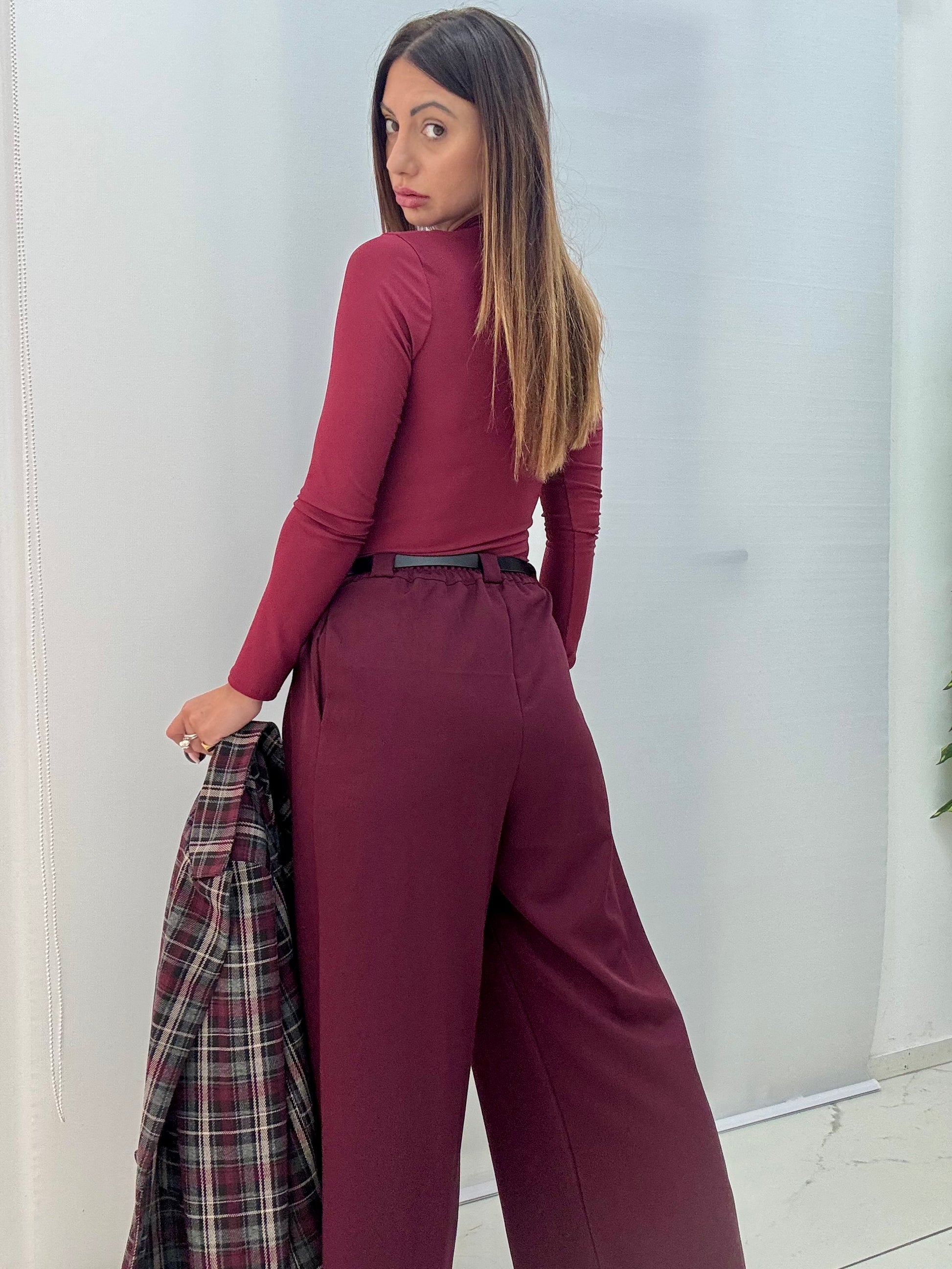 Pantalone palazzo con zip e bottone sul davanti ed elastico sul retro. Vestibilità morbida, taglia unica, consigliamo da M ad XL. Cintura con charm inclusa.