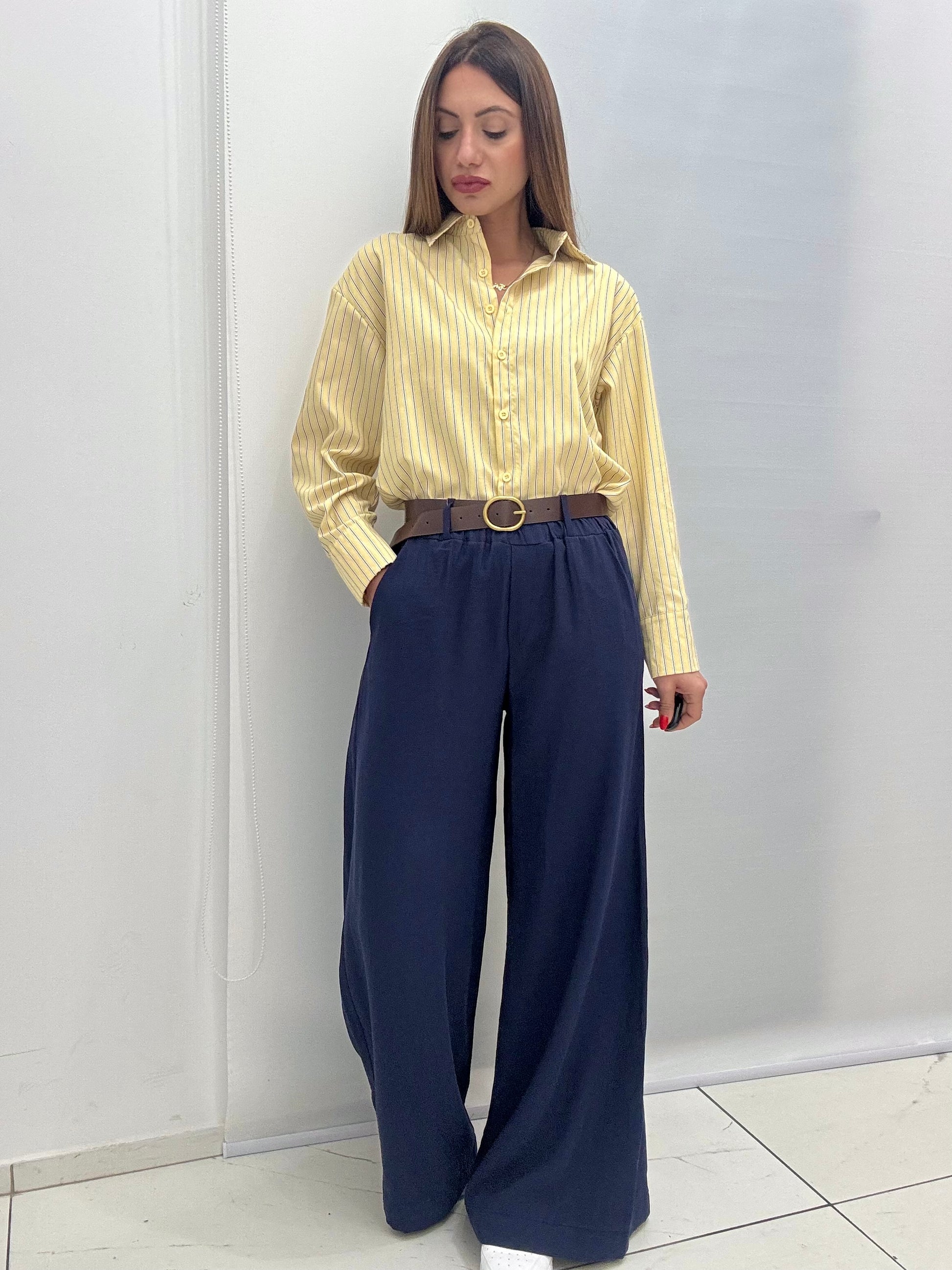 Pantalone palazzo in cotone con elastic in vita, tasche a filo e cintura inclusa, taglia unica, consigliamo fino a taglia 46.