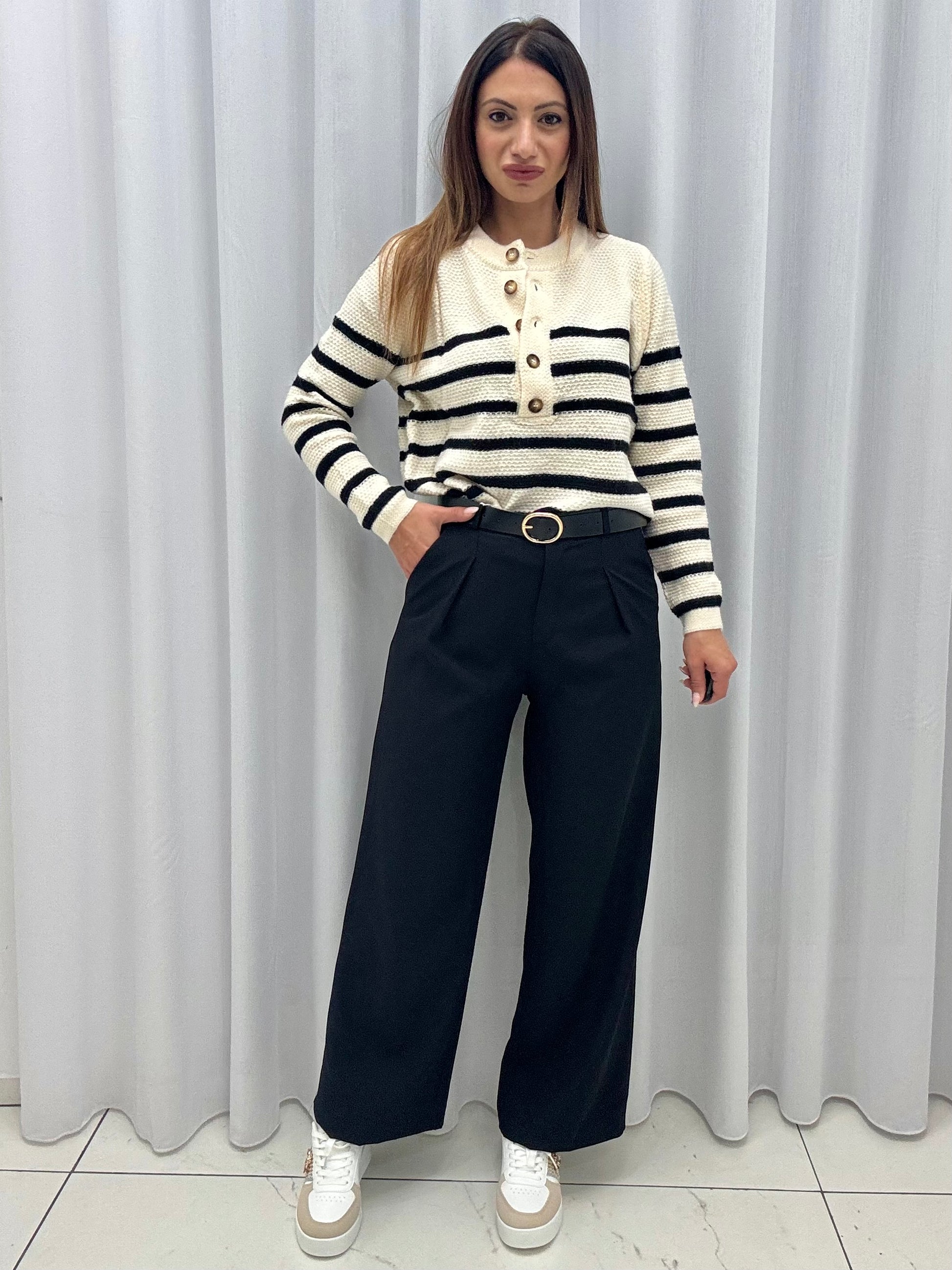 Pantalone con zip e bottone sul davanti, tasche a filo, leggera pence sul davanti, gamba dritta. Disponibile in taglia S M L. Cintura inclusa.