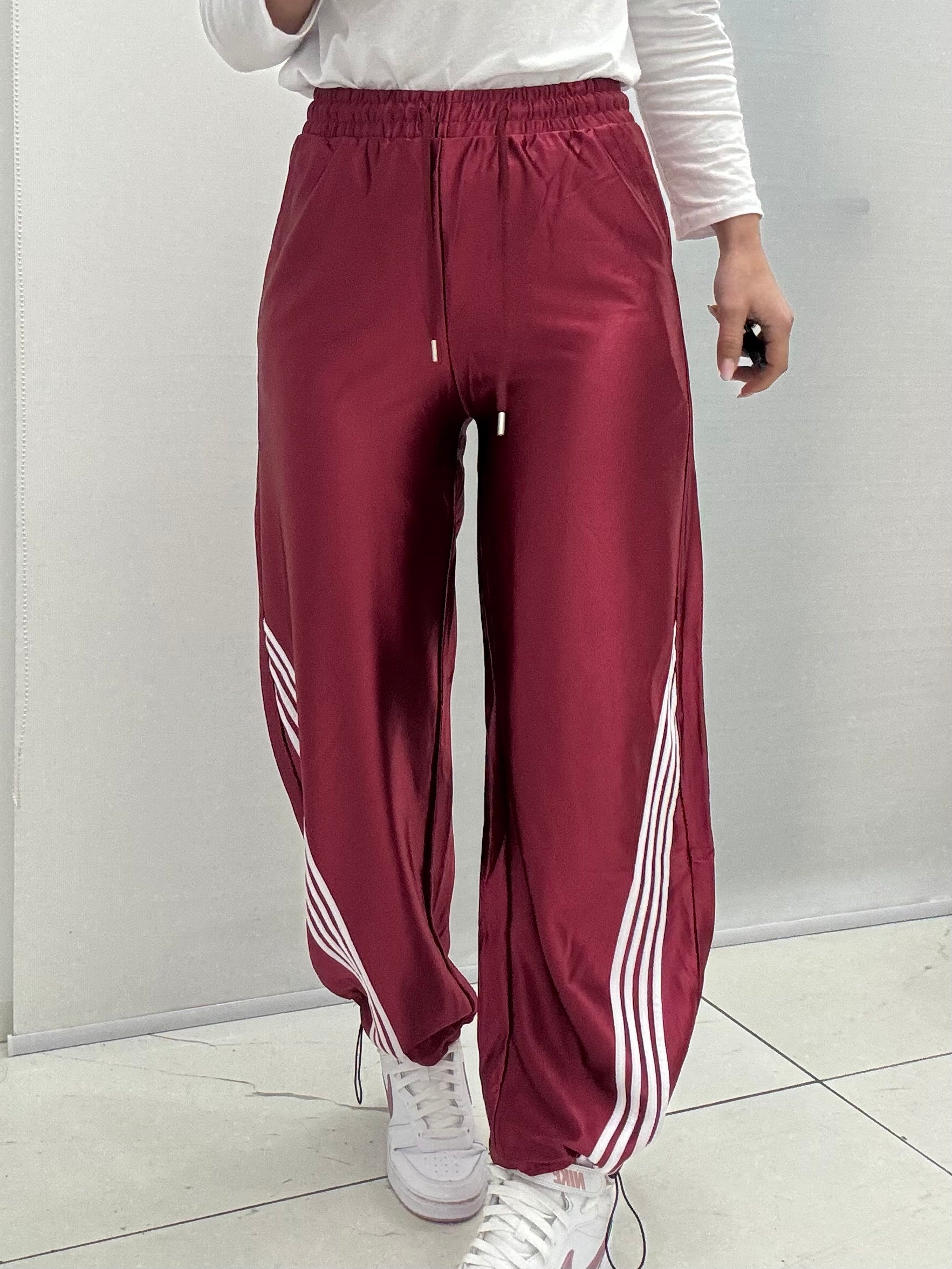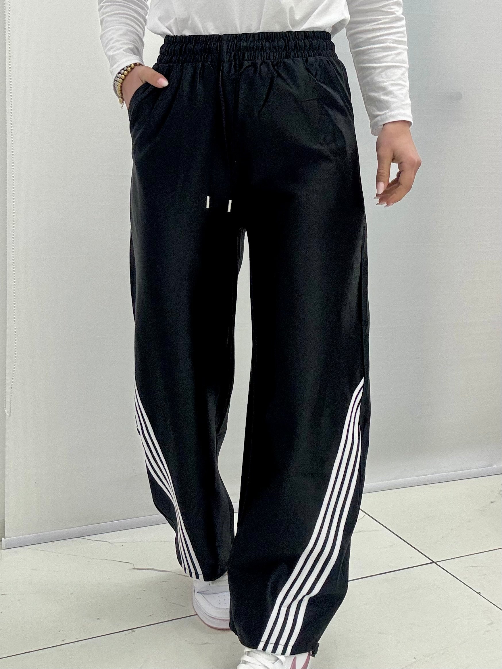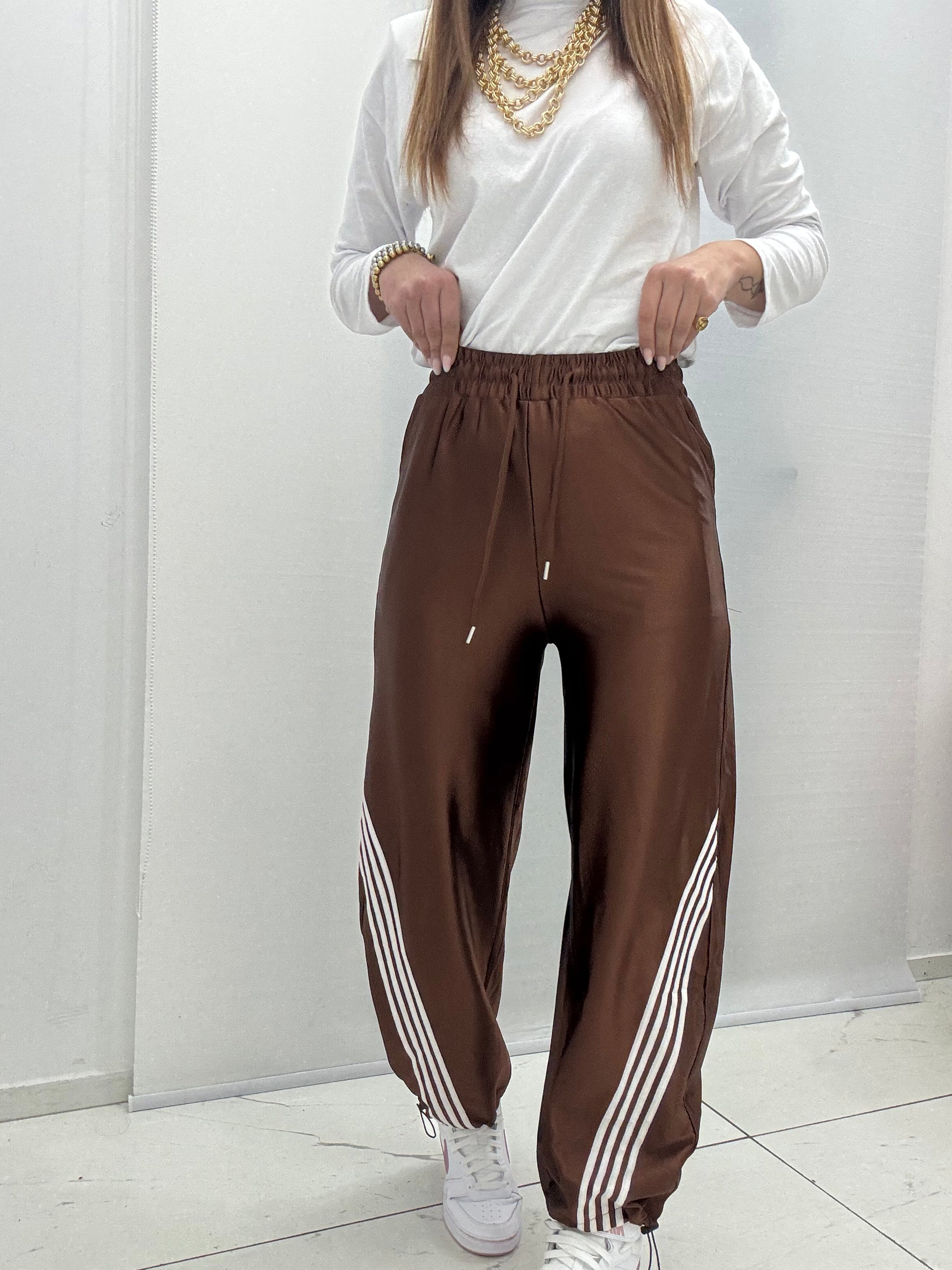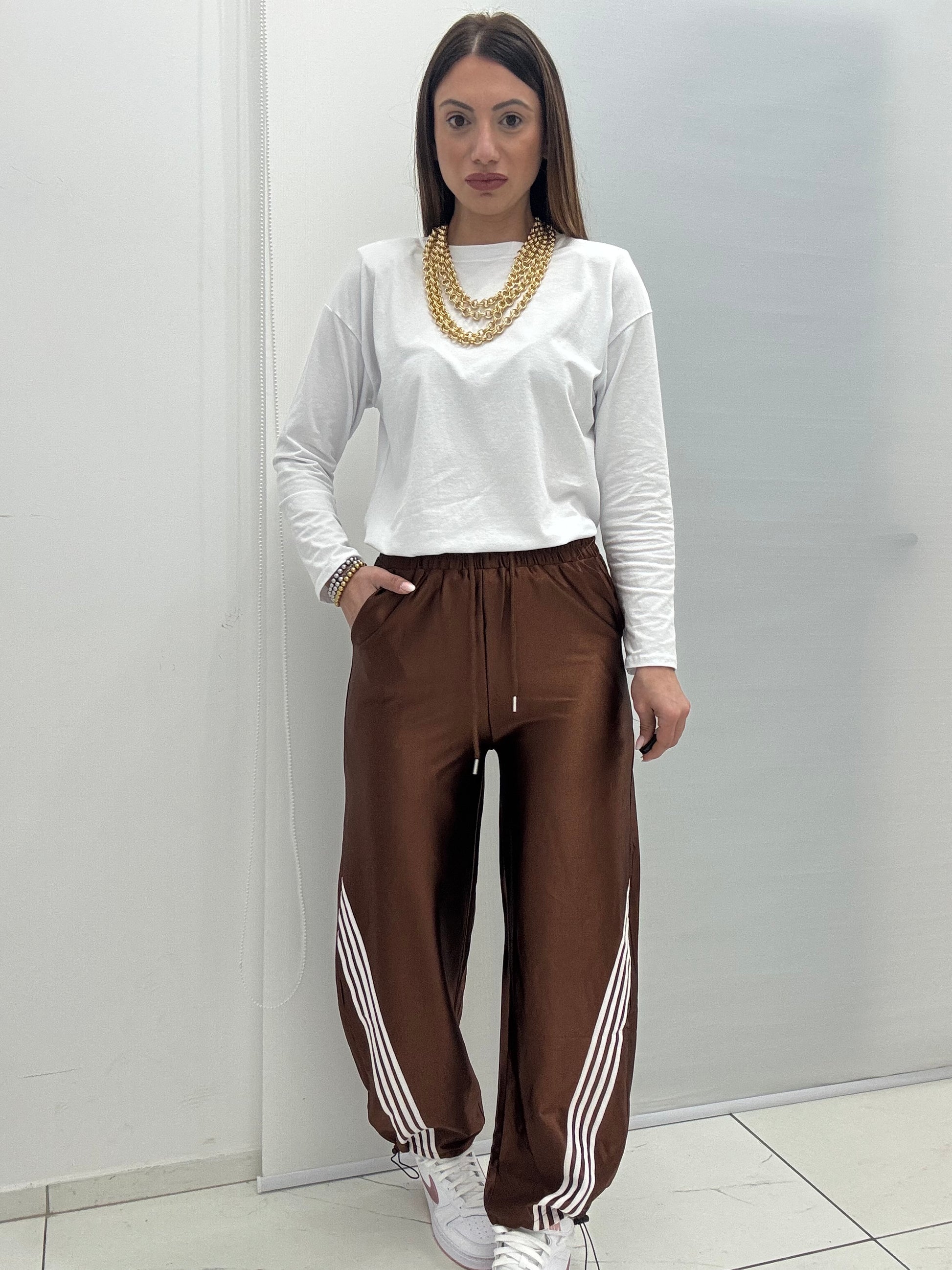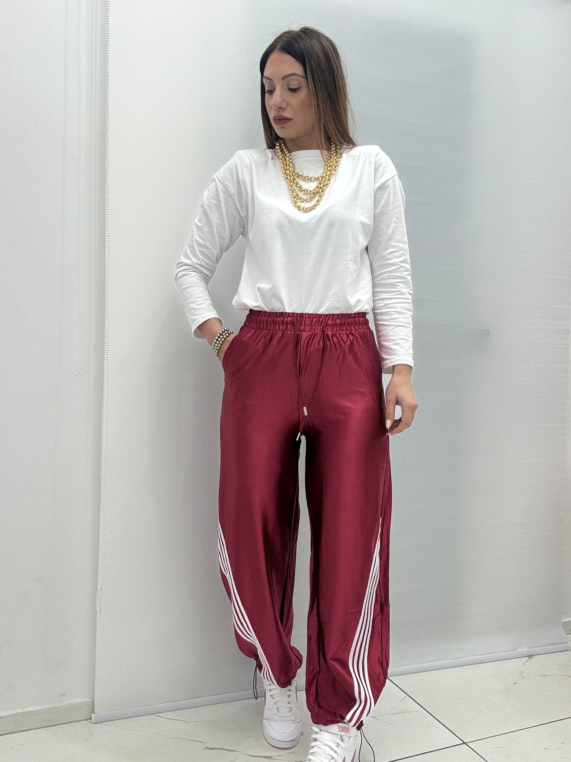 Pantatuta acetato con elastico e coulisse in vita, coulisse a caviglia, banda laterale a contrasto. Disponibile in taglia SM ed LXL.