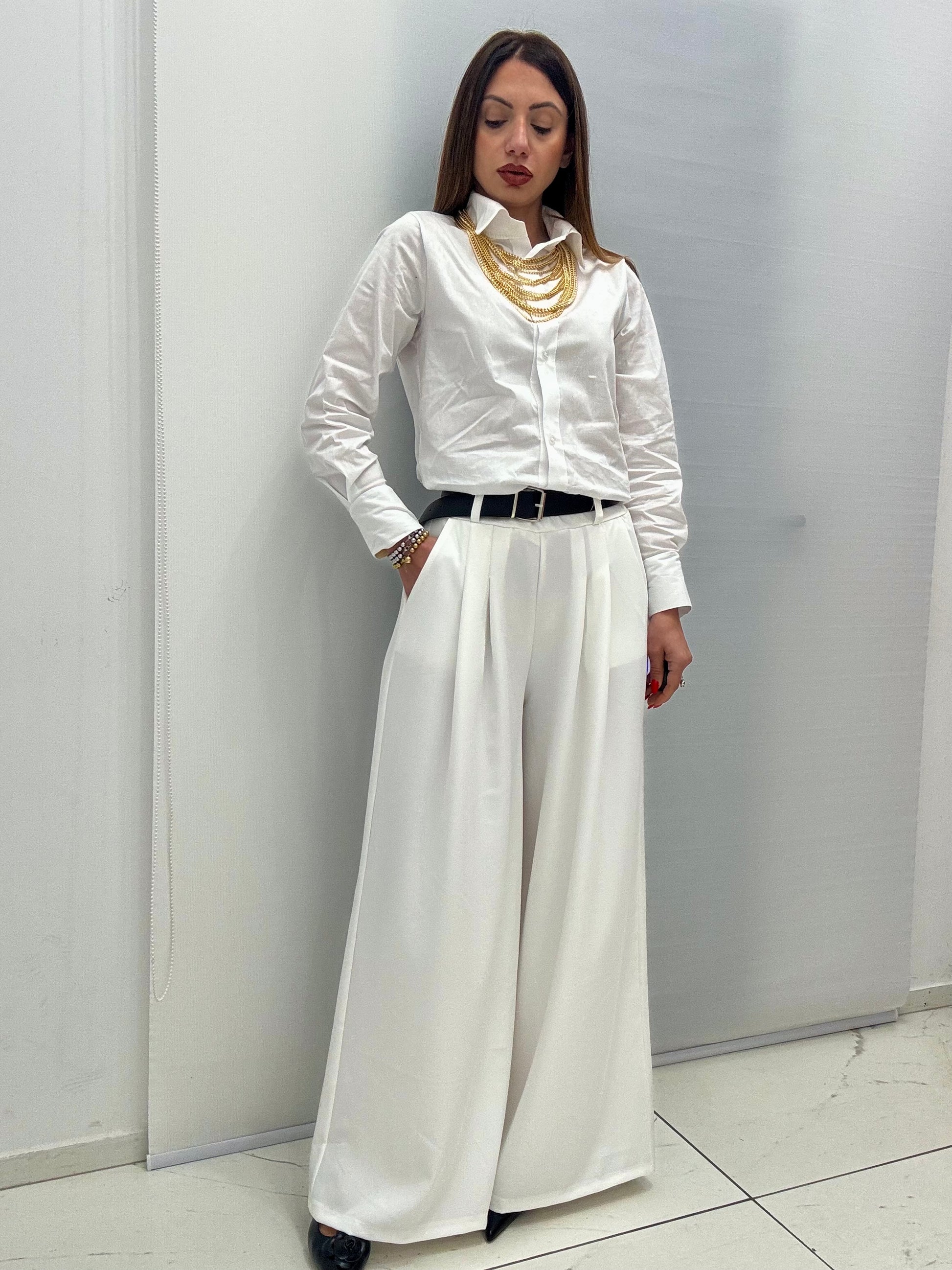 Pantalone palazzo con elastico in vita e tasche a filo lateralmente, cintura inclusa. Taglia unica, consigliato fino a taglia 46.