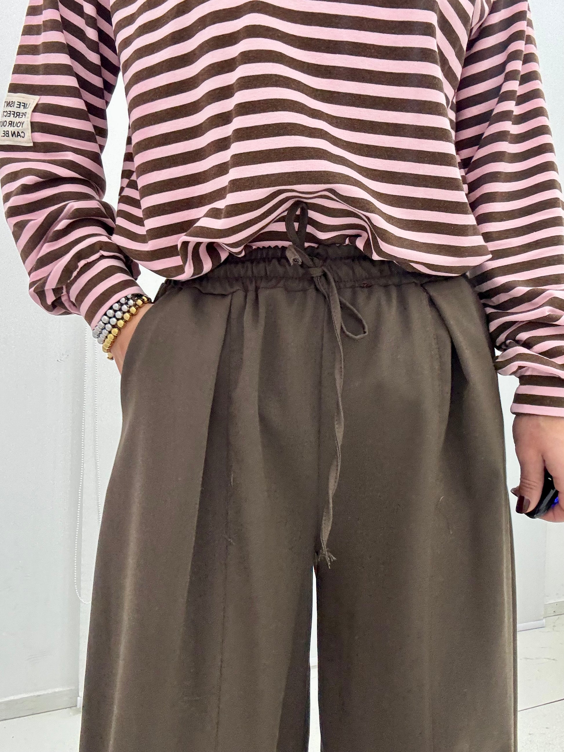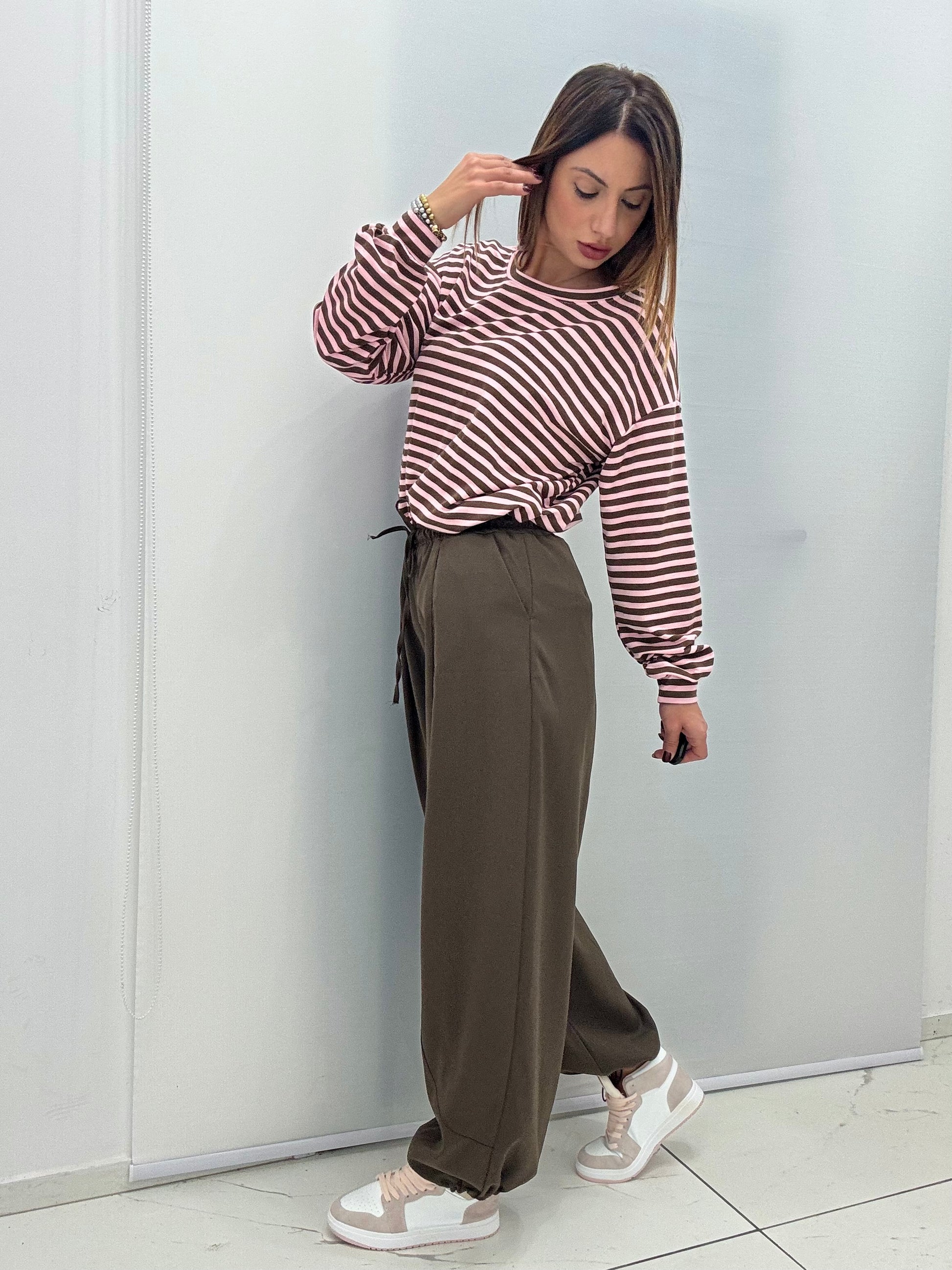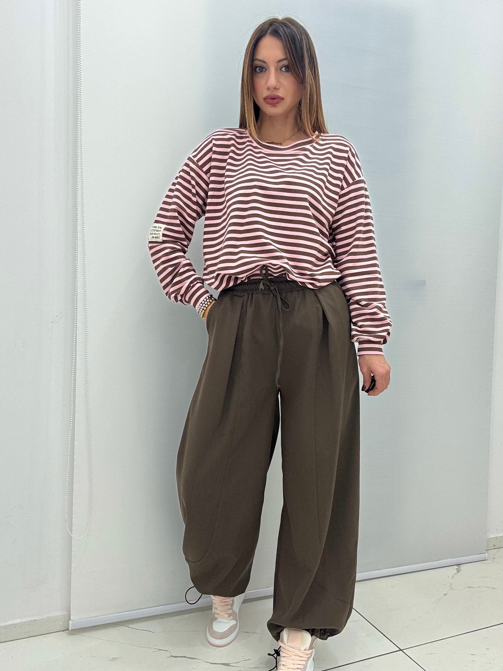 Pantatuta con elastico e coulisse in vita, coulisse a caviglia che consentono di indossarlo sia ballon che palazzo. Taglia unica, consigliamo fino a taglia 46.