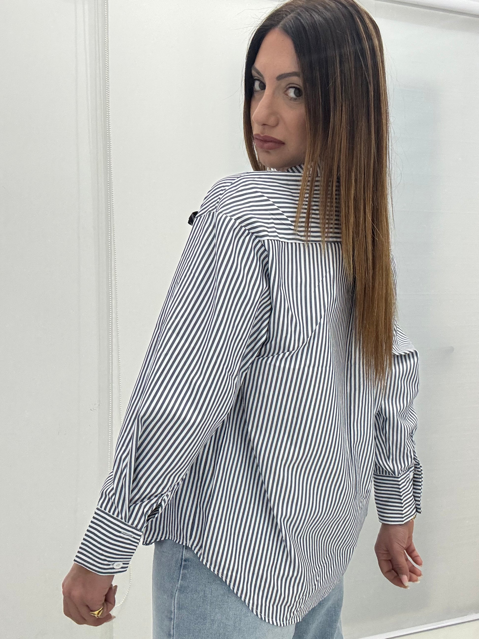 Camicia in cotone, vestibilità morbida, a righe con doppio fiocco applicato sul davanti. Disponibile in taglia SM ed LXL.