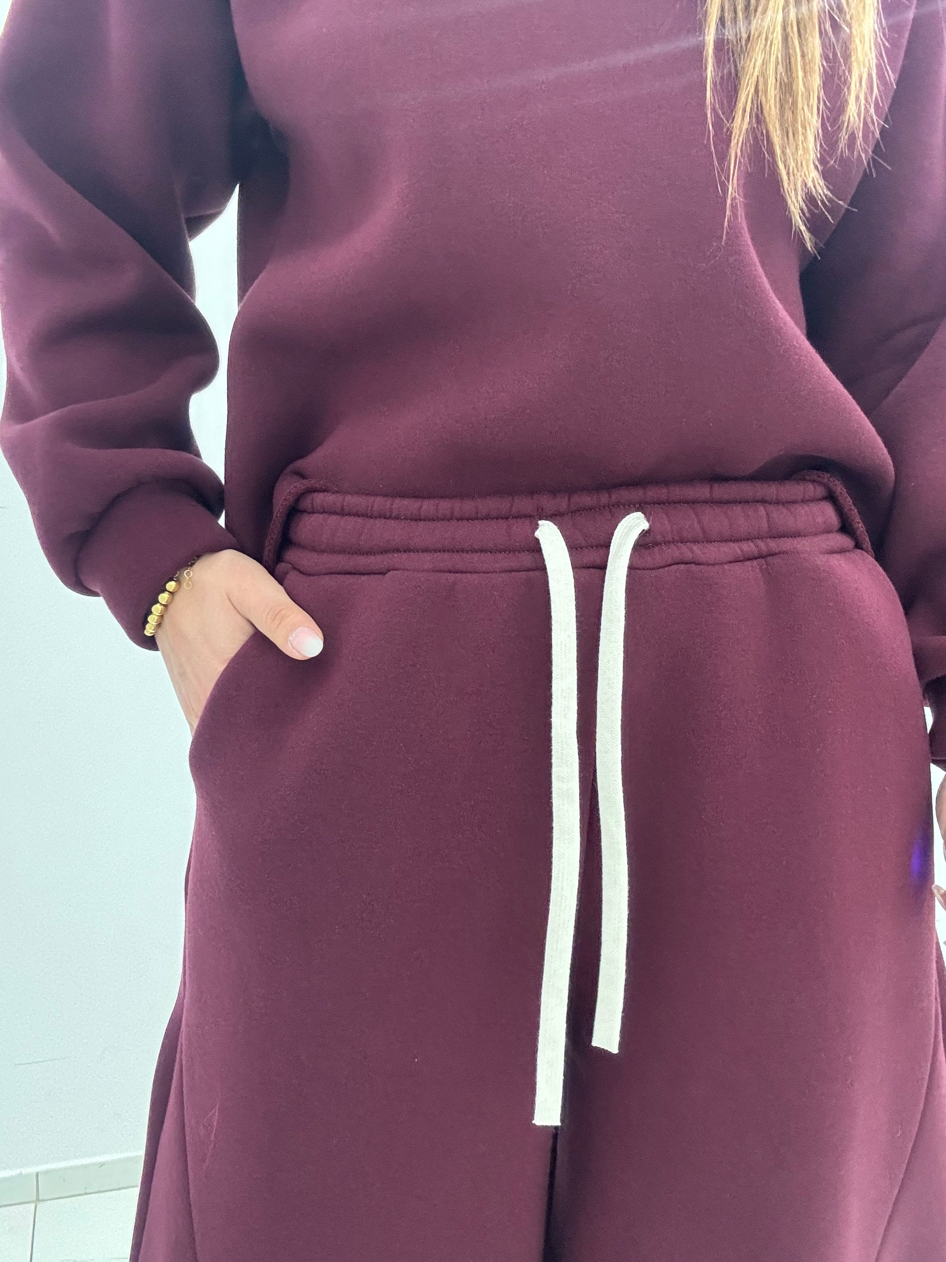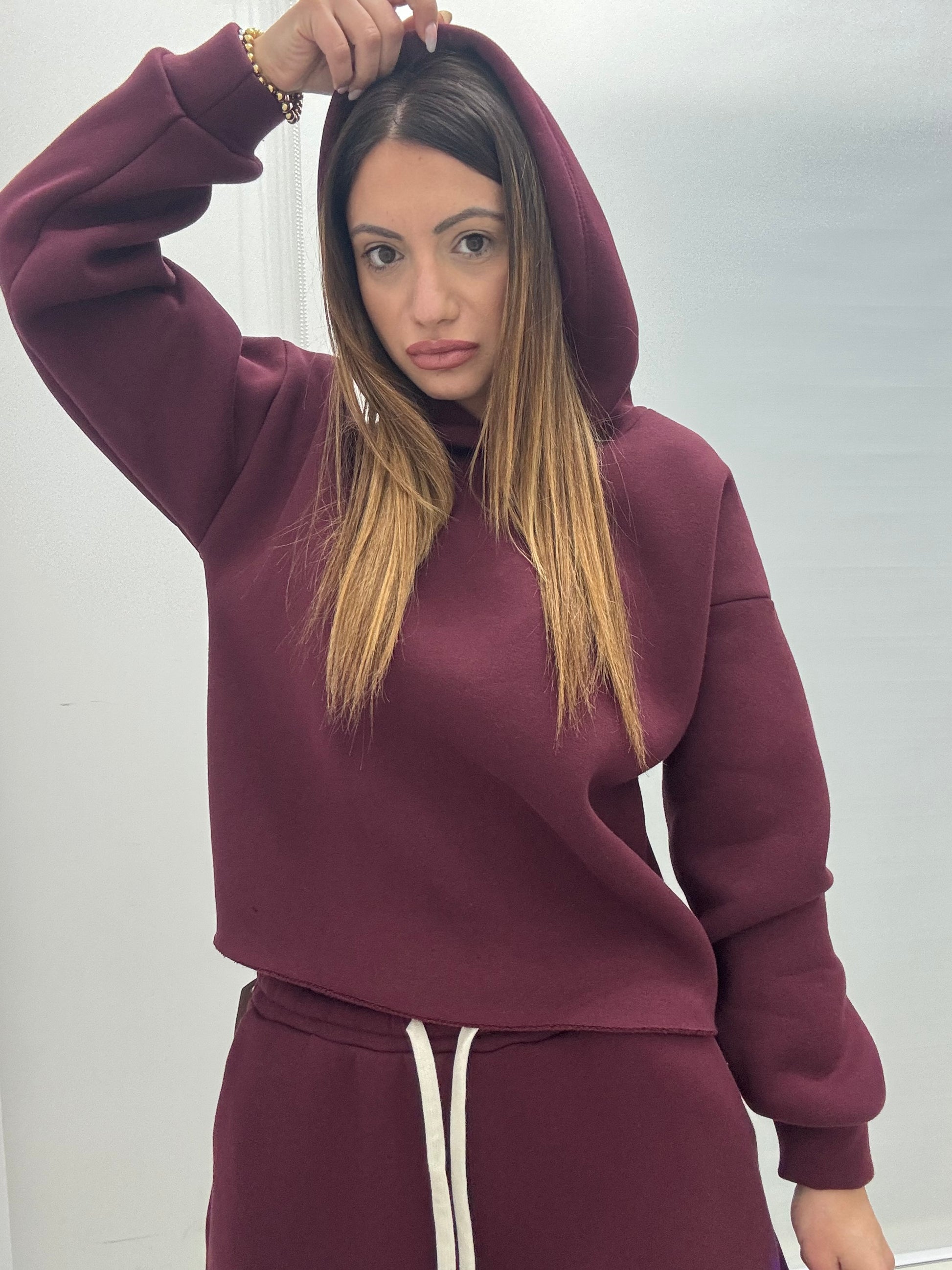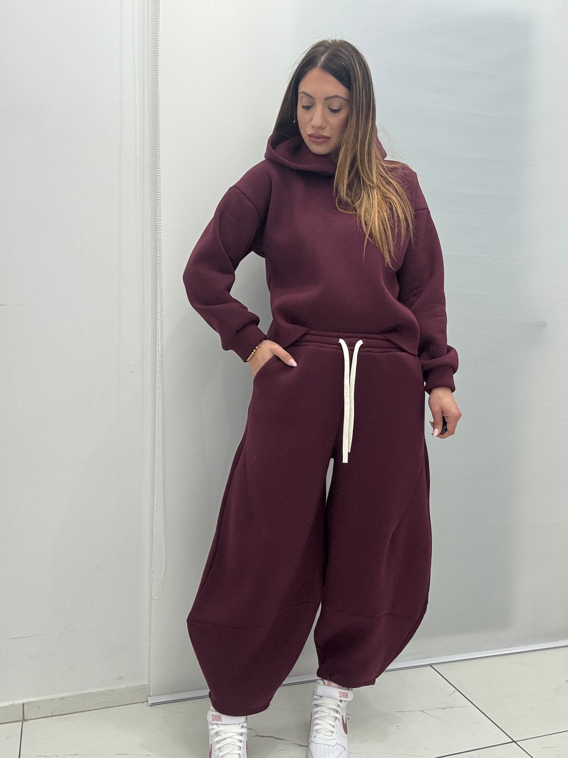 Tuta felpata composta da felpa con cappuccio e taglio vivo sul fondo e pantalone ballon con elastico one coulisse in vita, taglia unica, consigliato fino a taglia XL.