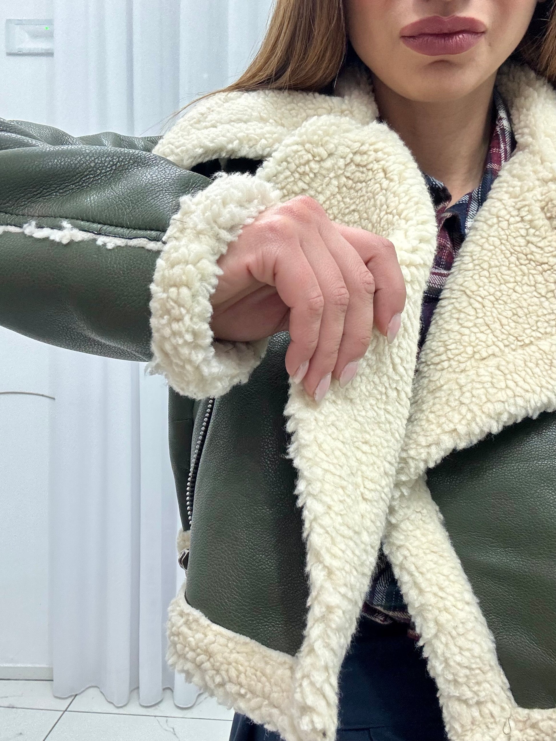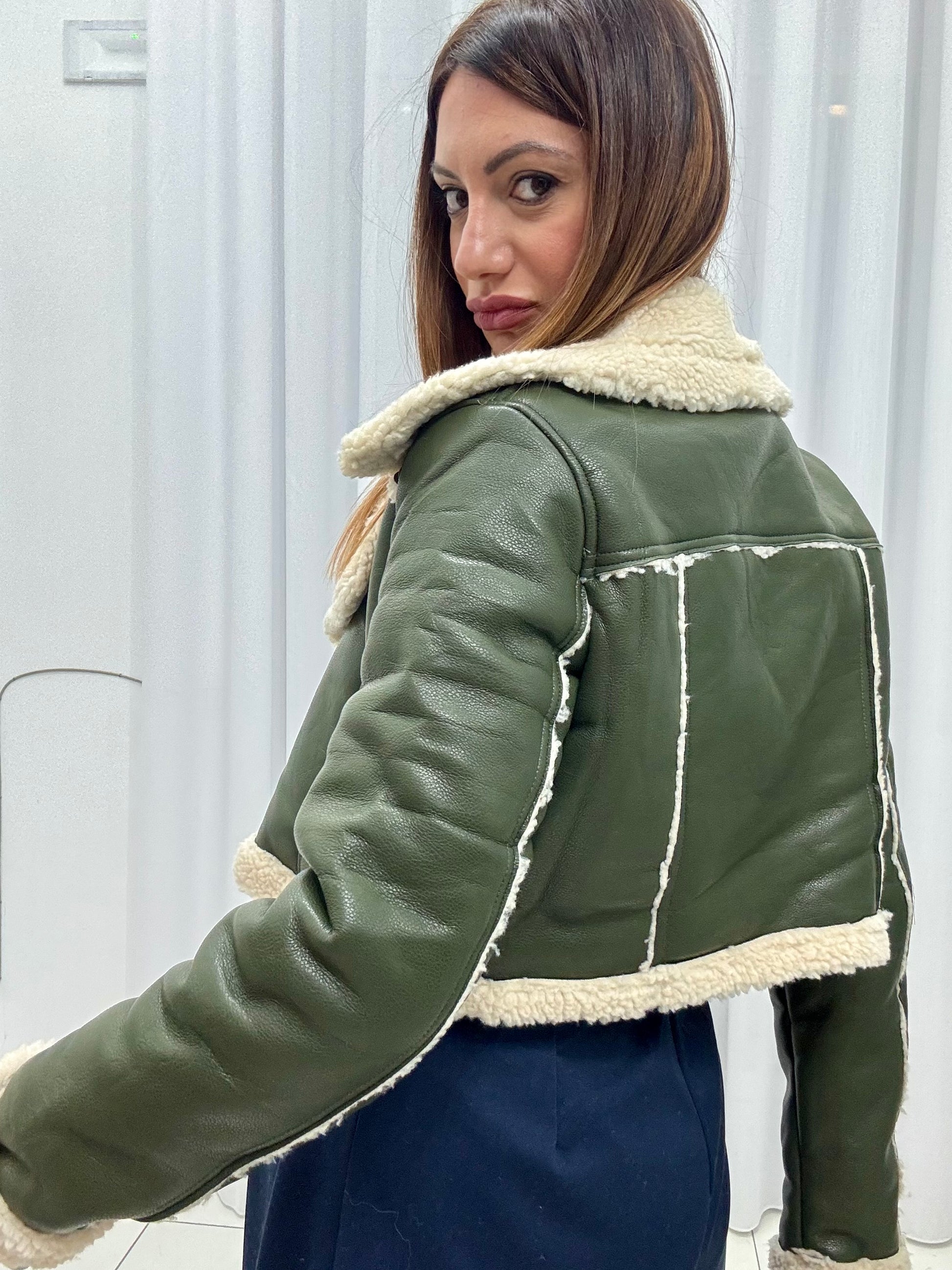 Montone in ecopelle con pelliccia interna. Zip sul davanti, tasche a filo laterali. Disponibile da taglia S ad XL, vestibilità regolare