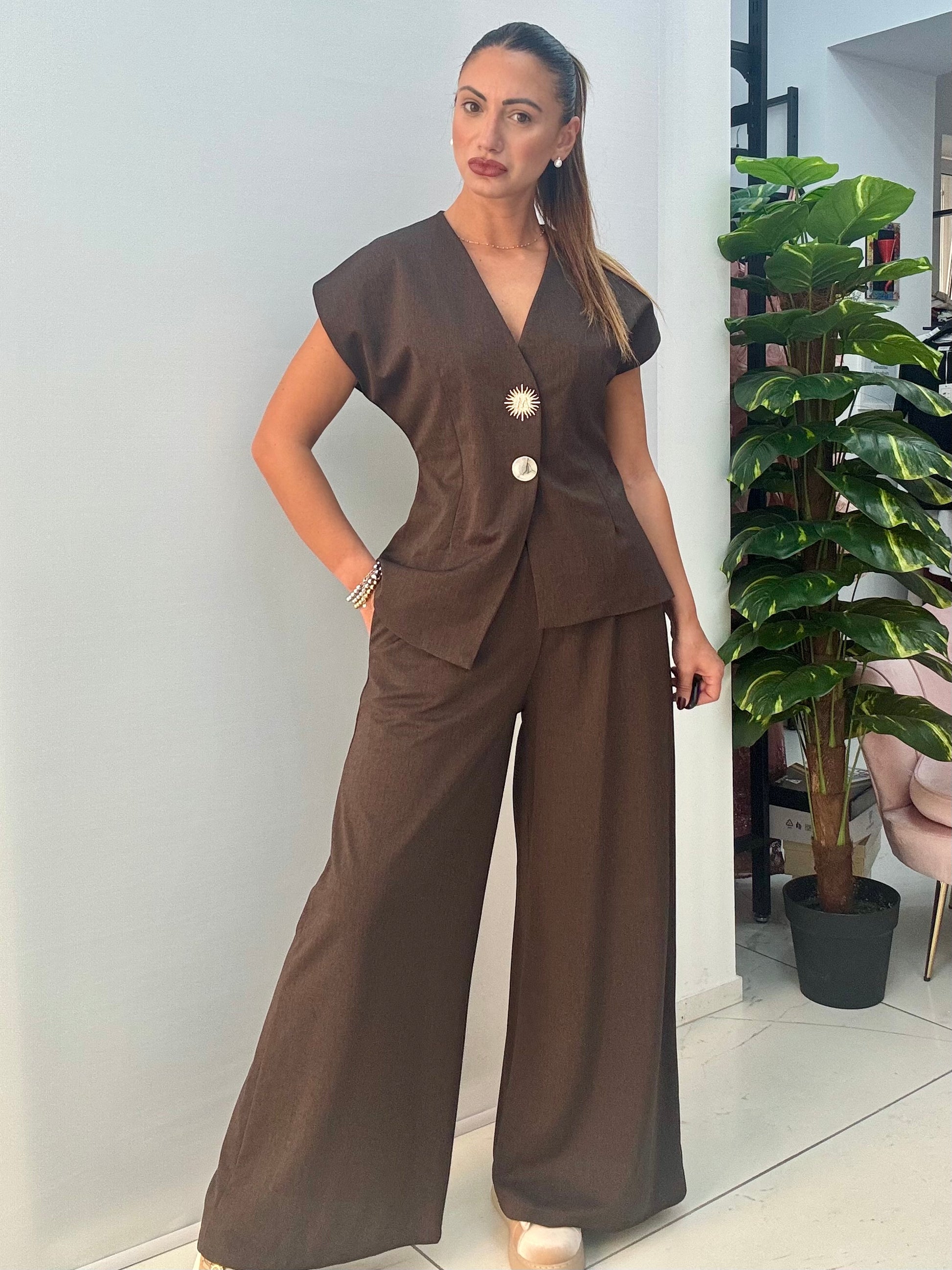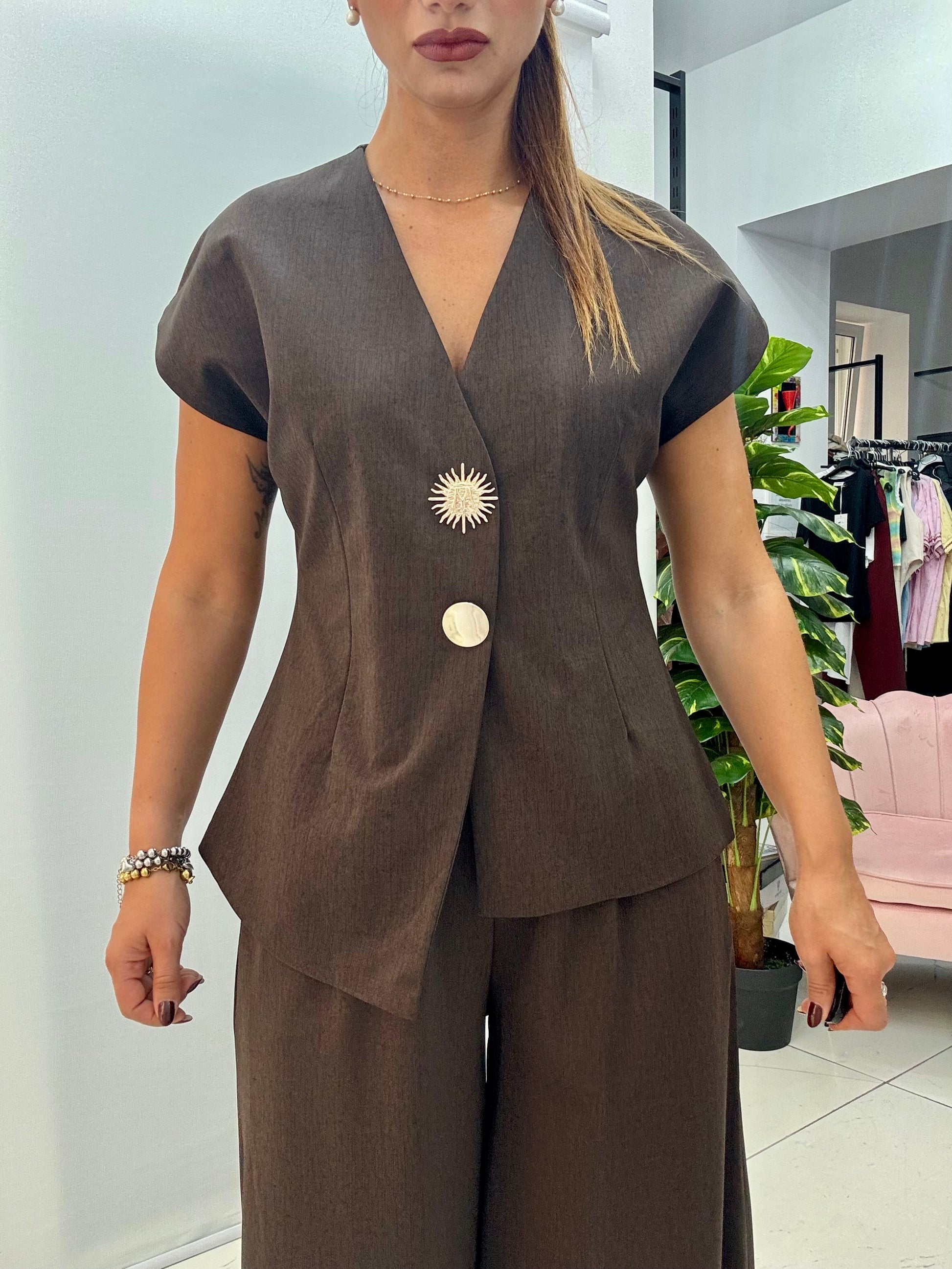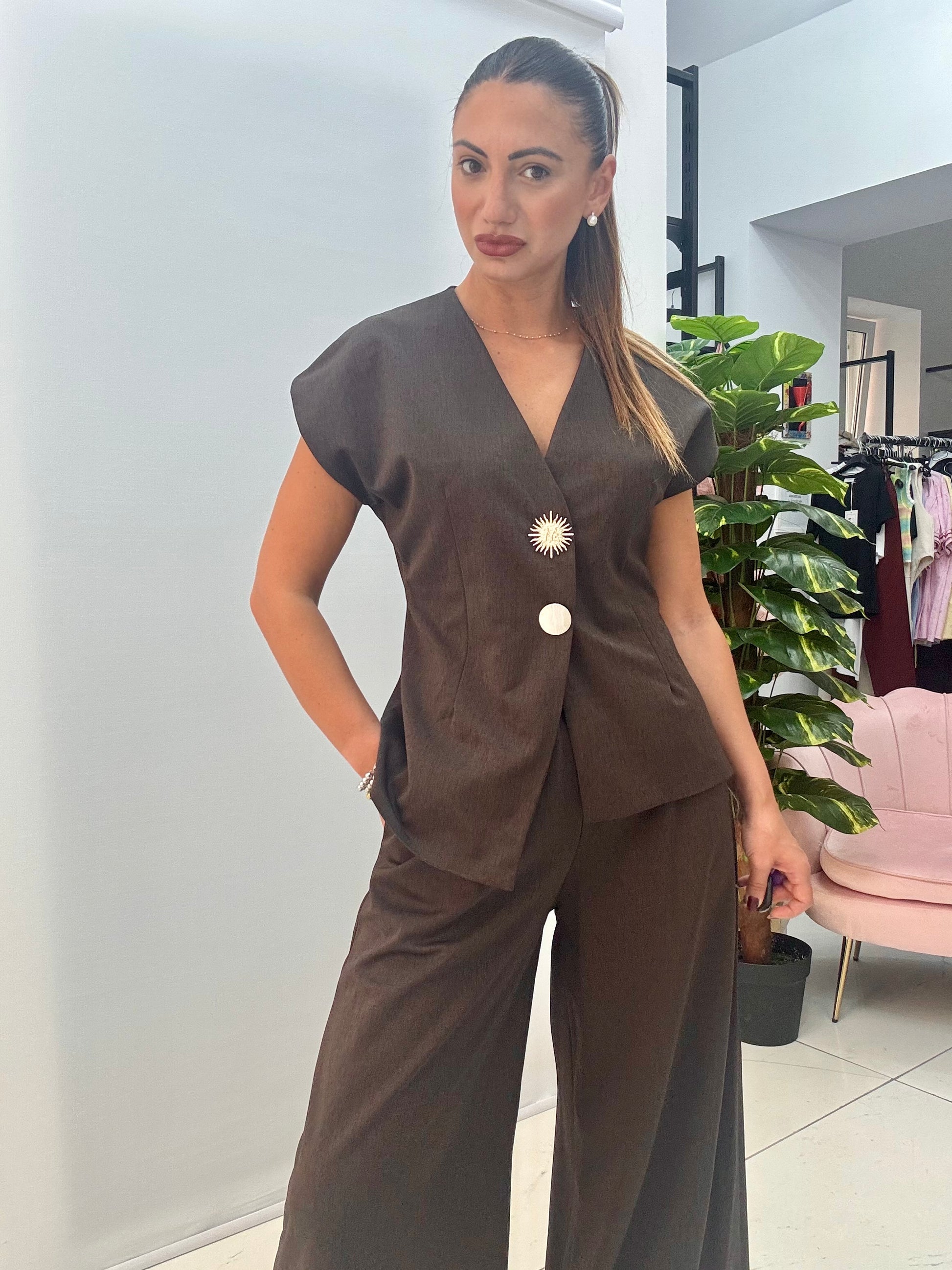 Set composto da gilet asimmetrico con bottoni gioiello, quello a mo di sole è una spilla, pantalone con elastico in vita, taglia unica, consigliamo dini a taglia 44-46.