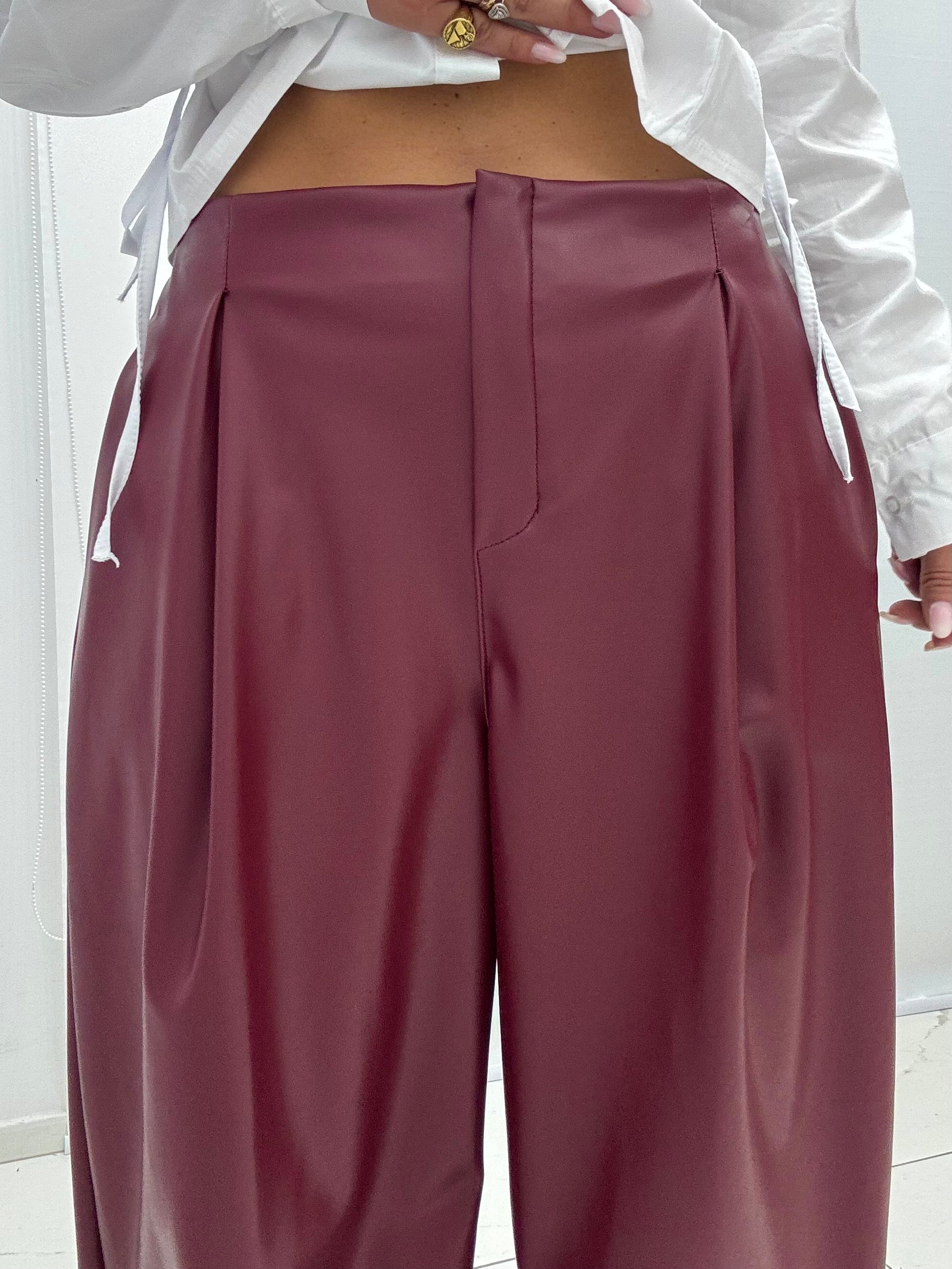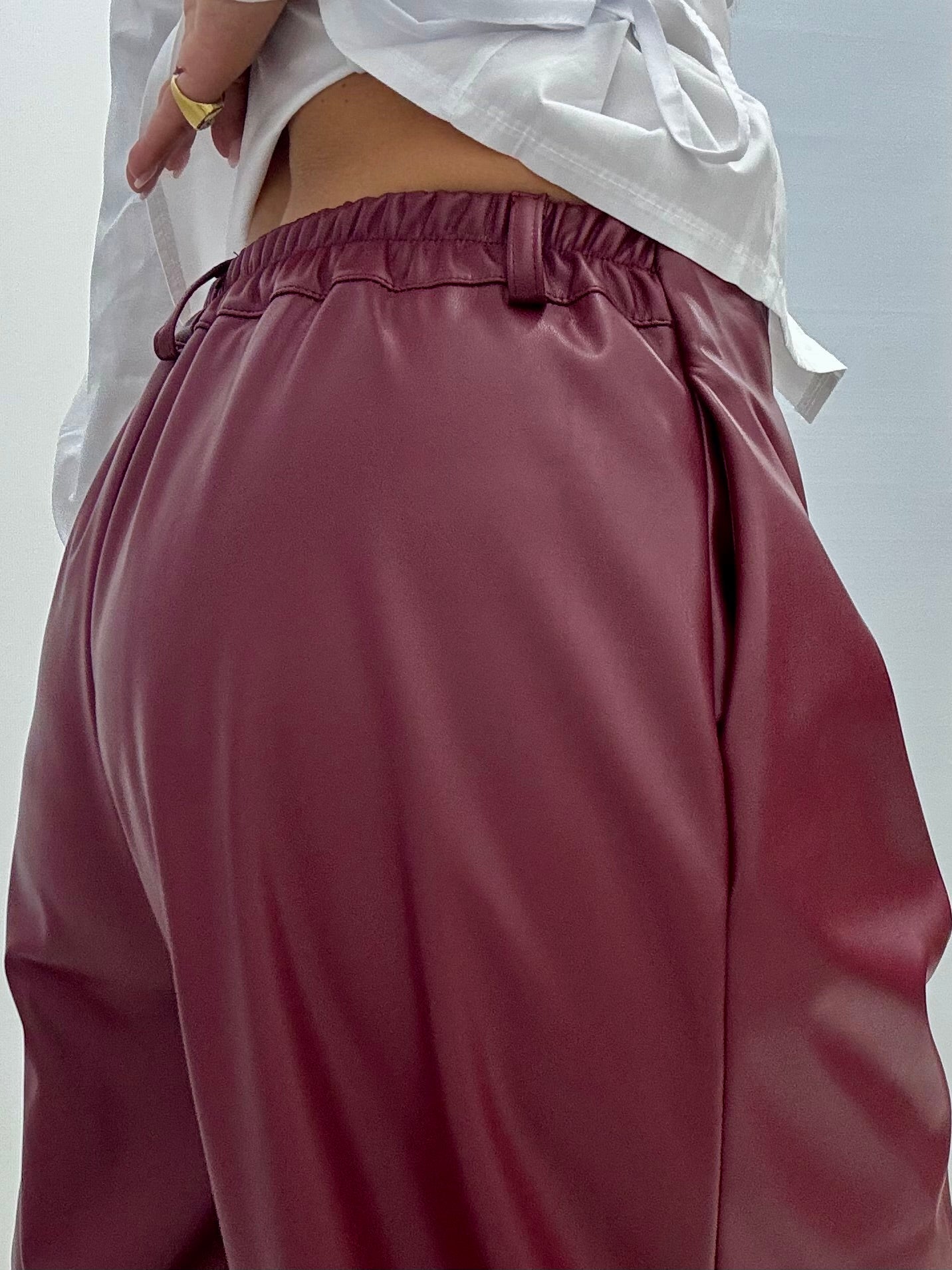 Set in ecopelle, composto da giacchino crop foderato con elastici ai polsi e nel giro vita, pantalone modello ballon con elastico sul reatro ed a caviglia, zip a scomparsa sul davanti. Taglia unica, consigliamo fino a tagli 46.