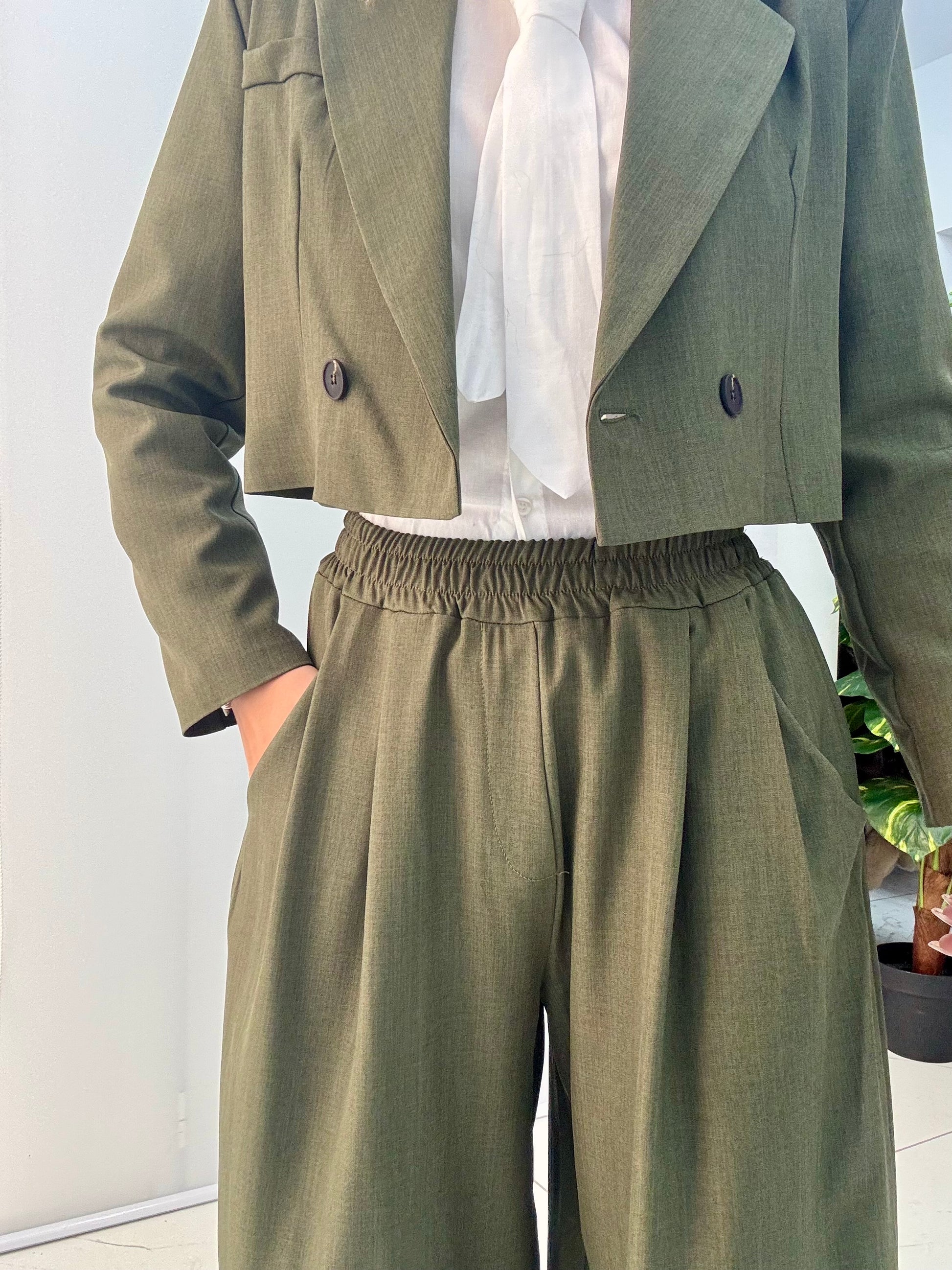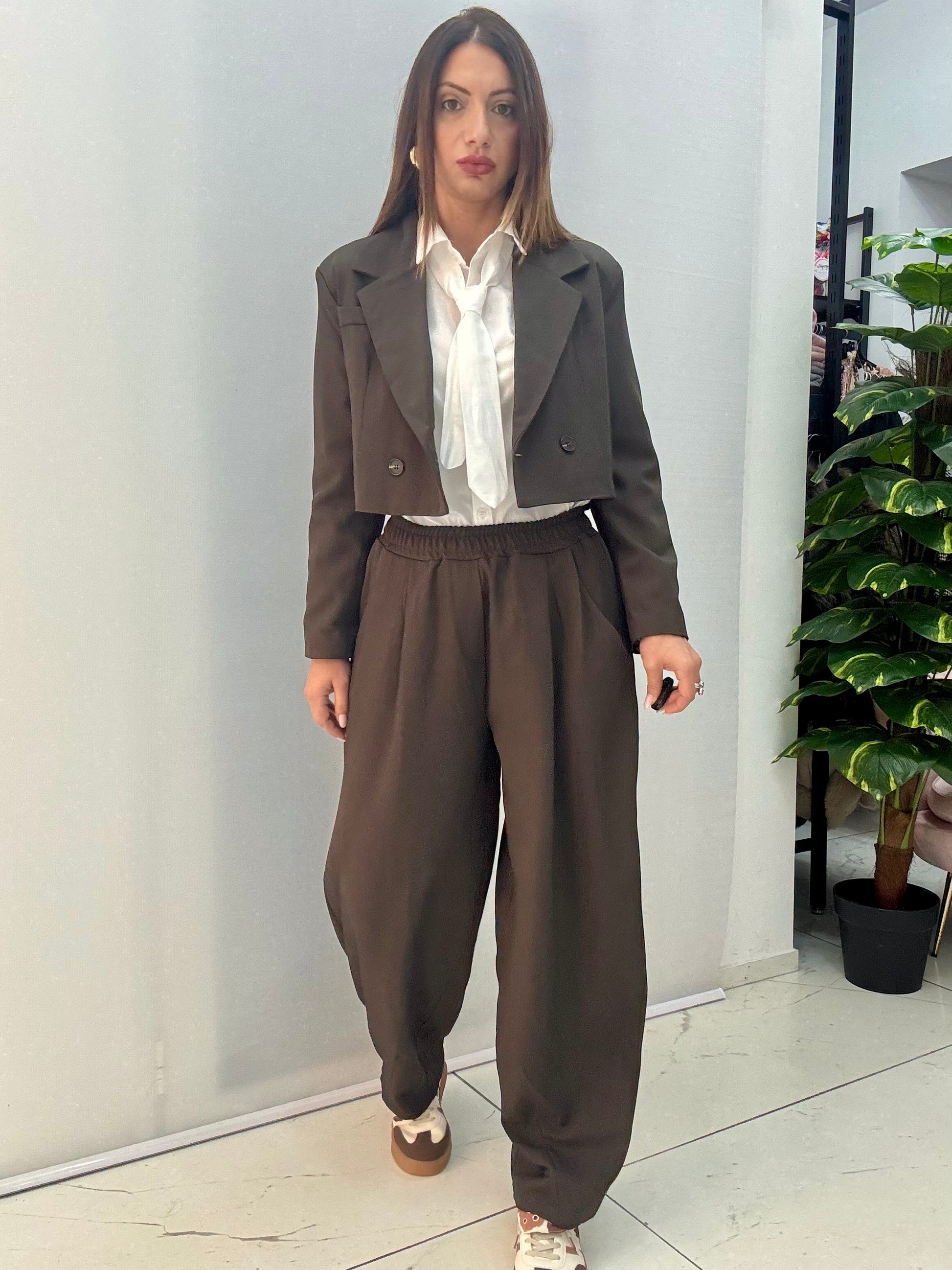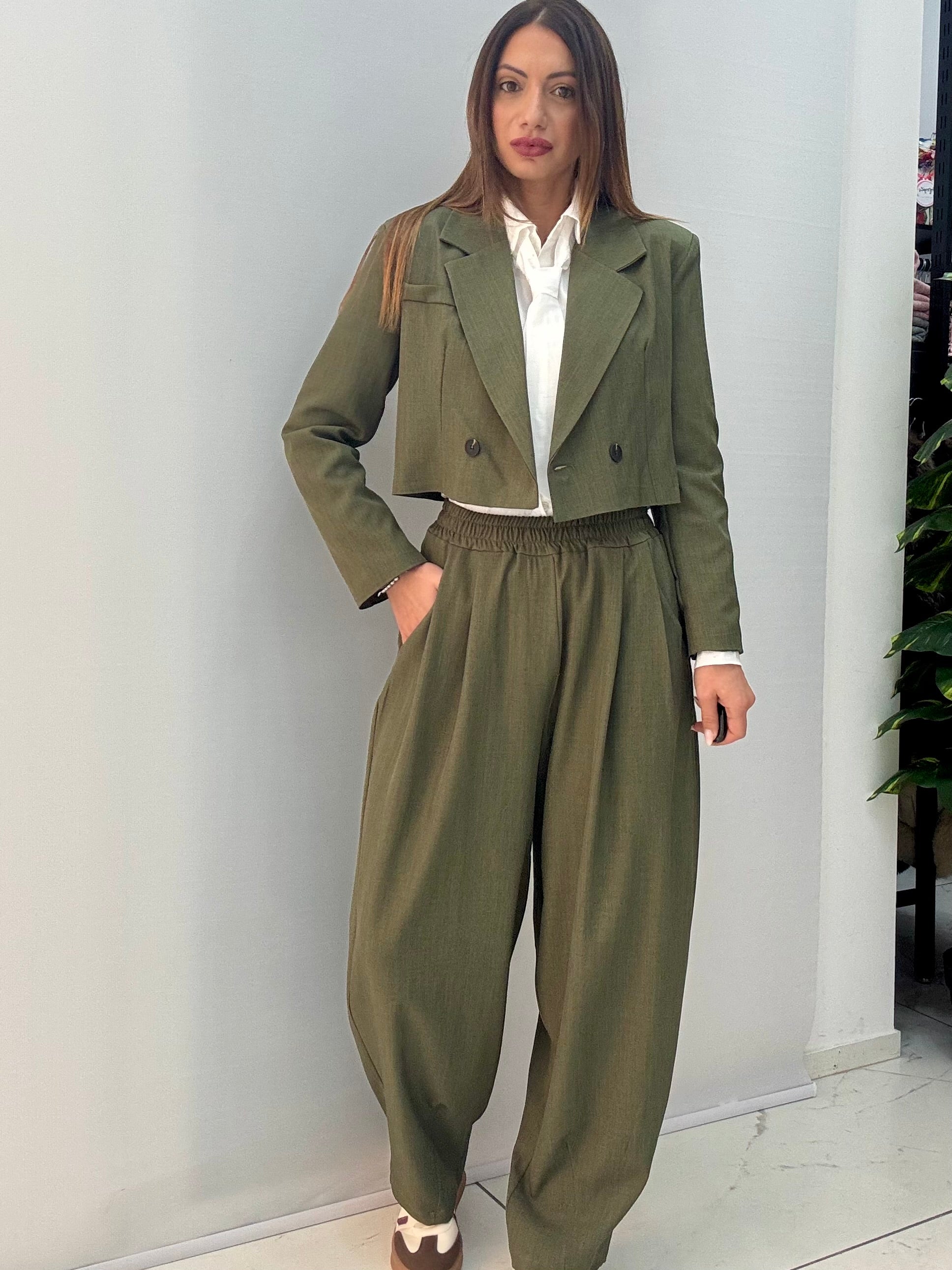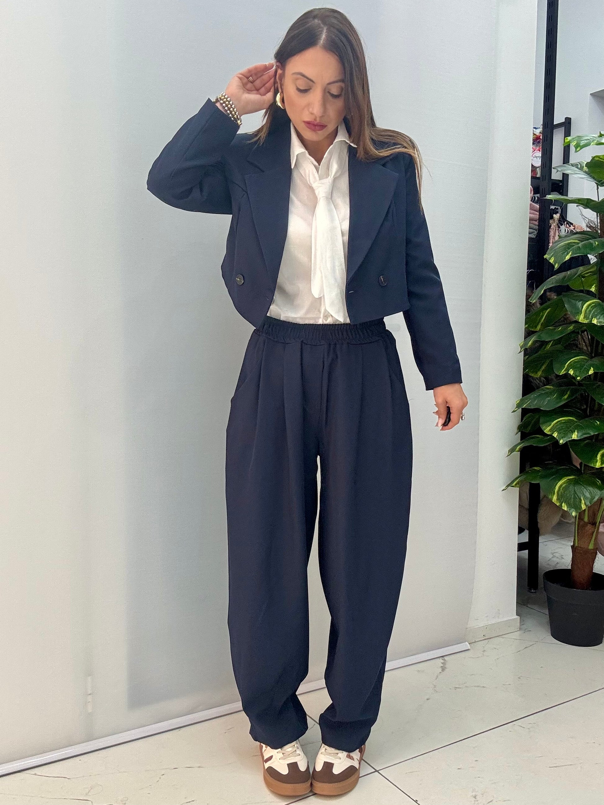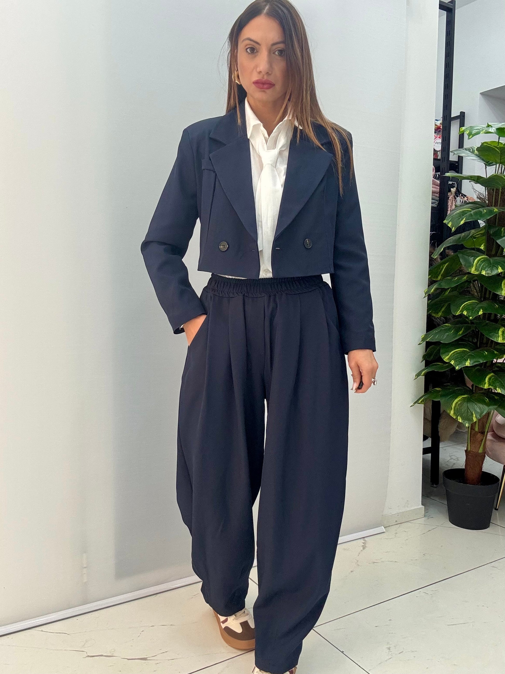 Tailleur composto da giacca doppiopetto con spalle strutturate e foderata. Pantalone modello ballon con elastico in vita. Taglia unica, consigliamo fino a taglia 46.