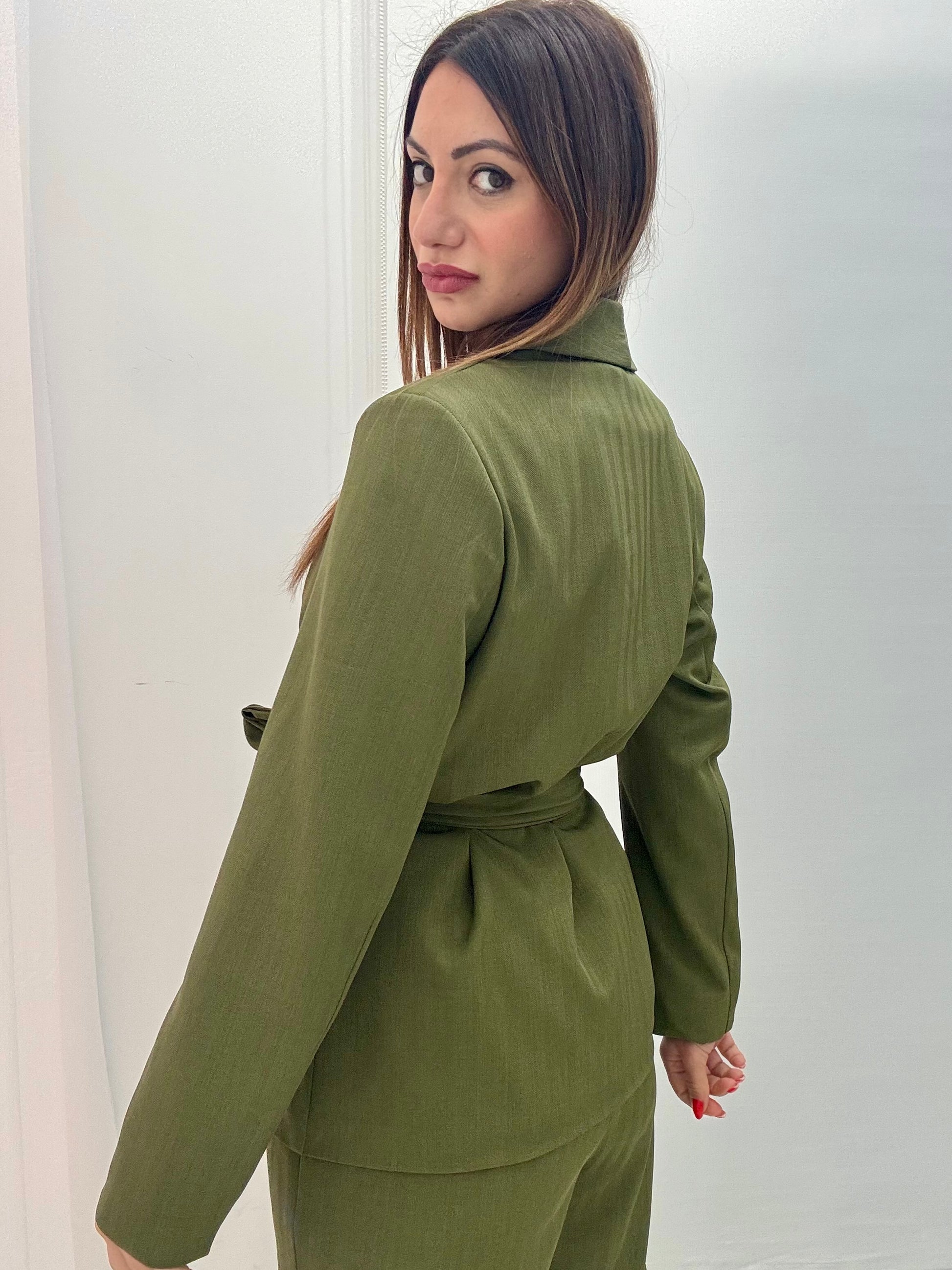 Tailleur in tessuto spigato tono su tono, composta da giacca con collo sciallato, unico bottone sul davanti, spalla strutturata, tasche finte a patta, pantalone con elastico e finta coulisse in vita. Taglia unica, consigliato fino a taglia XL. Versatile, perfetto per ricreare si look sportivi che eleganti.