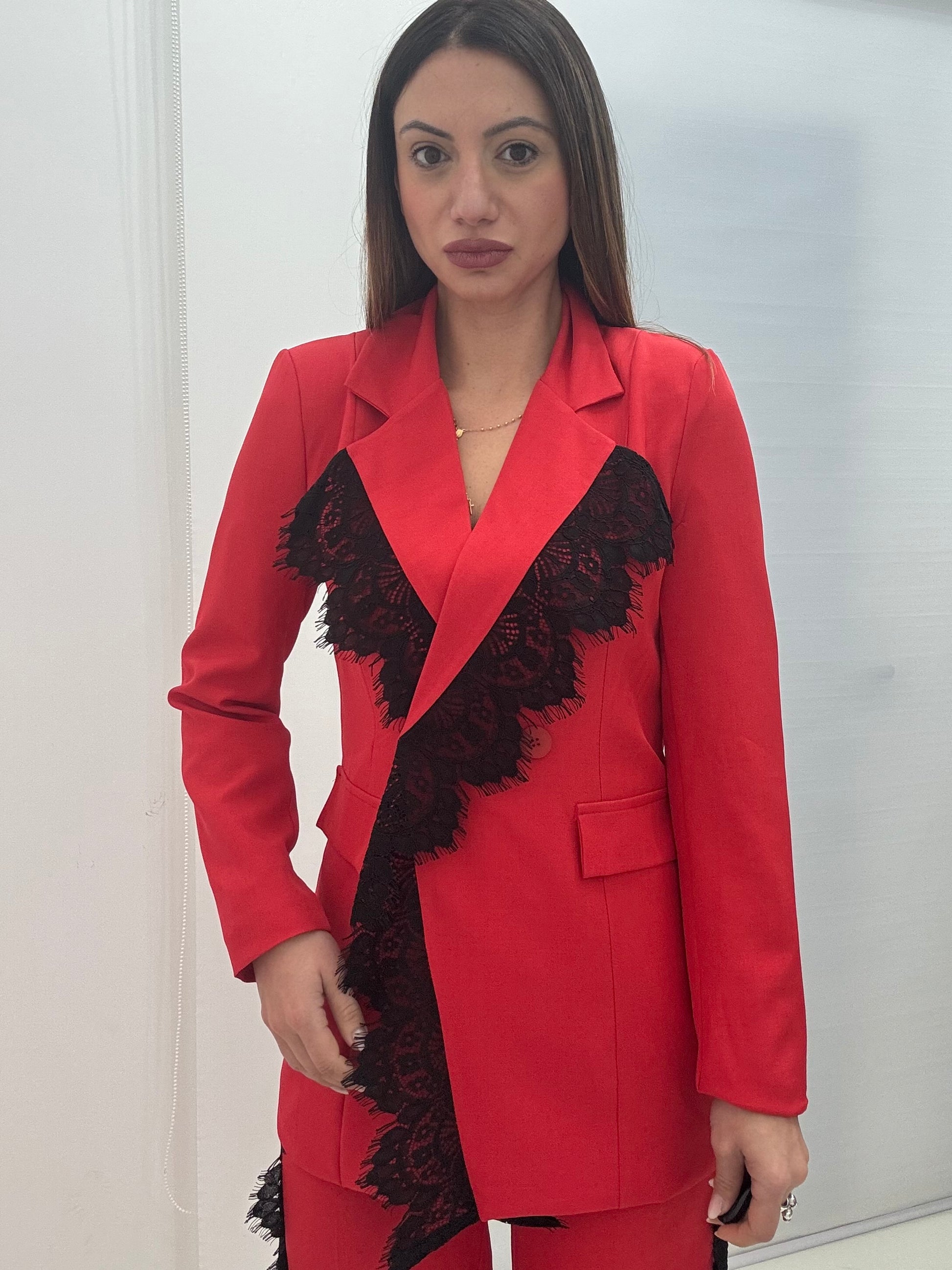 Tailleur composto da giacca doppio petto con tasche finte a patta, arricchita con fascia ricamata lungo i bordi. Pantalone palazzo con zip e bottone sul davanti el elastico sul retro, fascia in pizzo lungo le gambe. Taglia unica, consigliato fino a taglia 44.