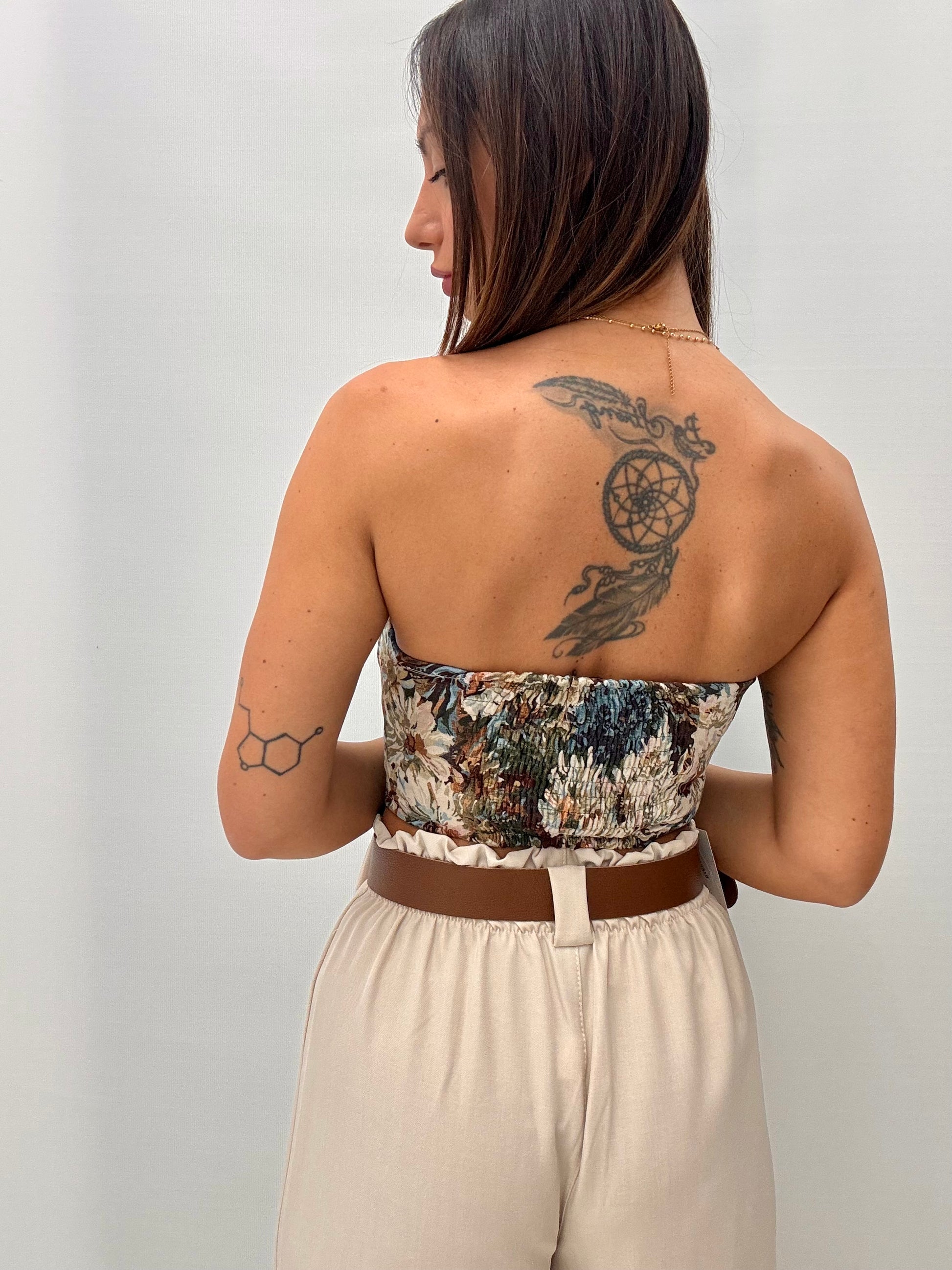 Top in effetto suede con coppe preformate e bordini ricamati. Elastico a nido d’ape sul retro. Taglia unica, consigliamo fino a taglia 44-46.