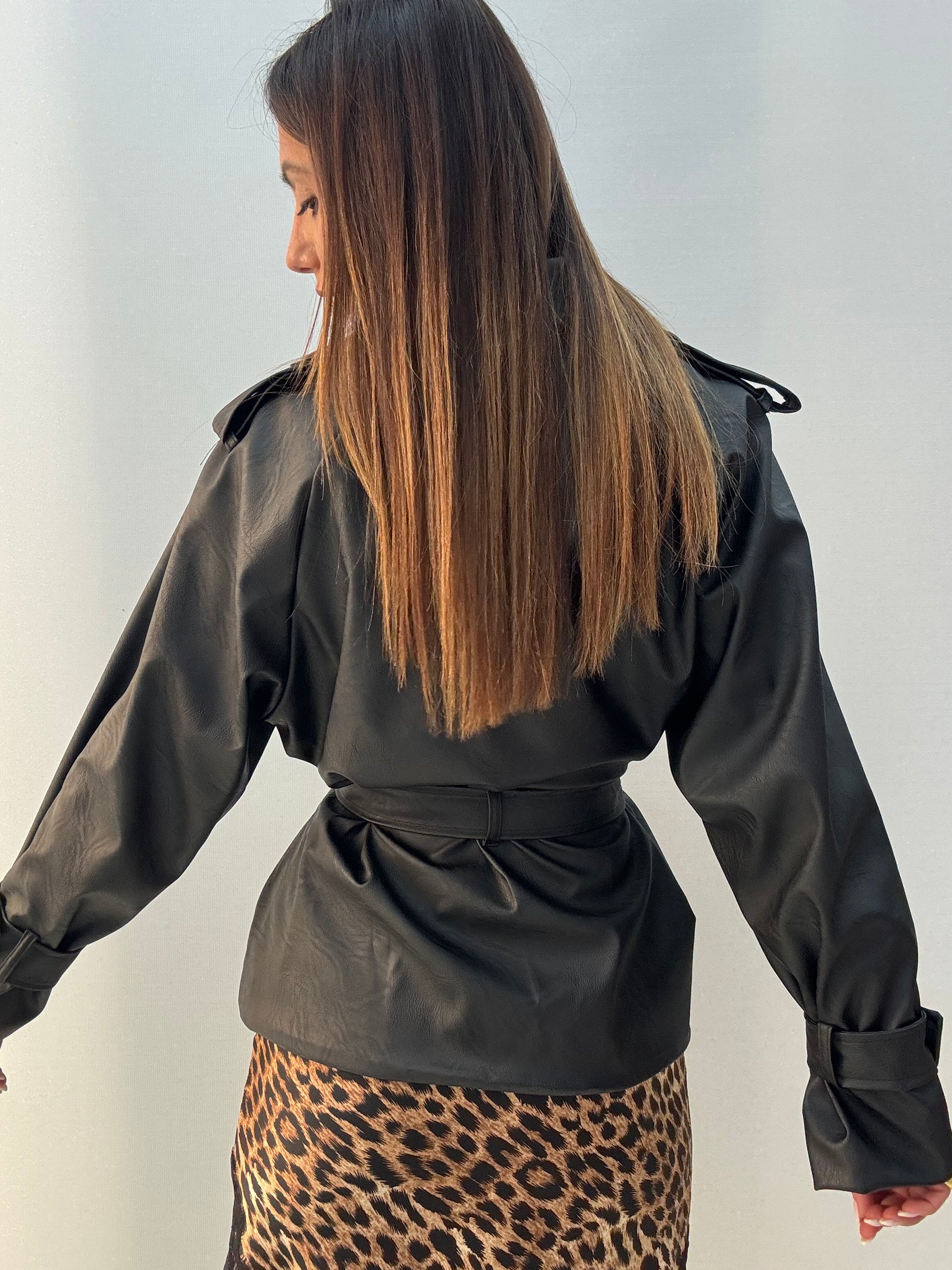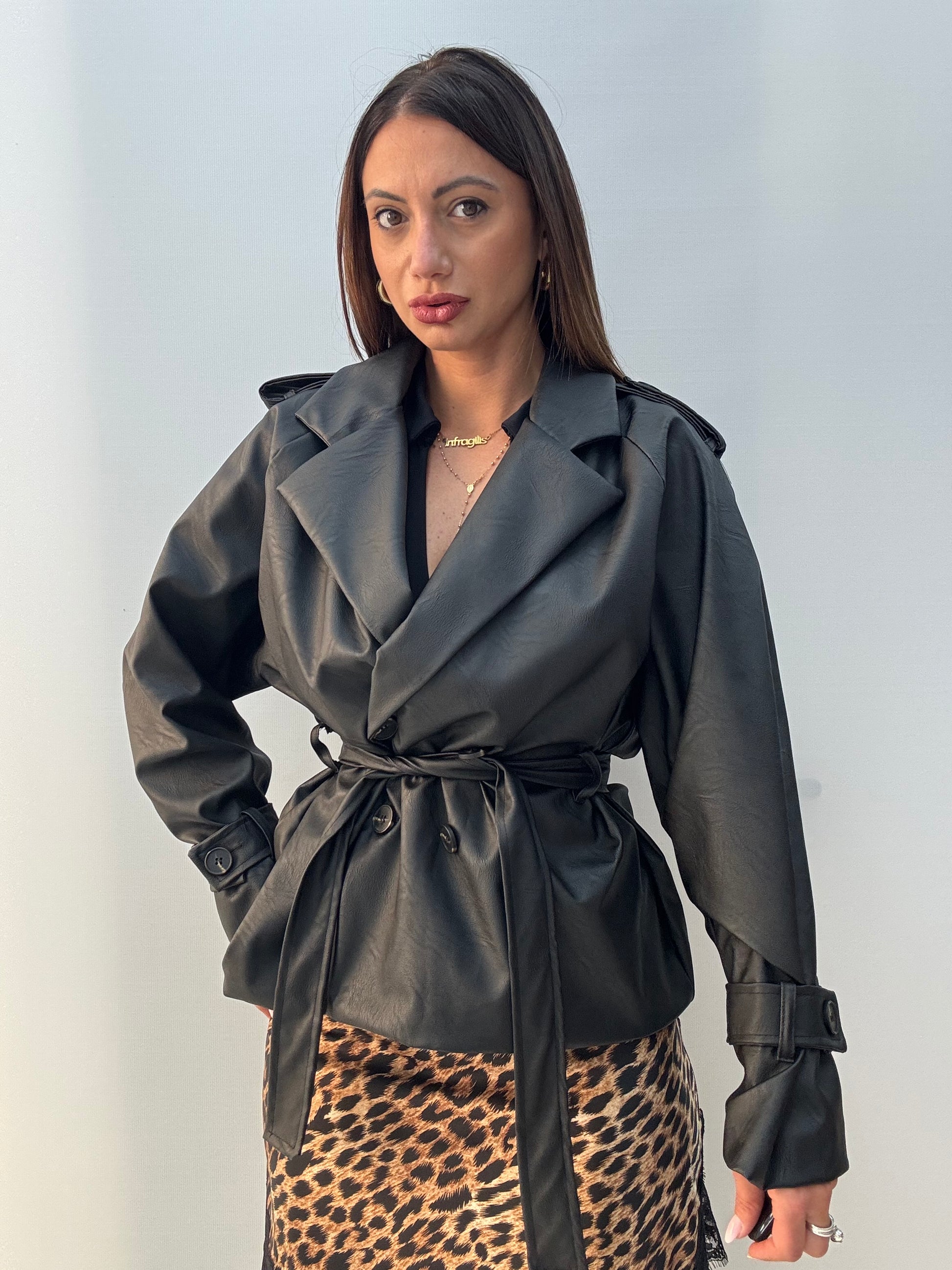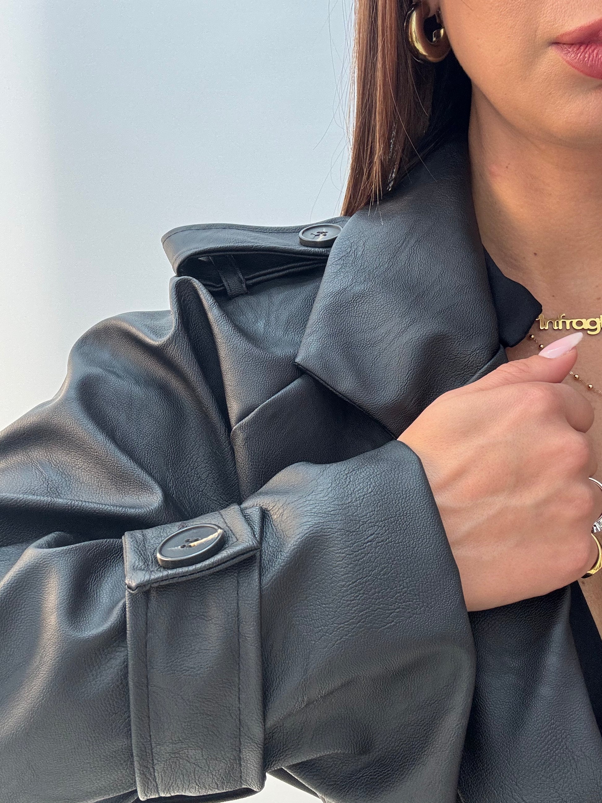 Trench in ecopelle, abbottonatura doppio petto, dettaglio sulle spalle e sulle maniche, foderato, cintura inclusa. Taglia unica, consigliamo fino a taglia 46.
