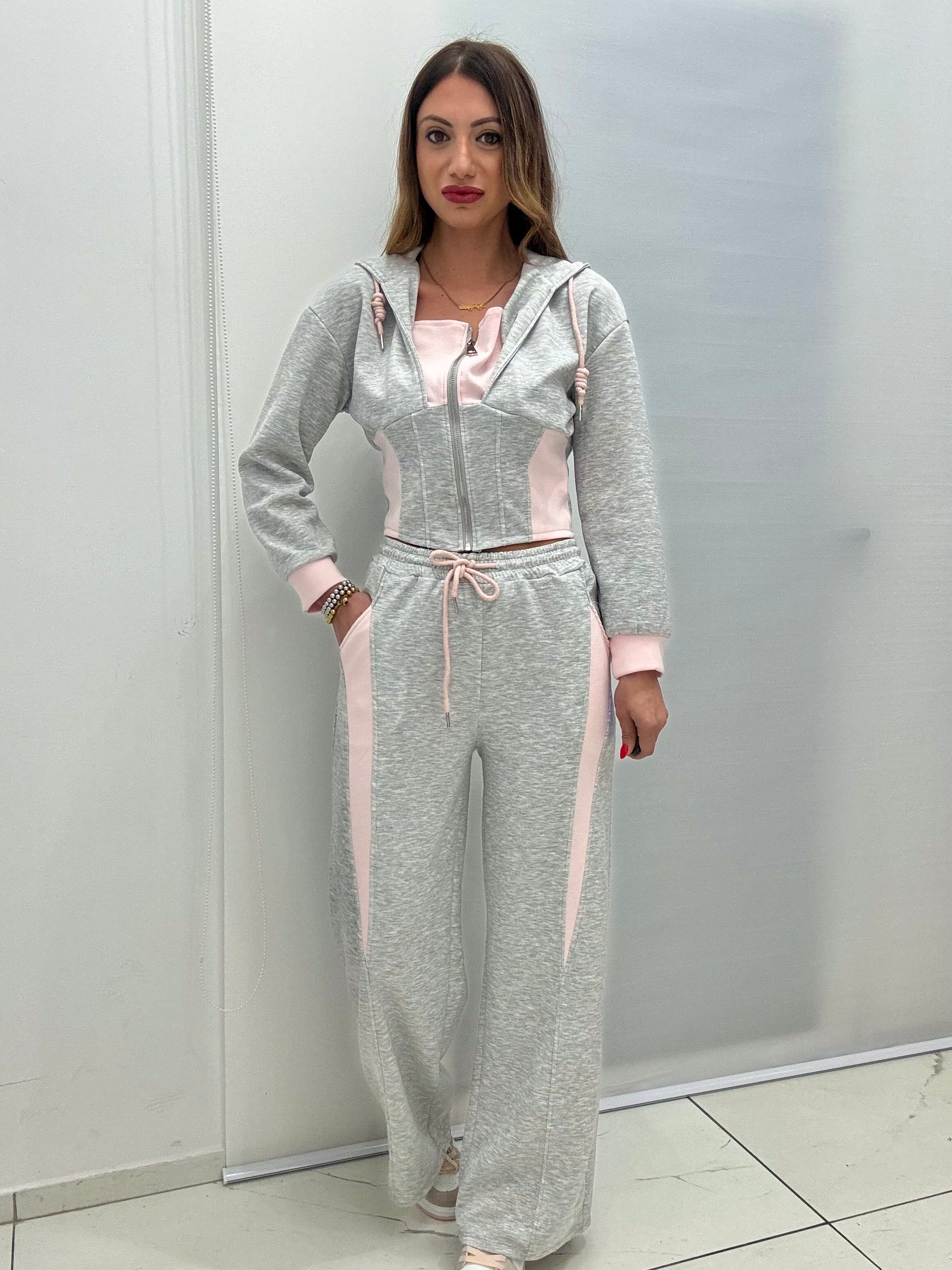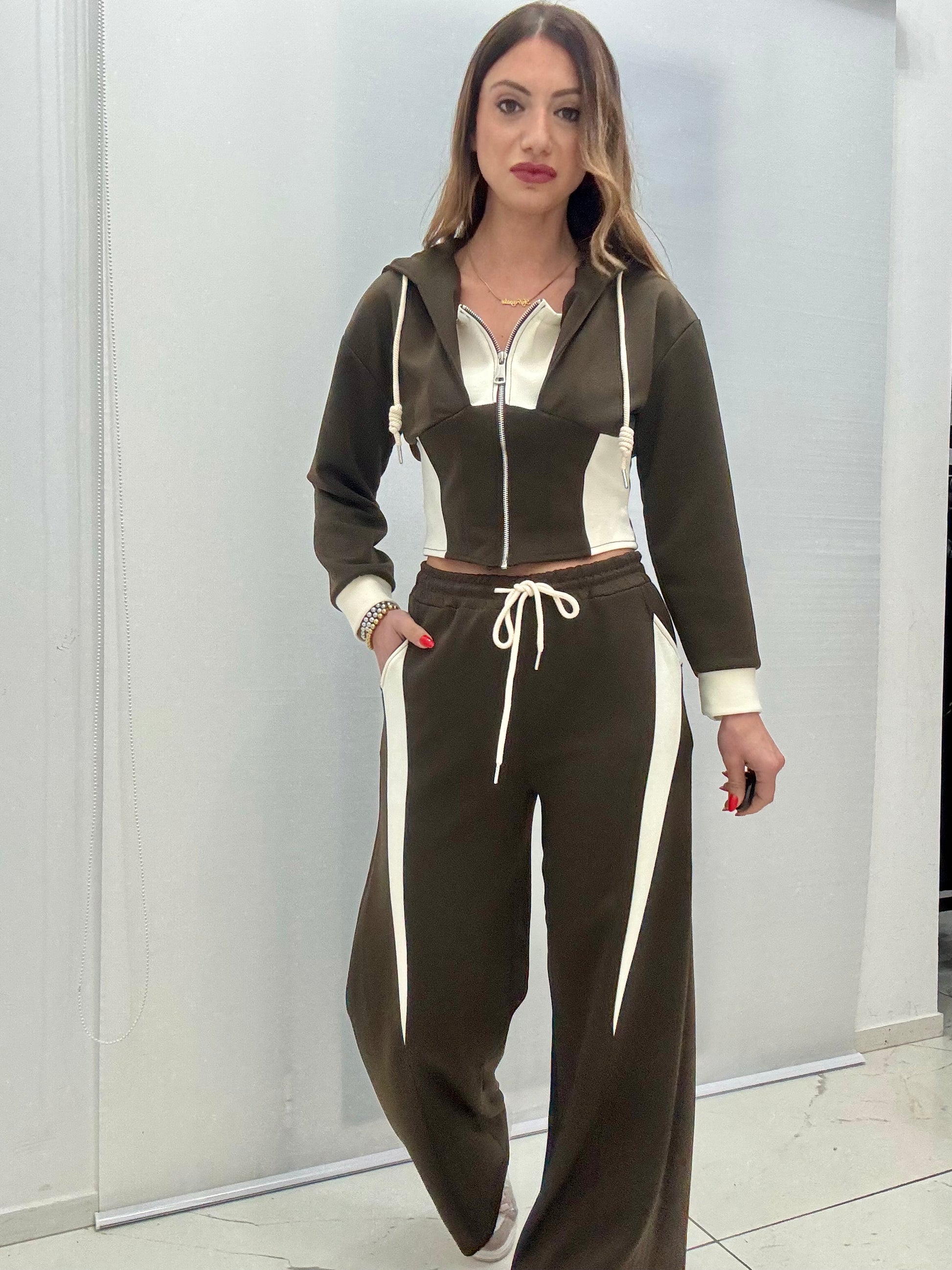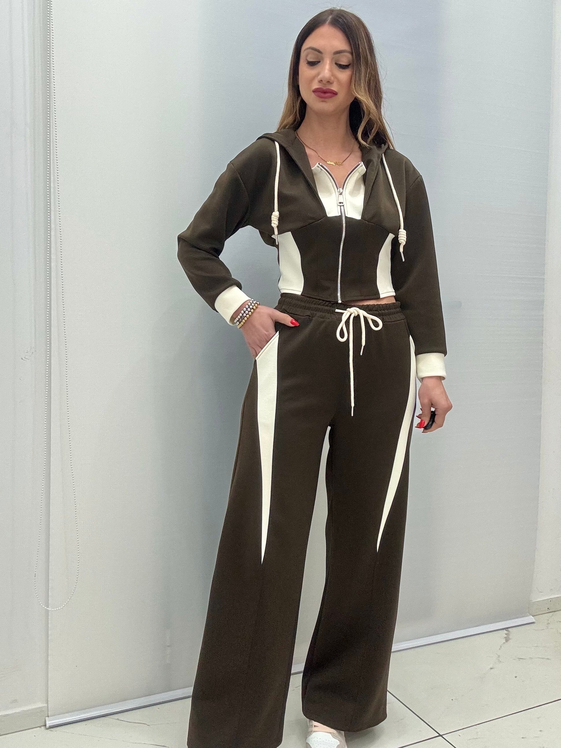 Tuta bicolore in.corone elastico, composta da felpa con zip sul davanti, cappuccio e pantalone palazzo, con tasche laterali ed elastico e coulisse in vita. Taglia unica, consigliato fino a taglia L