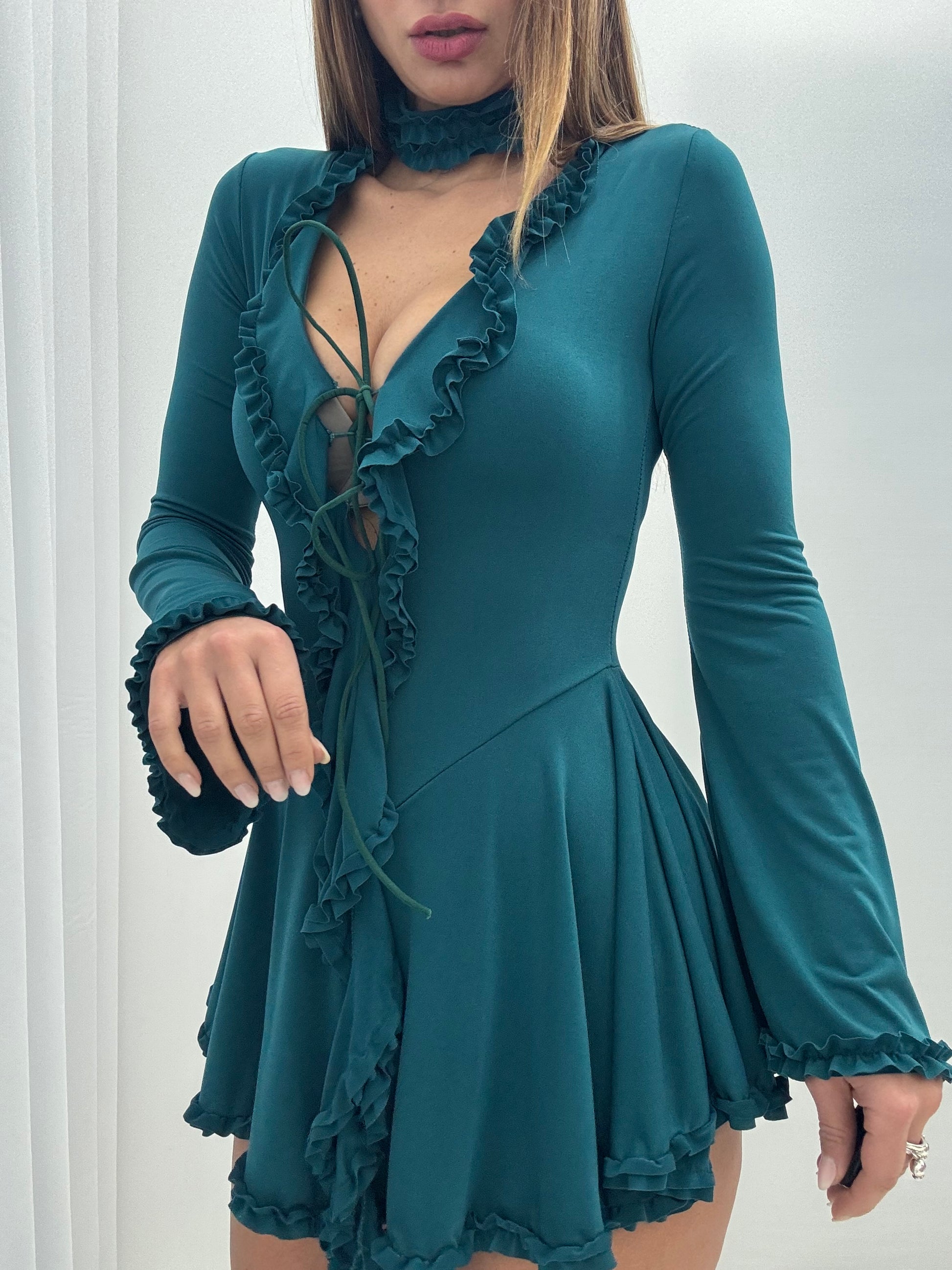Tutina in lycra con manica ad imbuto, scollo sul davanti regolabile con il suo fiocchetto, gonnellina ampia sopra con short sottostante. Chole al collo incluso. Taglia unica, consigliato fino a taglia 44.